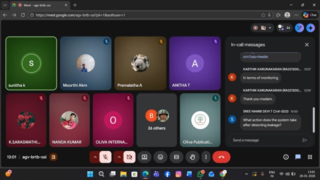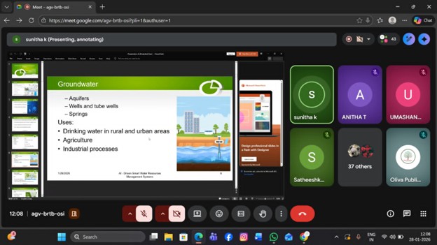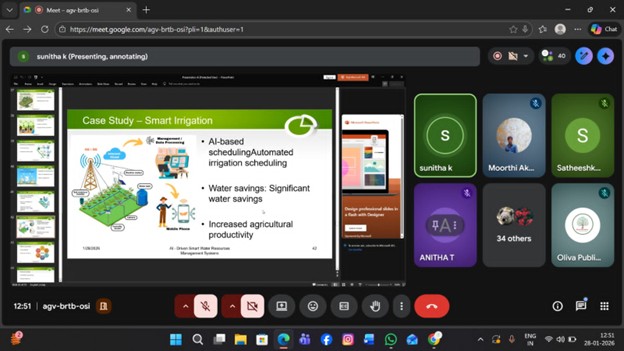 The Department of Agricultural Engineering, in collaboration with Oliva International Publication, organized a one-day Faculty Development Program (FDP) on ‘AI-Driven Smart Water Resources Management Systems’ on January 28th, 2026, conducted online via the Google Meet platform. The event brought together faculty members, researchers, and participants from various institutions, focusing on the application of artificial intelligence (AI) in water resource management.