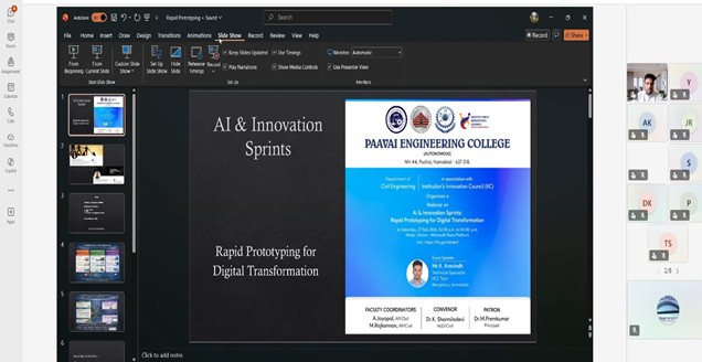 A webinar titled “AI & Innovation Sprints: Rapid Prototyping for Digital Transformation” was organized by the Department of Civil Engineering in association with the Institution’s Innovation Council (IIC), Paavai Engineering College (Autonomous), on 21.02.2026. Ms. Jannathul Roshni, a third-year student, welcomed the gathering, and Ms. R. Priyadharshin, also a third-year student, delivered the Chief Guest introduction.