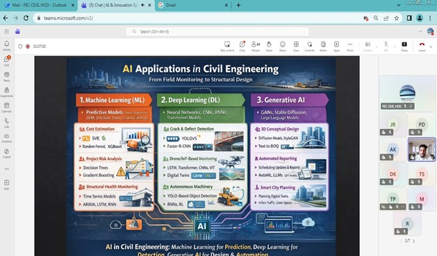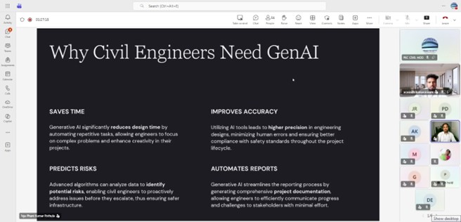 Dr. K. Sharmiladevi, Head of the Department, introduced the speaker and provided an overview of AI technology and its applications in Civil Engineering. Mr. Aravinth Kumarasivam, Technical Specialist at HCL Tech, Bengaluru, served as the resource speaker, accompanied by his team members Mr. P. Teja Phani Kumar and Mr. Praharsha Chinthapalli. The speaker highlighted the AI-driven solutions to improve efficiency, automate workflows, and develop intelligent systems in an organization. He discussed the role of AI in various industries such as healthcare, manufacturing, finance, and smart cities. He also explained AI technologies, including Machine Learning, Data Analytics, Natural Language Processing, and Computer Vision, are transforming traditional business processes into intelligent and automated systems. Mr. P. Teja Phani Kumar, a Senior Software Engineer, presented real-time case studies showing how organizations use AI to improve operational efficiency and make data-driven decisions.