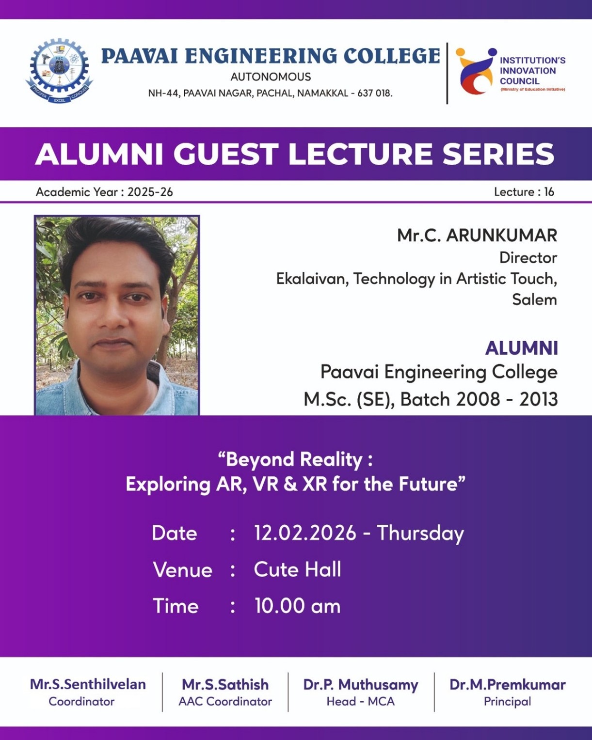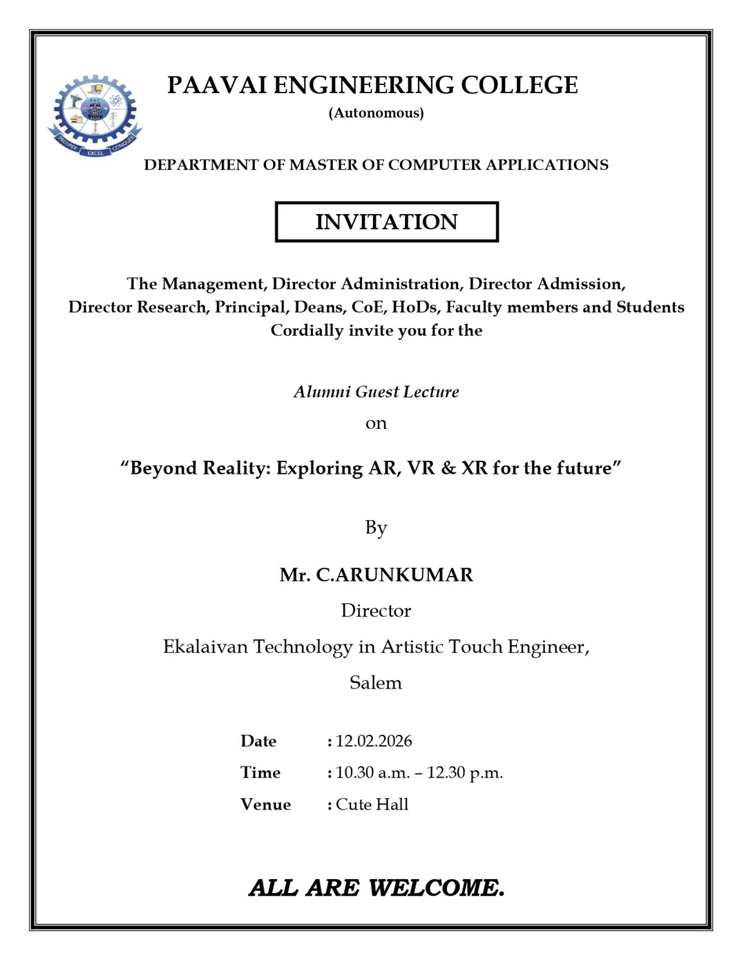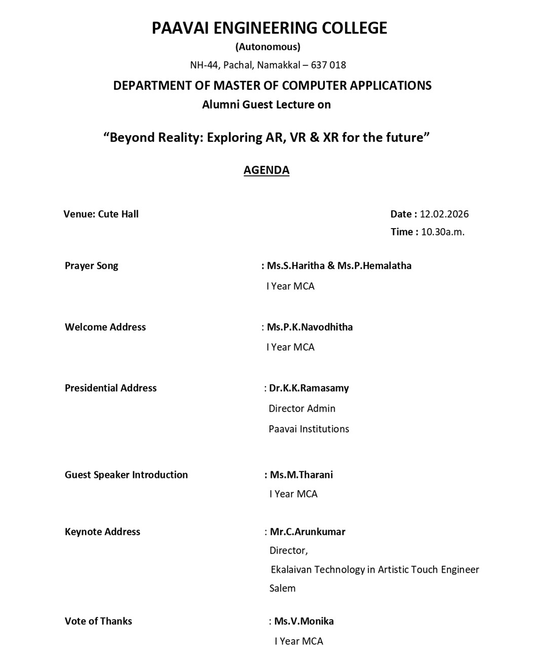 The Department of Master of Computer Applications organized anAlumni Guest Lecture on the topic “Beyond Reality : Exploring AR, VR & XR for the Future” on 12.02.2026 at Cute Hall.
