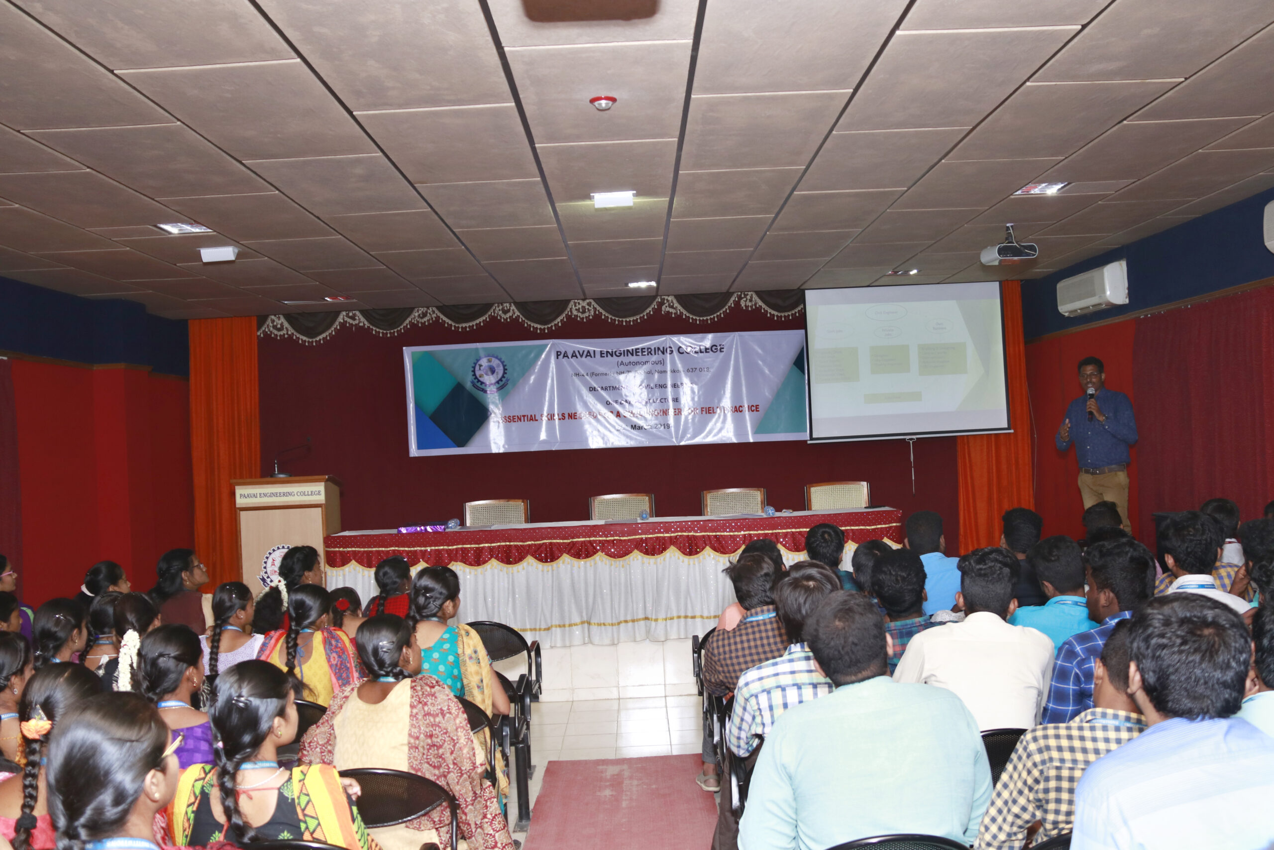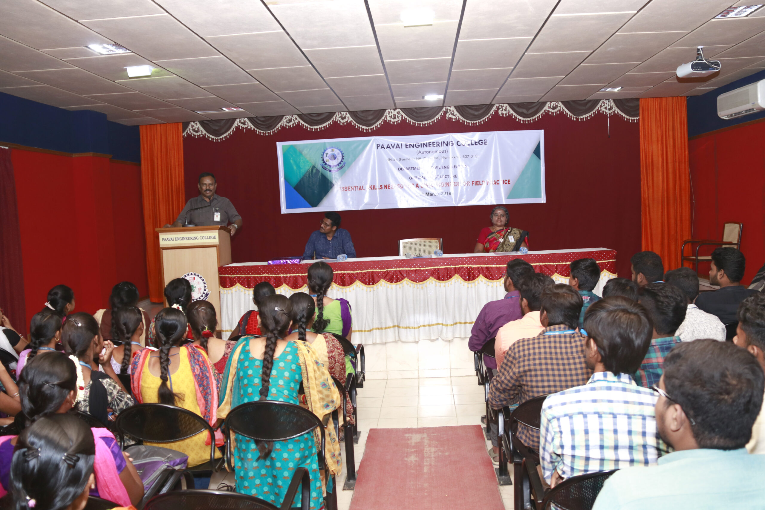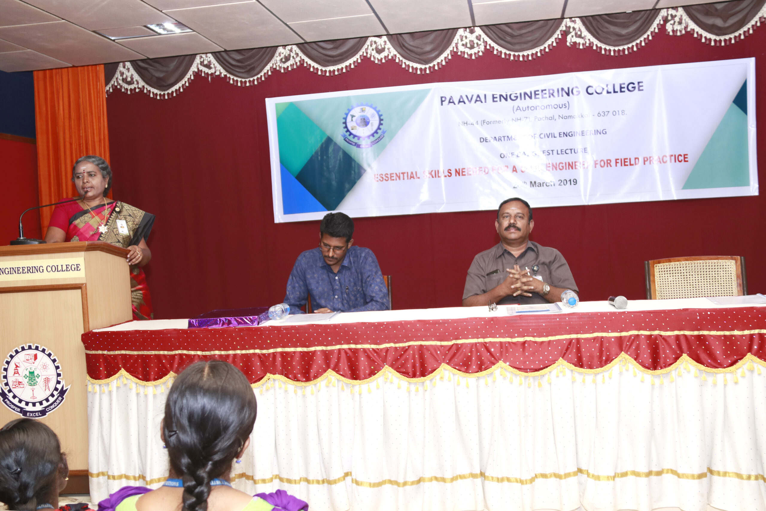 A One day Guest Lecture on the title “Essential Skills needed for a Civil Engineer for Field Practice” was organized by Department of Civil Engineering, Paavai Engineering College on 20.03.2019 at Kalam’s Chamber. Chief Guest – Er.Muthukaruppan Rajasekaran Licensed Building Surveyor, Vinay Construction & Interiors, Namakkal. Mr.K.Mohan, Third year student, Paavai Engineering College welcomed the gathering, Mr.S.Mohammed Faizal, Third year student Paavai Engineering College gave a brief introduction about the chief guest. Our Honorable Director – Admin / Paavai Institutions, Dr.K.K.Ramasamy, honored the Chief Guest and gave his valuable presidential address about the field of Civil Engineering and the essentiality of language Hindi in field work. Our Respected Head of Department Mrs.J.Umanambi, gave her session speech regarding the importance of continuous learning needed to expand their knowledge while new methods develop and how they should be fully committed and enhance their skills through experience. Er.Muthukaruppan Rajasekaran spoke elaborately about the Plan preparation, important techniques to be considered in Vasthu and concepts of estimation & valuation. He maintained the session as more interactive and very useful. A good number of Professors actively participated in the program and were benefited. The queries from the students and faculties were effectively replied by the chief guest. Finally the vote of thanks was delivered by Ms.A.Sasikala, Third Year student and our Guest lecture program was successfully concluded.