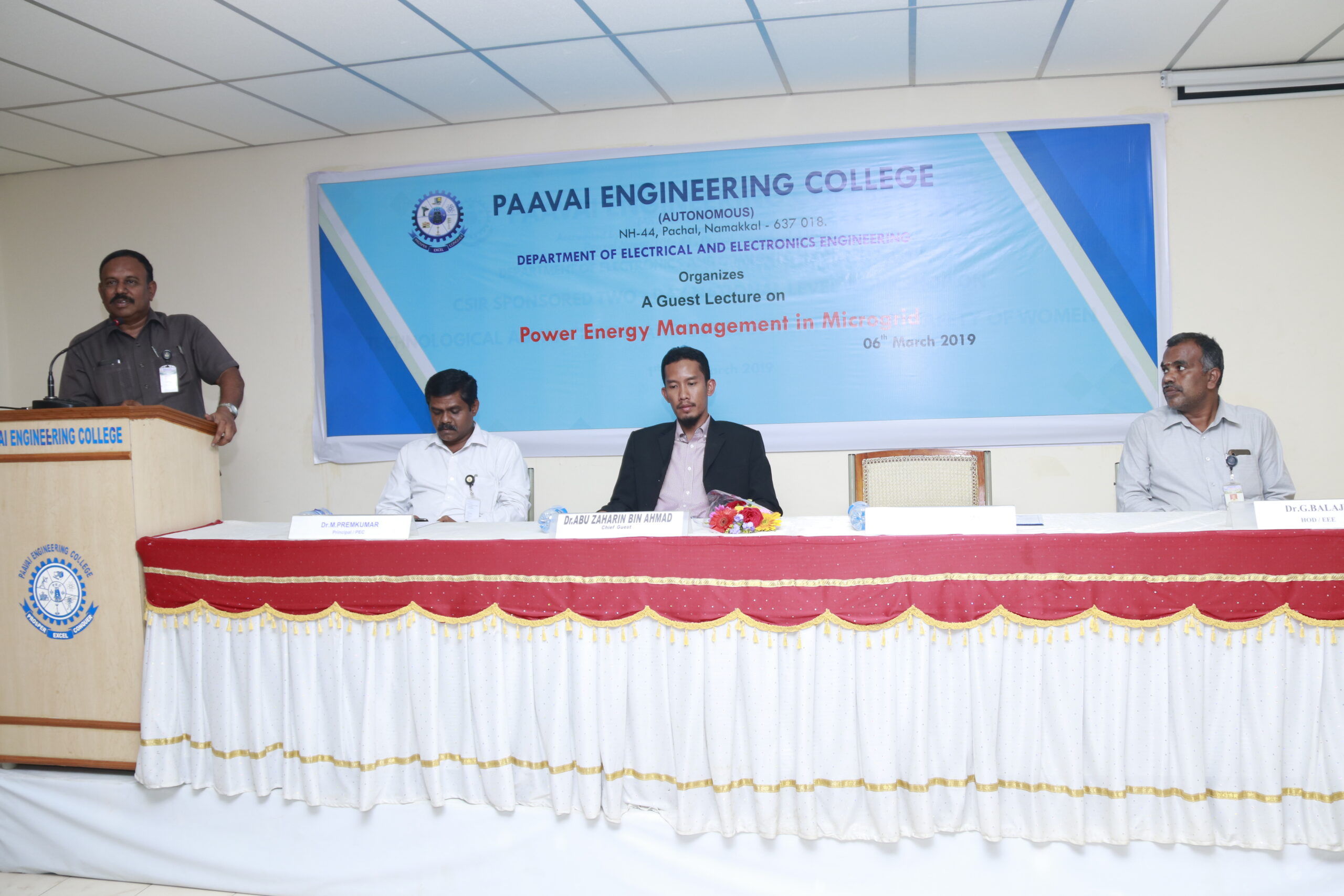 The Department of EEE, Paavai Engineering College (Autonomous), conducted a guest lecture on the title, POWER ENERGY MANAGEMENT IN MICROGRID on 06.03.2019. Dr.K.K.RAMASAMY, Director – Administration, Paavai Institutions and Dr.M.PREMKUMAR, Principal, Paavai Engineering College (Autonomous) graced the occasion. In his presidential address, Dr.K.K.RAMASAMY, Director – Administration, insisted the students to consider this kind of guest lecture as an opportunity to know the advancements in the field of power management in microgrid. He also insisted the need of developing the skills in their respective domains and learning other languages which would help them during their career. Knowledge upgradation is quite necessary and there is always a constant opportunity for effective electrical engineers. Dr. ABU ZAHARIN BIN AHMAD, Senior Lecturer, Faculty of Electrical and Electronics Engineering, University of Malaysia Pahang, Malaysia, was the chief guest. In his lecture, he spoke about the power generation using renewable and conventional energy sources. Interconnection of various energy sources such as PV Cells, wind, fossil fuels, and energy storage equipment such as battery, fuel cell were explained. He mentioned about the hierarchy of microgrid. He also explained about SCADA system concepts for microgrid. He insisted the participants to shape themselves according to the needs of the society as they are in the period of innovation. Ms.S.A.Mubeena Begam of final year EEE welcomed the gathering and Ms.S.Thamarai Selvi of final year EEE proposed the vote of thanks.