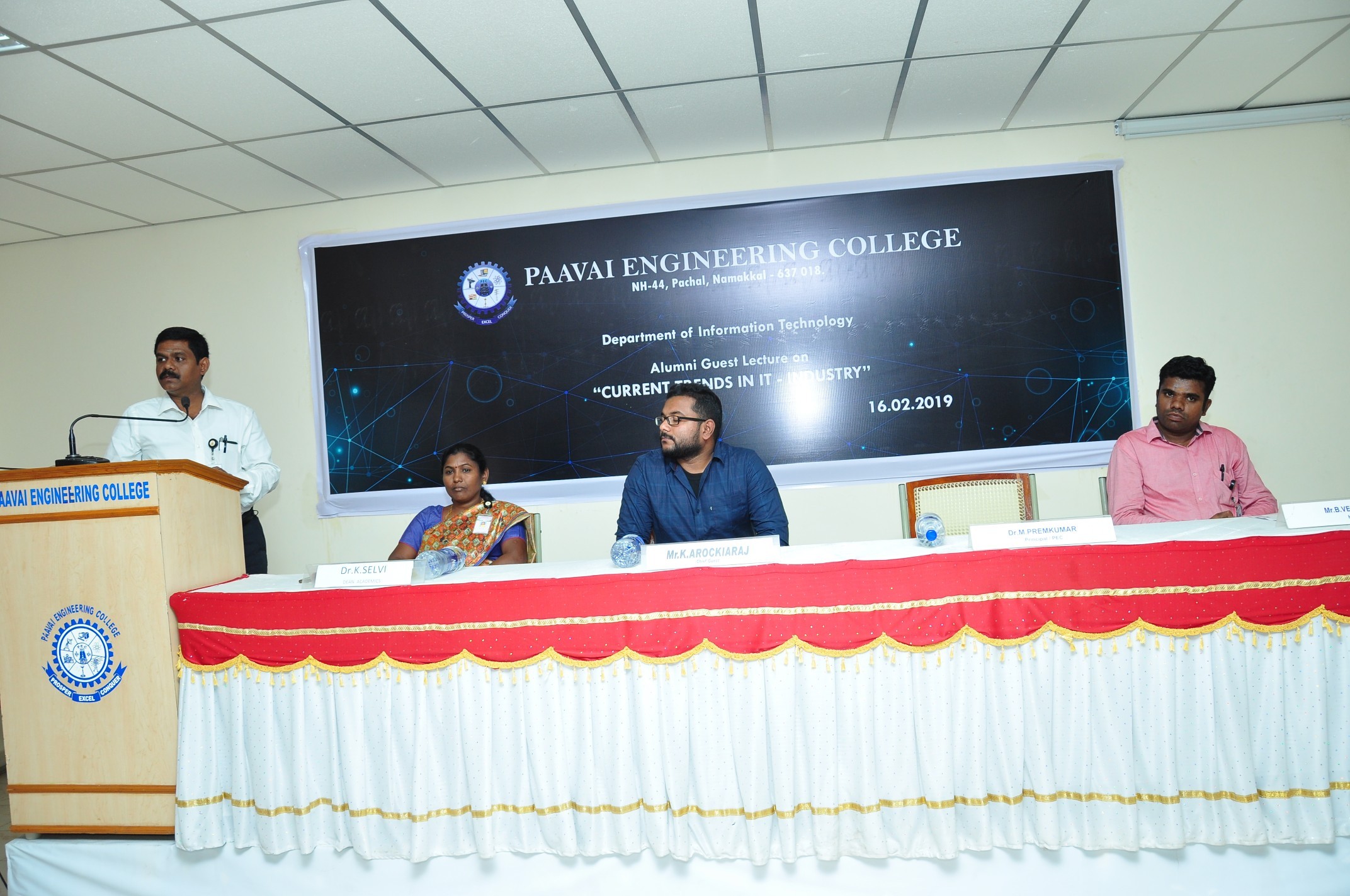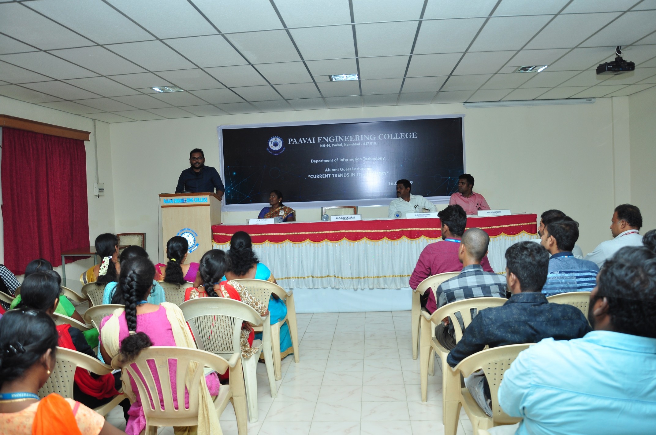 The department of Information Technology organized a Guest lecture on ‘Current Trends in IT’ on 16.02.2019 at cute hall. The function started with silent prayer for the Indian army men who sacrificed their life and followed by prayer song. The welcome address was proposed by Roshini, II year IT. The Principal, Paavai Engineering College, presided over the function. In his presidential address, he emphasized the importance of this session and made the student enthusiastic to learn more from the guest speaker. The chief guest started his session by saying about the importance of HR like recruitment, compensation management, performance appraisal, learning and development and industrial relation. He insisted that the students should know about the company and the field they work. He also said that knowledge about the competitors focus on resource and tracking information in a systematic way is the must. He explained about various trends in HRM, dynamic changes in education, smart work and ultimate software development. The session ended up with doubts and questions by our students and the alumni solved their doubts. Ambrishnath, II year IT proposed the vote of thanks.