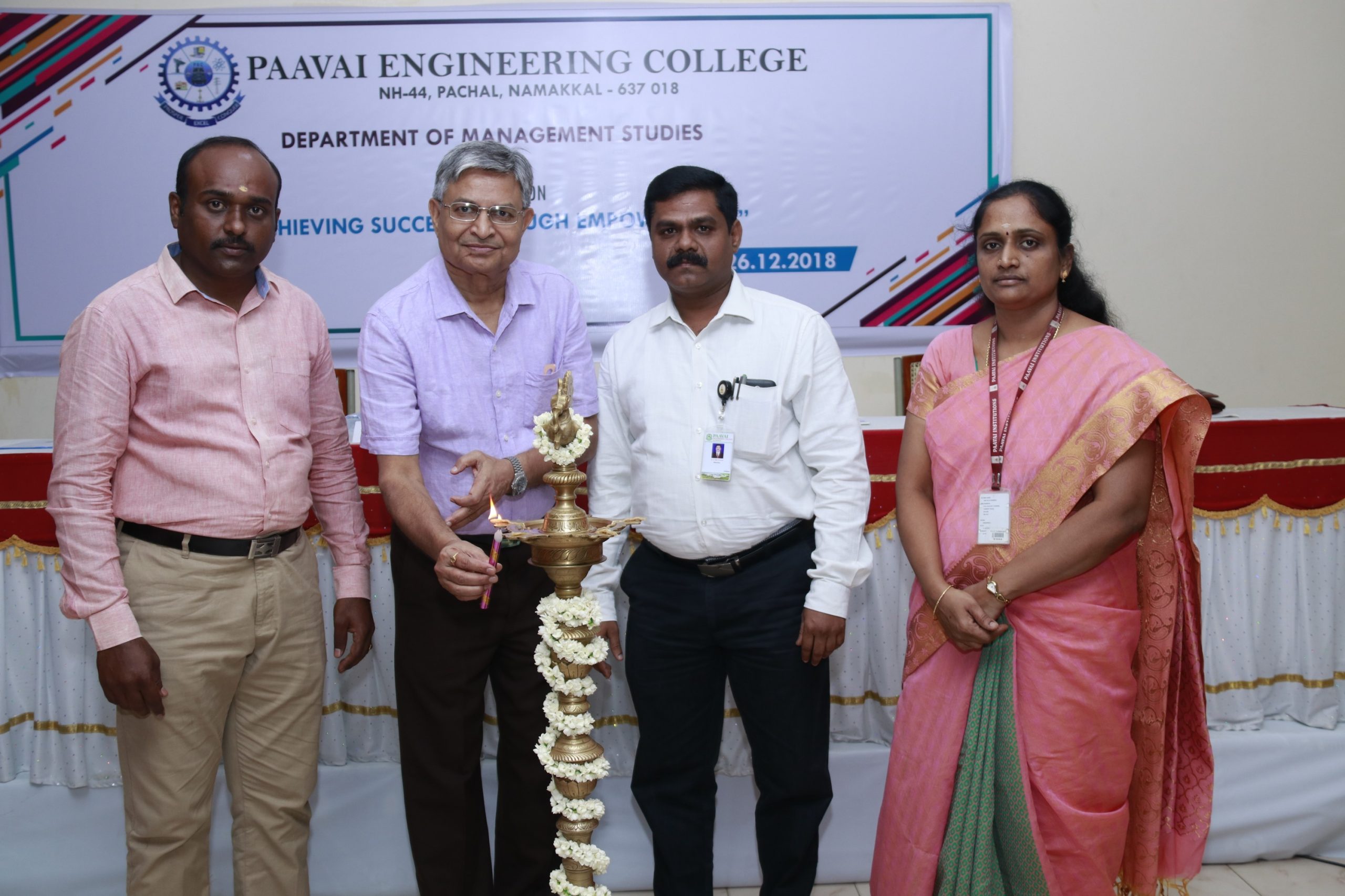 A two day workshop was organized by the Department of Management Studies, Paavai Engineering College on 26.12.2018 & 27.12.2018 on the Titles “ACHIEVING SUCCESS THROUGH EMPOWERMENT” for PG (MBA and MCA Scholars) and STUDENT TO ADULT LEARNER: A TRANSFORMATION for UG Engineering Students) in Cute Hall at 10 a.m. The function started with the prayer song. Dr.M.Premkumar, Principal of Paavai Engineering College, presided over the function. In his Presidential address, he motivated the students to surrender themselves to the work they have been committed. The Principal honored the chief guest with the memento and shawl.The session was handled by, Prof Dr.K.S.Gupta, Director, KSG Center for Quality Minds, Bangalore. On day 1 workshop, Dr.Gupta discussed the significance of empowerment, dominant negative mind program and success stories of different personalities. Dr.Gupta conducted many rapport building exercises and case studies during the session. He also shared his life time experiences in professional and personal life. He insisted the importance of Self-Empowerment. This workshop further helped the students to understand about empowering self and others. On Day2 workshop, Dr.Gupta discussed the importance of relationship, transformational change from student to adult learner and human mind programming. Dr.Gupta conducted ice breaking and rapport building exercises. At the end of the session, Students of Paavai Engineering college and other institutions were enlightened with valuable thoughts. The students had good interaction with Dr.Gupta and it helps them to enrich their skills to make their personal and professional life successful. The Faculty members of MBA department and the students of MBA and MCA interactively participated in the session and it ends with valediction and vote of thanks.