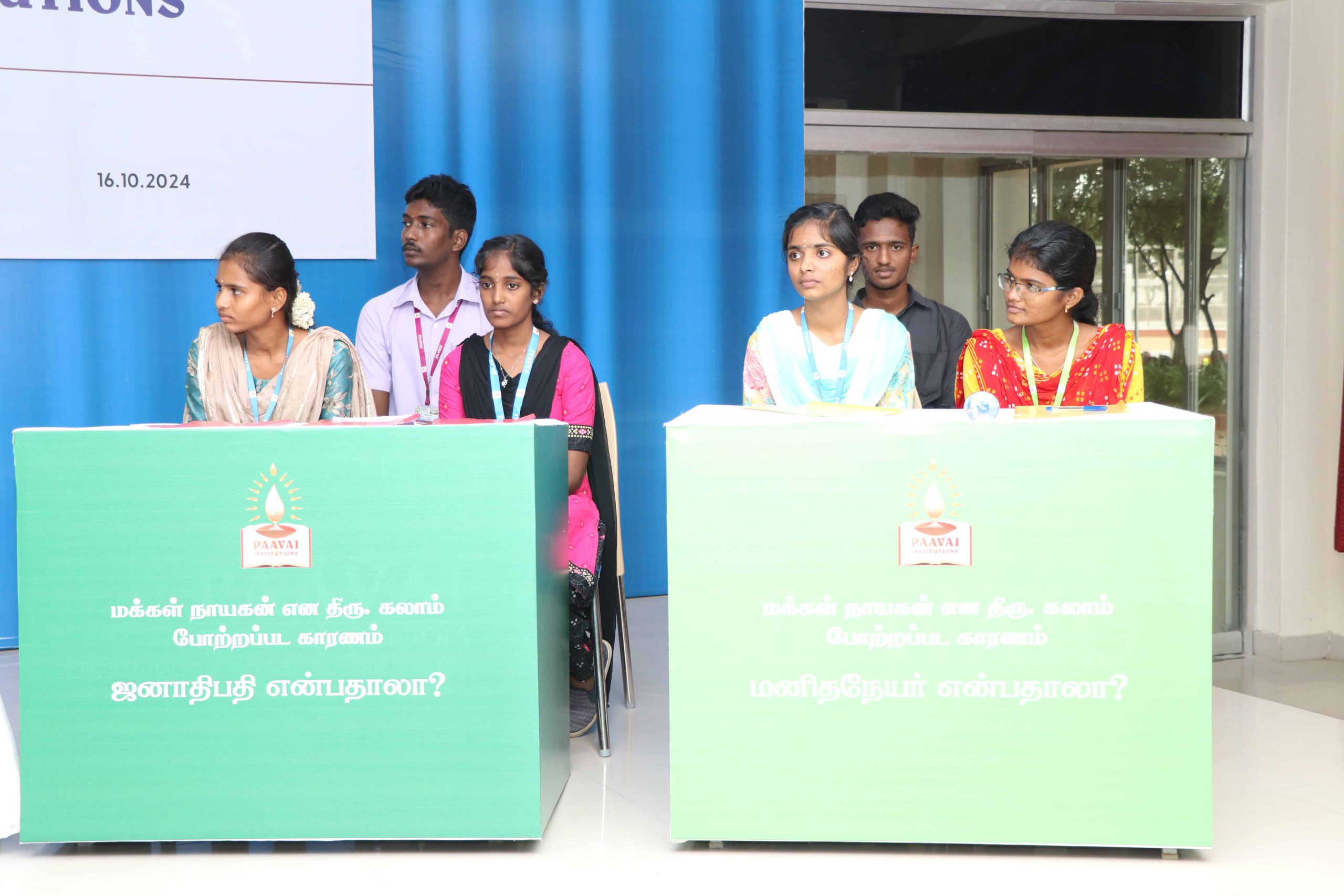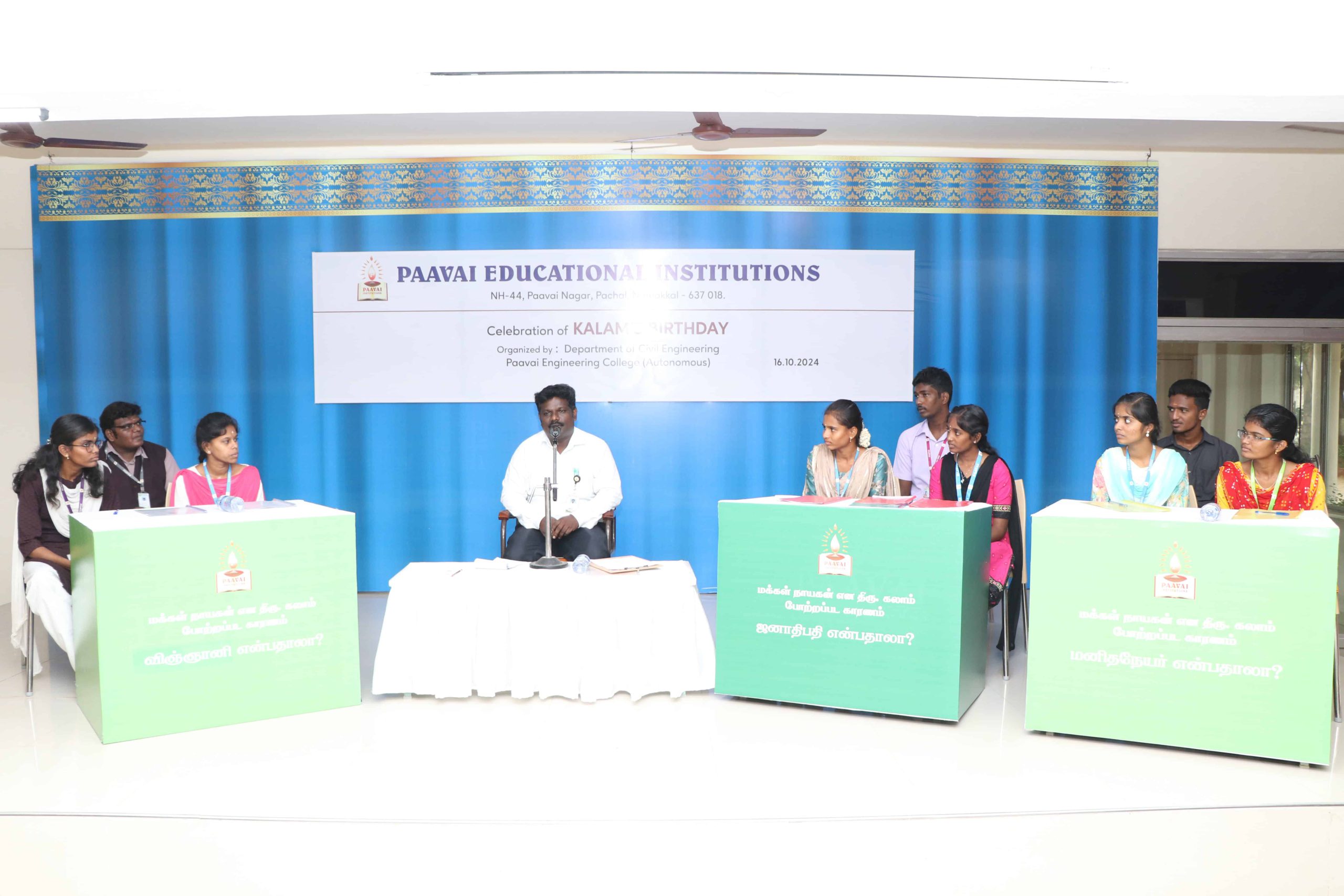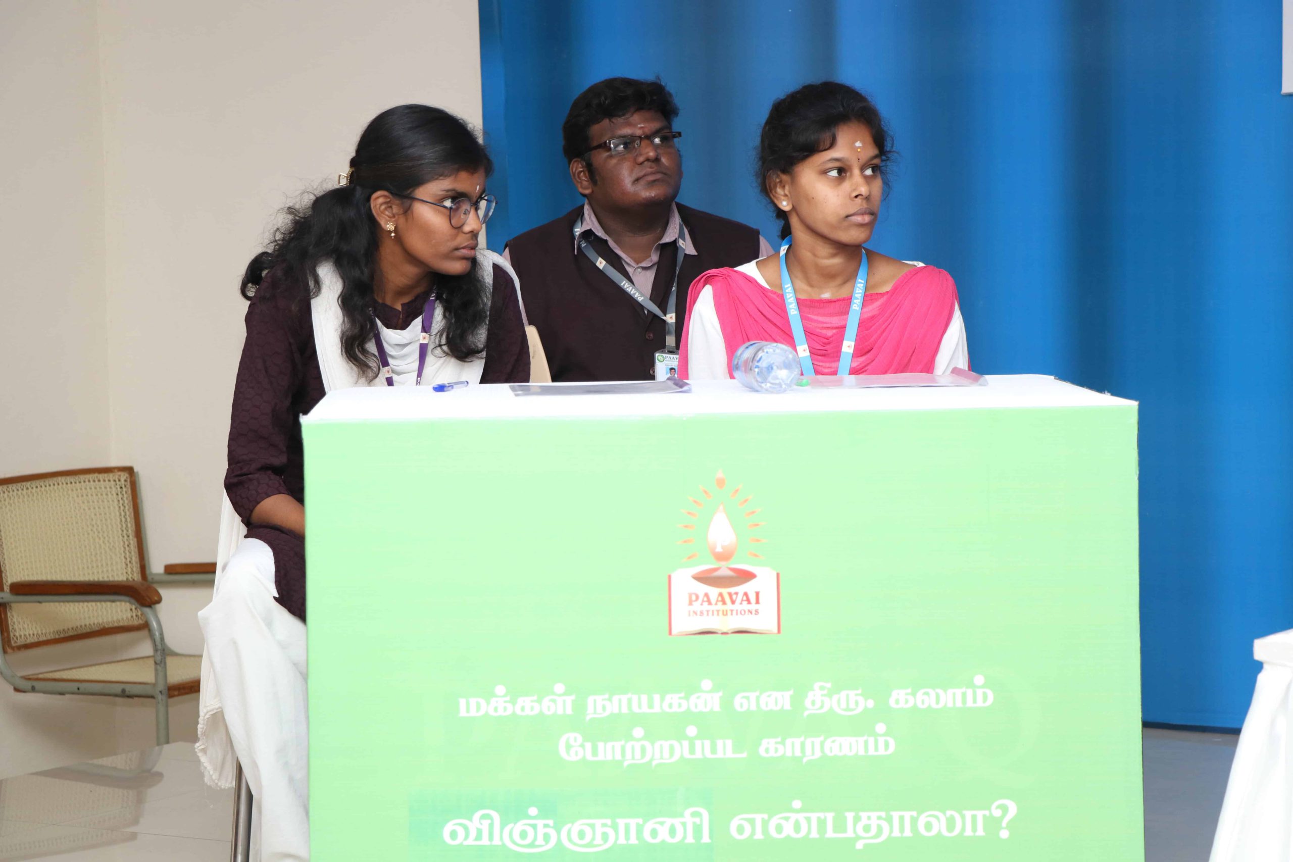 The another event debate was conducted in afternoon in the title “ மக்கள் நாயகன் என திரு. கலாம் போற்றப்பட காரணம் – விஞ்ஞானி என்பதாலா? ஜனாதிபதி என்பதாலா? மனிதநேயர் என்பதாலா? ” Three teams participated in the debate, each comprising three members. The judging panel, headed by Dr. A. Immanuvel, Vice Principal, Paavai College of Engineering and Prof.K.Sharmiladevi, HoD/Civil, along with Civil faculty members & A.Samundeswari, ASP/ECE and around 600 students were attended the debate event.