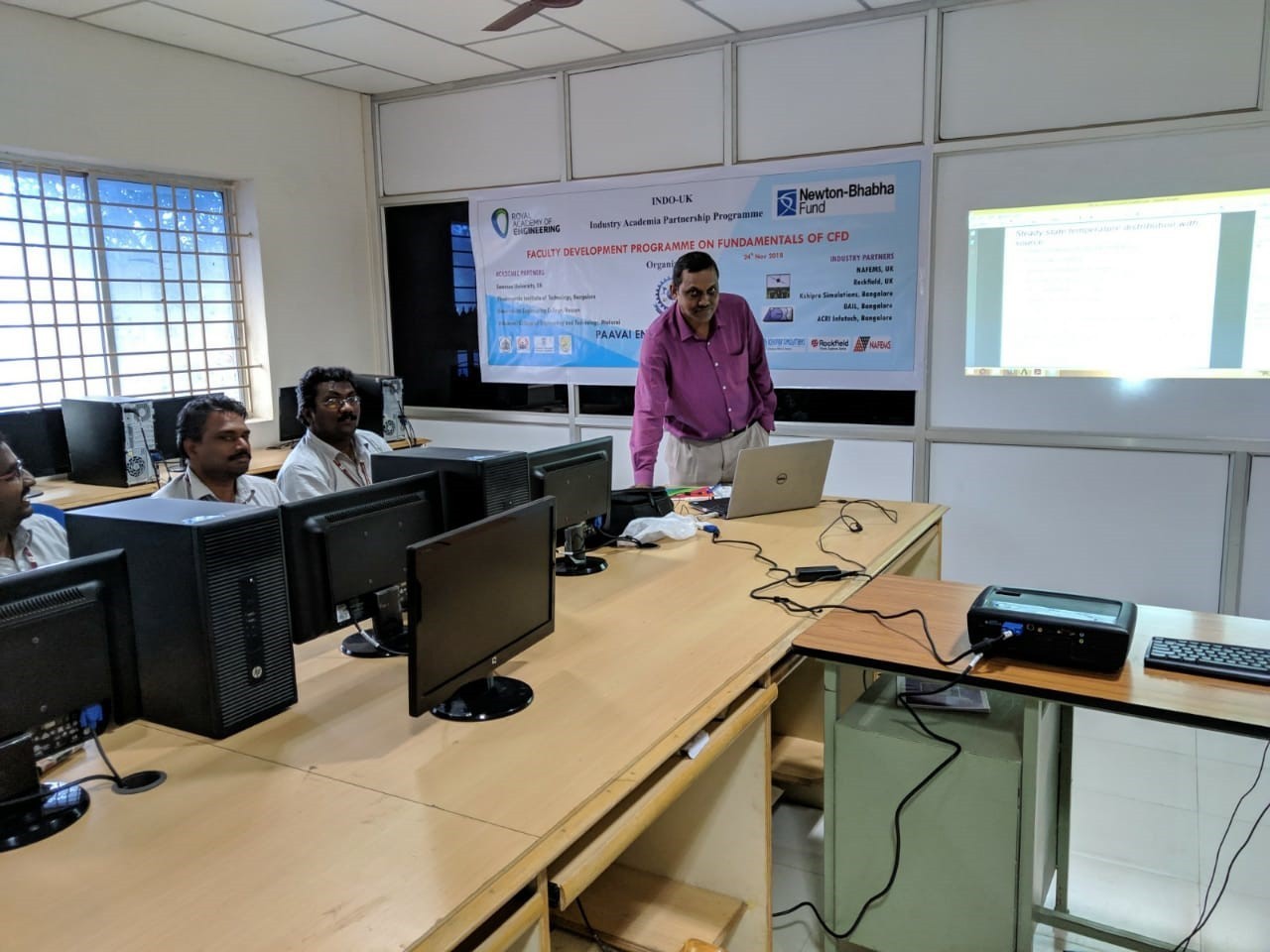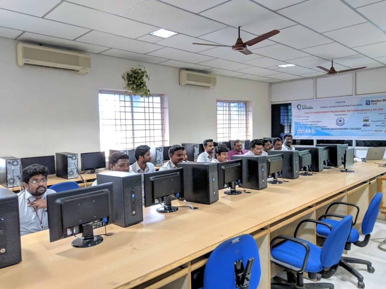 A FDP on ‘Training Programme on Fundamentals of Computational Fluid Dynamics’ was organized by the Department of Mechanical Engineering at CAD laboratory in Paavai Engineering College campus on 24.11.2018 under the Indo-UK Higher Education Partnership Programme for quality development through academic trainings. These programmes impart hands-on training on industry-oriented courses like Finite Element Analysis, ANSYS, CFD to develop domain knowledge through practice. The resource person was Mr.A.CHAKRAPANI, Manager-Operations, ACRI Info Tech, Bangalore. He is a renowned analyst who is working on industrial problems through Computational Fluid Dynamics to solve them. The inaugural function held in this connection was presided over by the Principal, Paavai Engineering College, Dr. M. Premkumar. Faculty members of Mechanical Engineering and Aeronautical Engineering from various Paavai Institutions participated in the programme. The Principal, in his presidential address urged the participants to utilize the opportunity to update their knowledge in the domain of Computational Fluid Dynamics as this would be the base for solving industrial probelems in the future. The invited speaker Mr.A.CHAKRAPANI begun his lecture by explaining the fundamentals of fluid dynamics and all the terminology associated with it through power point presentation. The training course included hands-on training in which he solved one dimensional fluid flow analysis and internal heat generation problems and explained the various steps involved in applying CFD effectively. He cleared the doubts individually and helped the participants in solving different types of problems using ANSYS workbench. The training programme was interesting, informative and interactive. The sessions were beneficial to the participants which was clear from the enthusiasm they expressed during interactions. The sesseion came to an end with vote of thanks.