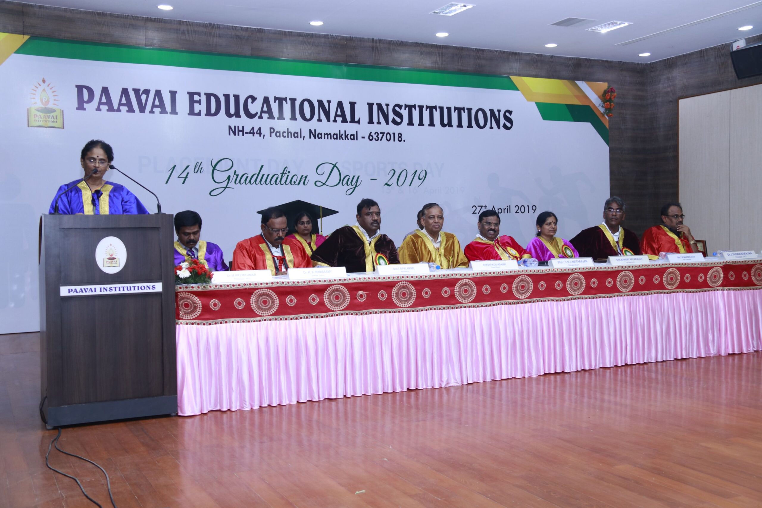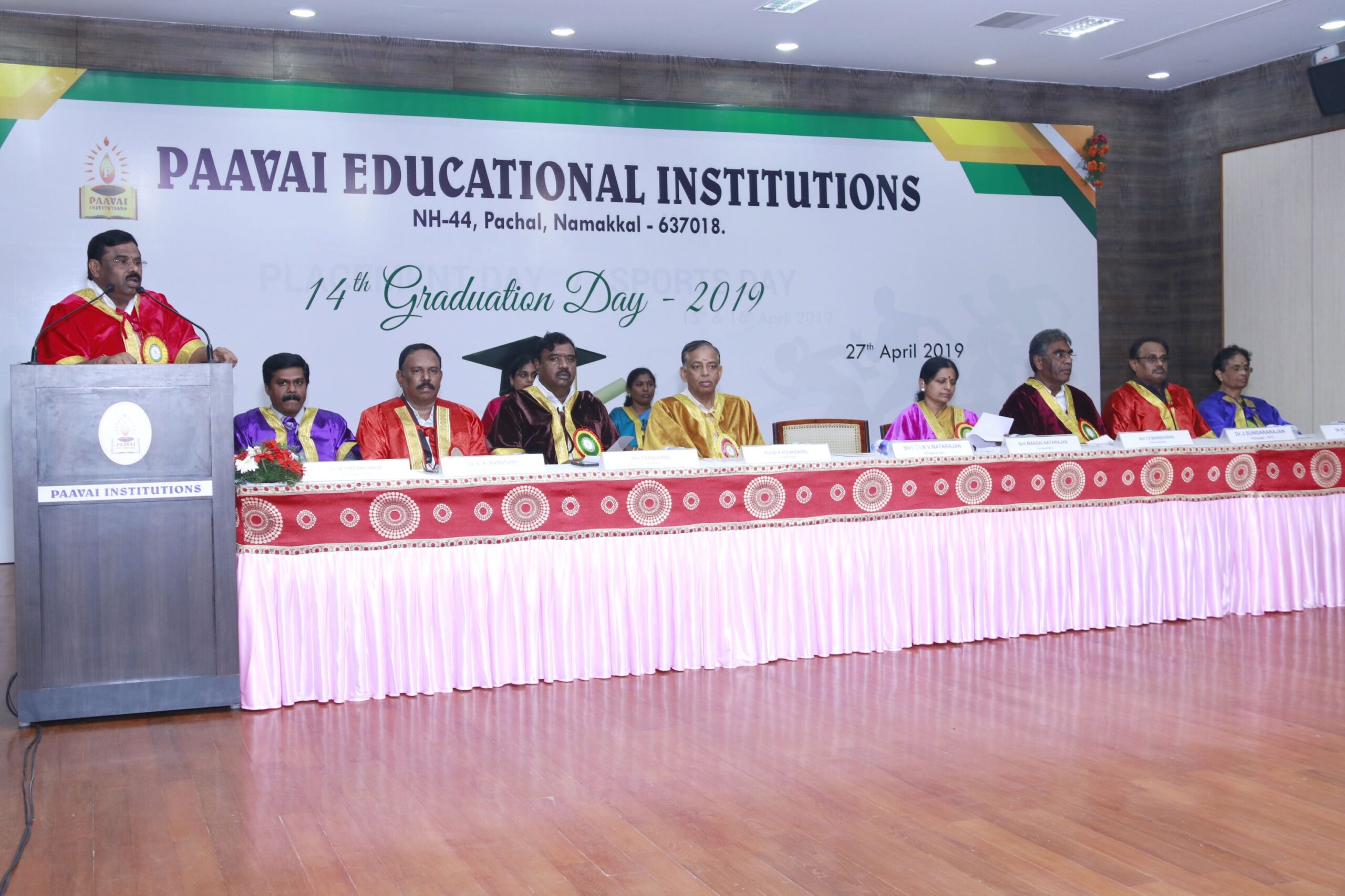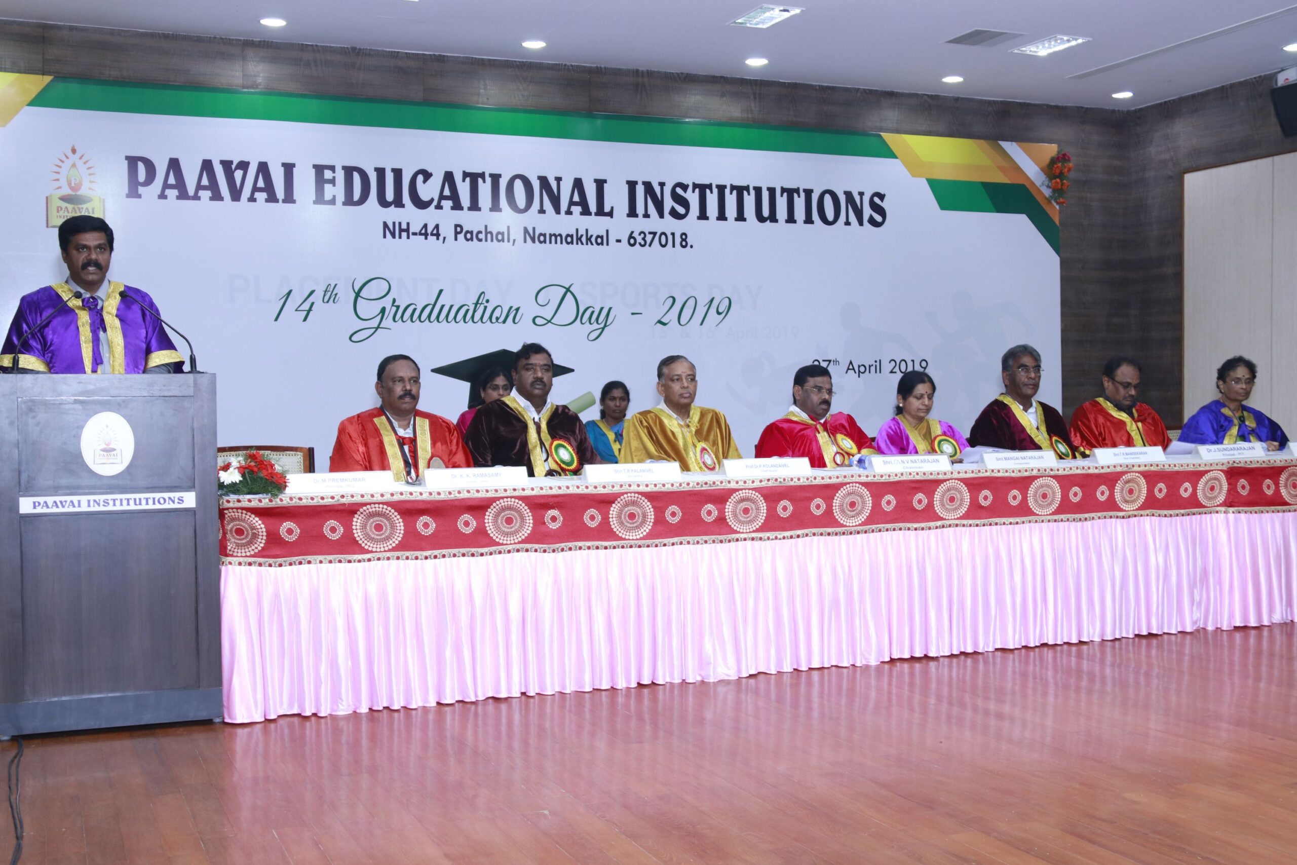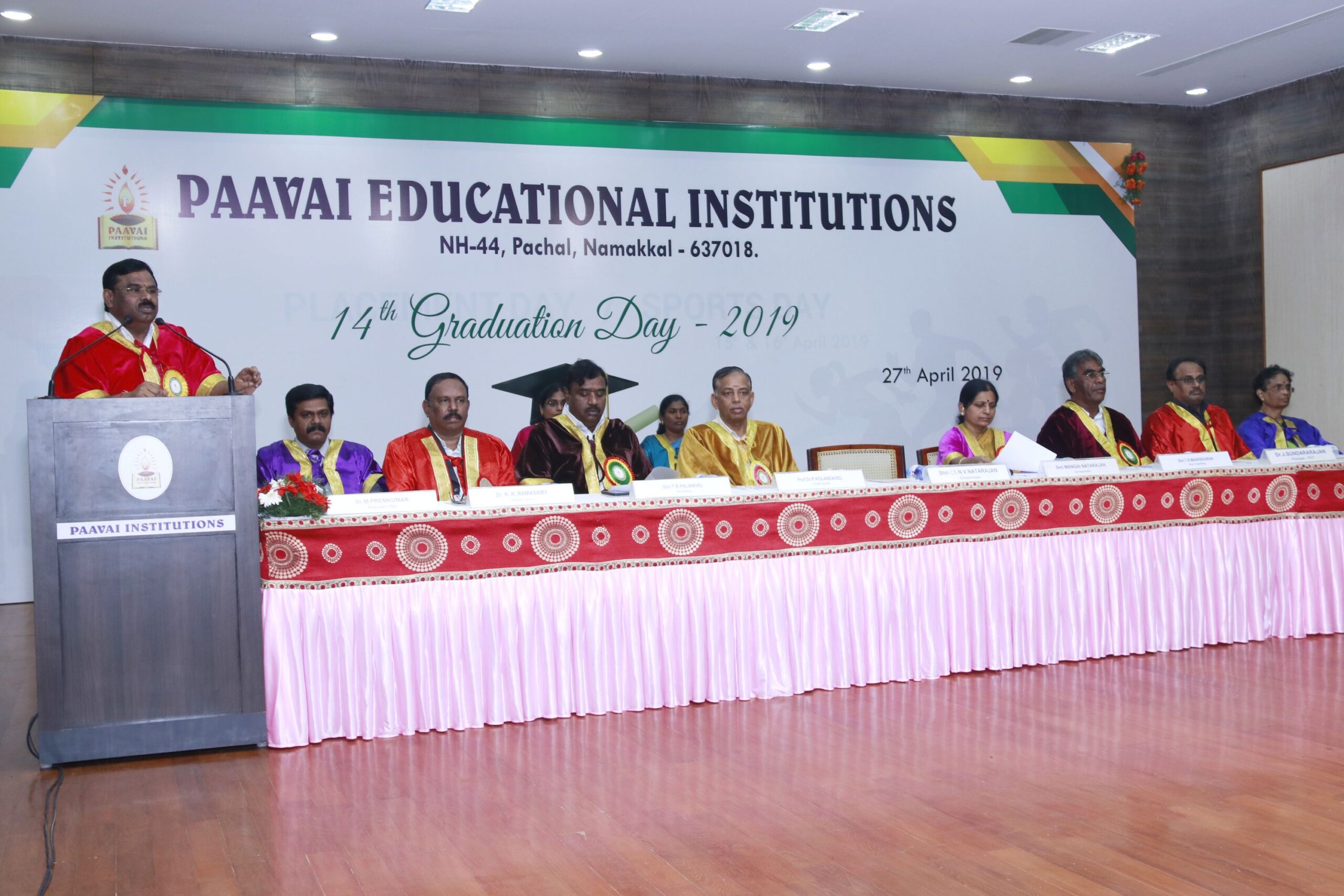 The 14th graduation ceremony for the graduates of Paavai Educational Institutions including Paavai Engineering College, Paavai College of Engineering, Pavai college of Technology, Pavai Arts and Science colleges. Shri. CA.N.V. Natarajan, The Chairman, Paavai Educational Institutions, presided over the inaugural function. Dr.P.Kulanthaivel, Vice chancellor, Periyar University, was the chief guest of the day. Smt. Mangai Natarajan, The Correspondent, Paavai Institutions, lighted the kuthuvilakku along with the dignitaries on the dias. Dr.M.Premkumar, The Principal, Paavai Engineering College, welcomed the gathering.The chief guest, in his keynote address, said, “ I am happy on seeing the graduates of Paavai Institutions who had got the opportunity to undergo world class education in high quality structure at the beautiful environment. Education and agriculture are important for all human beings as they are the vital sources of the country’s development. Countries like Japan and Germany with small landscapes and more natural disasters have recovered and achieved great growth in short term only because of Education. The best way to deal with problems and obstacles in our lives is our subtle knowledge. So, by getting degree today, begin to travel towards the new goal. Act as constructive thinkers. Make your identity and become the expert in your field so that you can make yourself a prosperous India and lead to development in the world. Be always with positive thoughts. Do not give-up on self confidence and perseverance. Congratulations to you all greatness of life”. All the graduates were awarded with degree certificates whereas the university rank holders and department toppers were awarded with gold and silver medals. Earlier, The chairman and Secretary, Paavai Institutions, presented the memento and bouquet to the chief guest. Followingly, all the new graduates were made to accept the convocation pledge. The Vice Chairman – Thiru Manisekaran, Secretary – Thiru Palanivel, Director Administrations -Dr.K.K.Ramasamy, Director Admissions – Thiru K.Senthil, Director Placements and Training – Thiru Srinivasan, Principals, Heads of various Departments, Faculty members, students and parents were present in the valedictory session of the graduation ceremony.