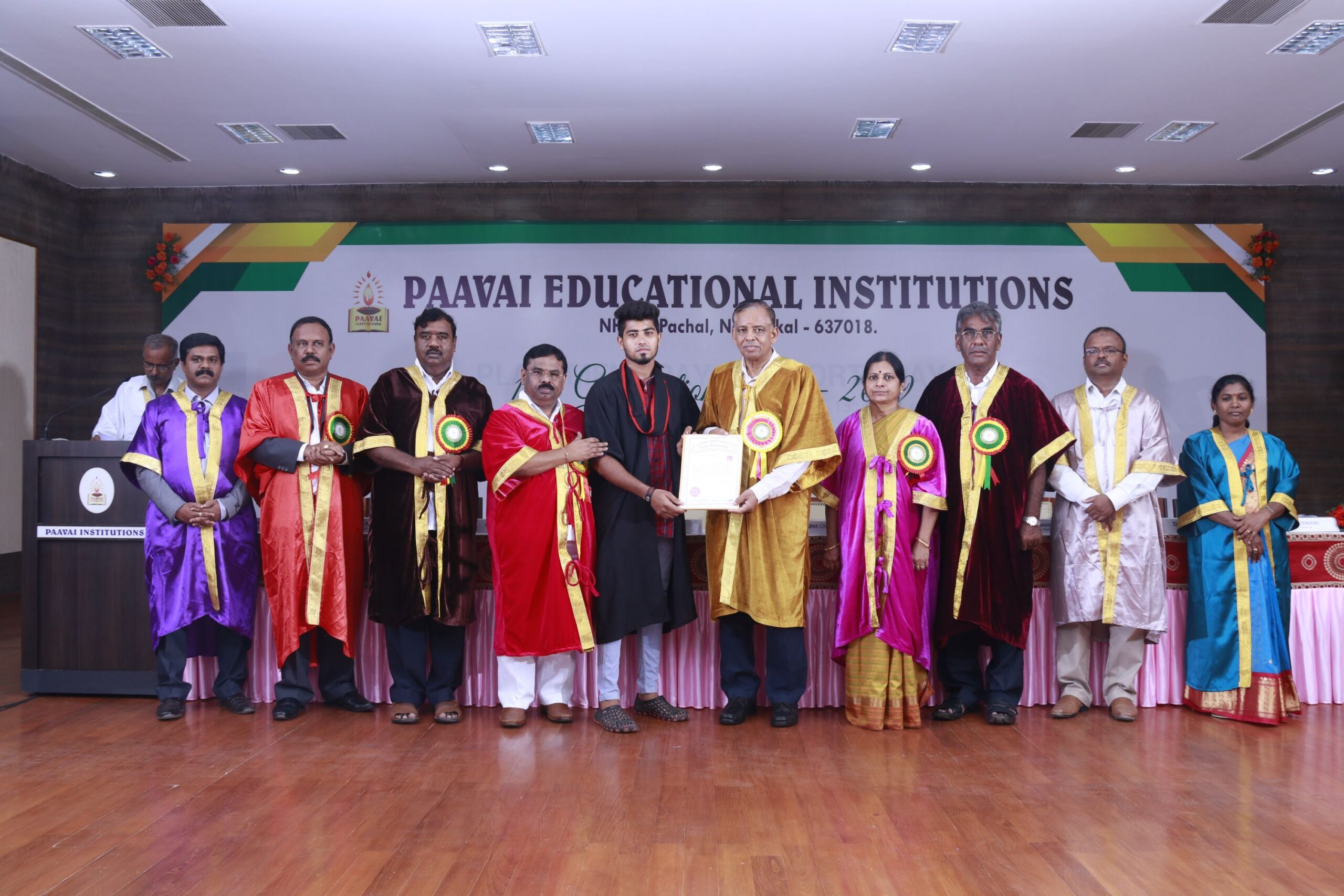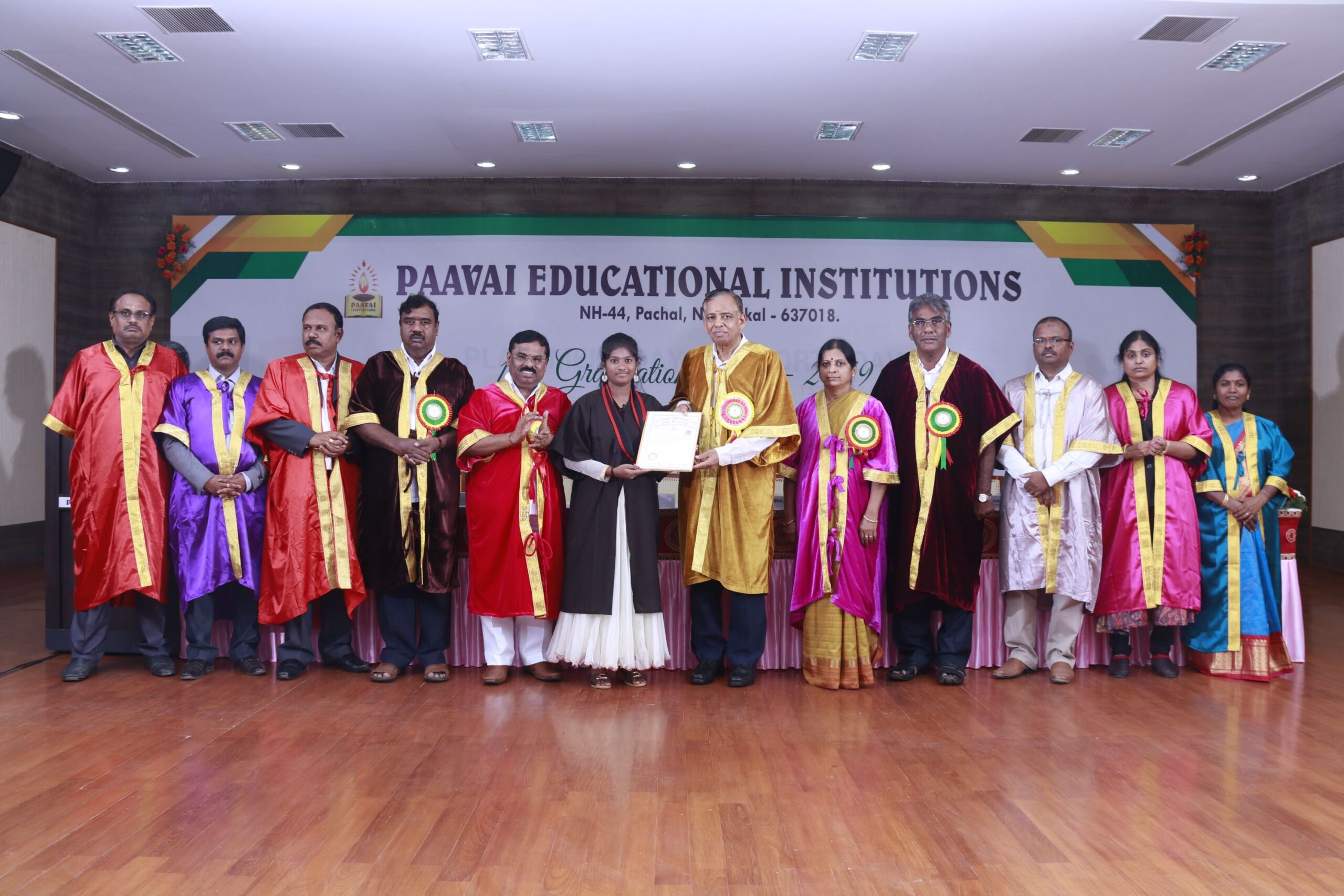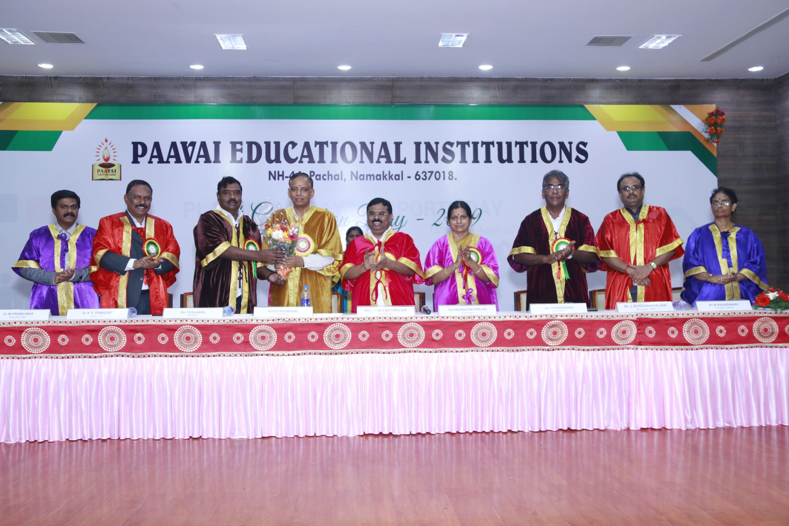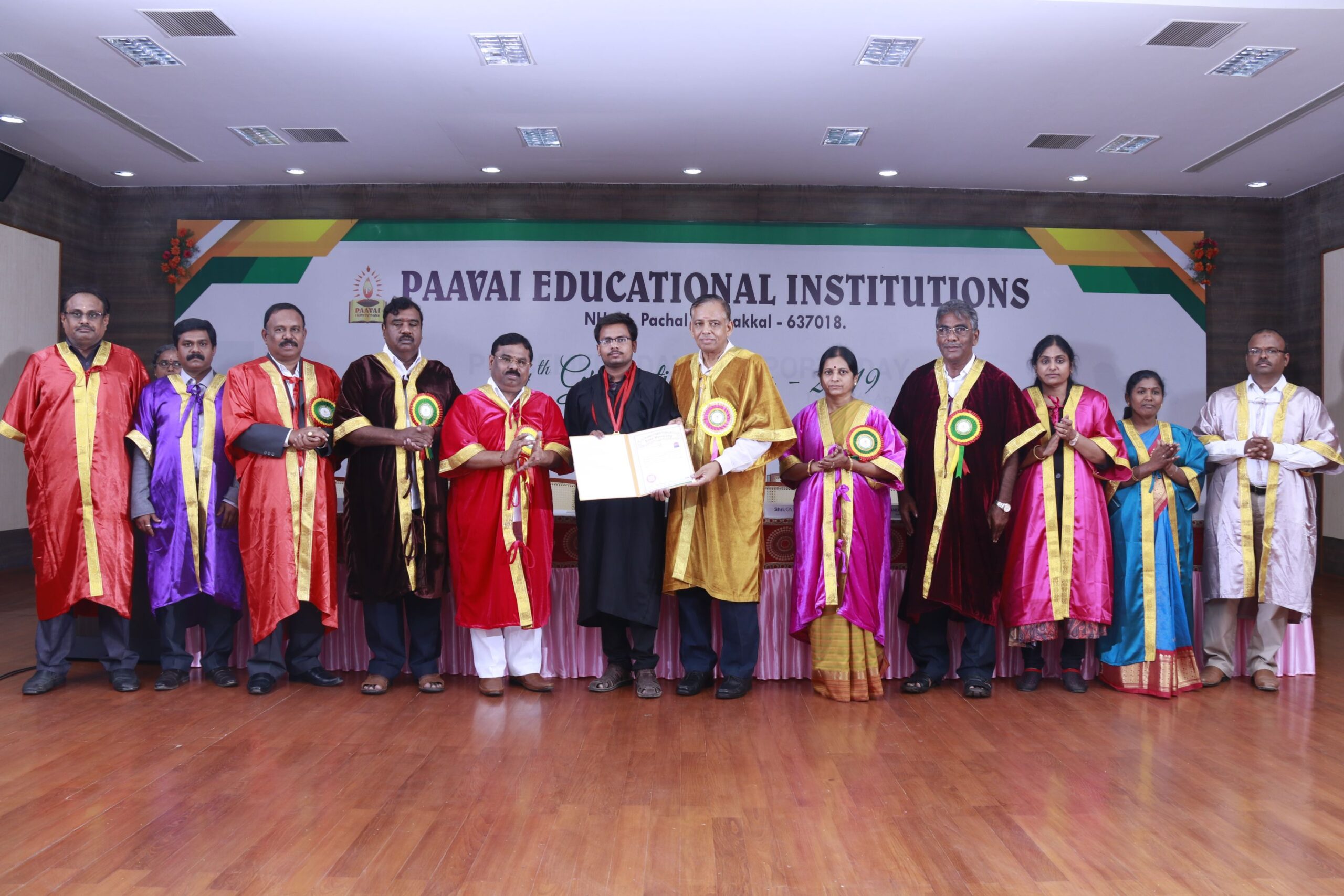 The 14th graduation ceremony for the graduates of Paavai Educational Institutions including Paavai Engineering College, Paavai College of Engineering, Pavai college of Technology, Pavai Arts and Science colleges. Shri. CA.N.V. Natarajan, The Chairman, Paavai Educational Institutions, presided over the inaugural function. Dr.P.Kulanthaivel, Vice chancellor, Periyar University, was the chief guest of the day. Smt. Mangai Natarajan, The Correspondent, Paavai Institutions, lighted the kuthuvilakku along with the dignitaries on the dias. Dr.M.Premkumar, The Principal, Paavai Engineering College, welcomed the gathering.The chief guest, in his keynote address, said, “ I am happy on seeing the graduates of Paavai Institutions who had got the opportunity to undergo world class education in high quality structure at the beautiful environment. Education and agriculture are important for all human beings as they are the vital sources of the country’s development. Countries like Japan and Germany with small landscapes and more natural disasters have recovered and achieved great growth in short term only because of Education. The best way to deal with problems and obstacles in our lives is our subtle knowledge. So, by getting degree today, begin to travel towards the new goal. Act as constructive thinkers. Make your identity and become the expert in your field so that you can make yourself a prosperous India and lead to development in the world. Be always with positive thoughts. Do not give-up on self confidence and perseverance. Congratulations to you all greatness of life”. All the graduates were awarded with degree certificates whereas the university rank holders and department toppers were awarded with gold and silver medals. Earlier, The chairman and Secretary, Paavai Institutions, presented the memento and bouquet to the chief guest. Followingly, all the new graduates were made to accept the convocation pledge. The Vice Chairman – Thiru Manisekaran, Secretary – Thiru Palanivel, Director Administrations -Dr.K.K.Ramasamy, Director Admissions – Thiru K.Senthil, Director Placements and Training – Thiru Srinivasan, Principals, Heads of various Departments, Faculty members, students and parents were present in the valedictory session of the graduation ceremony.