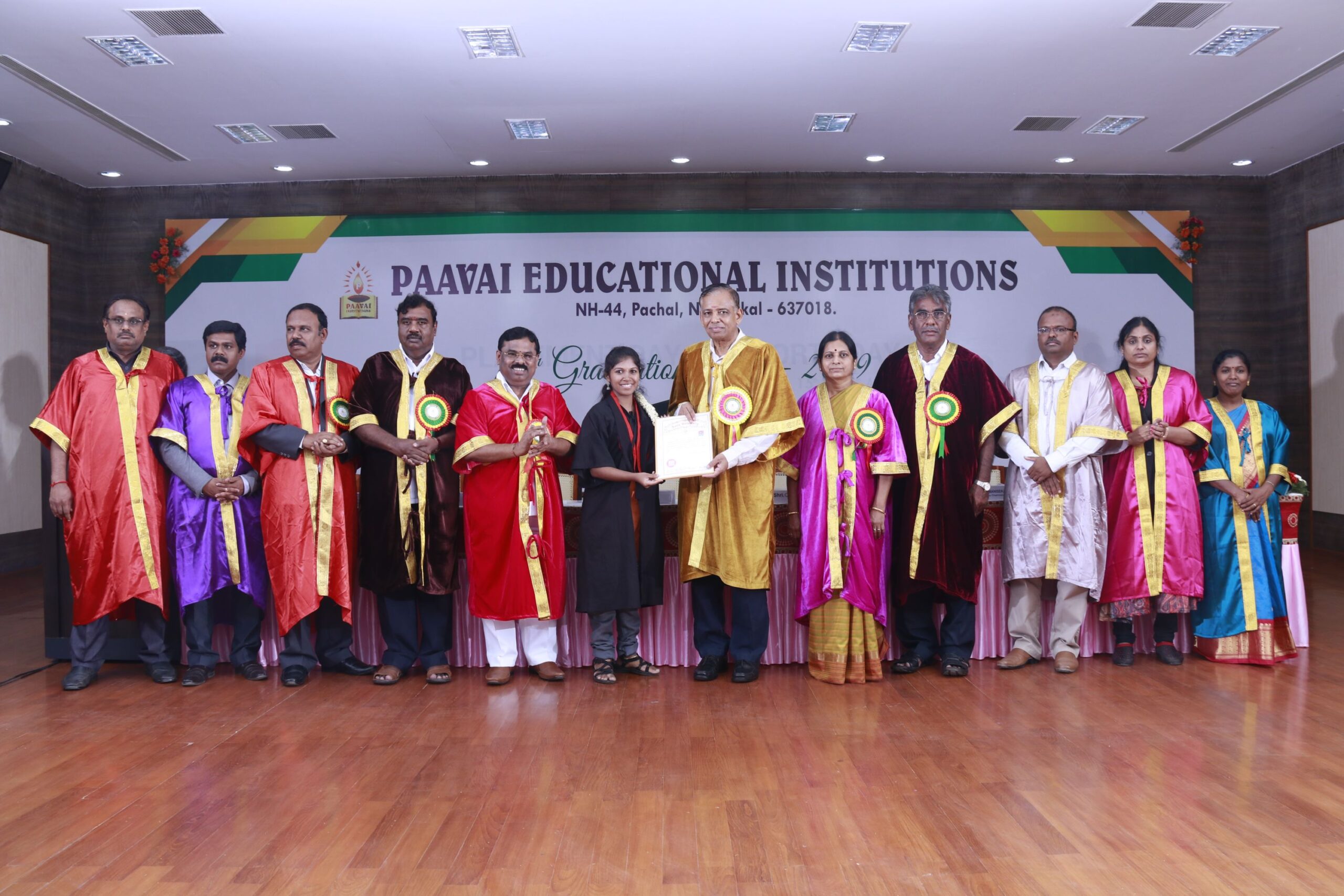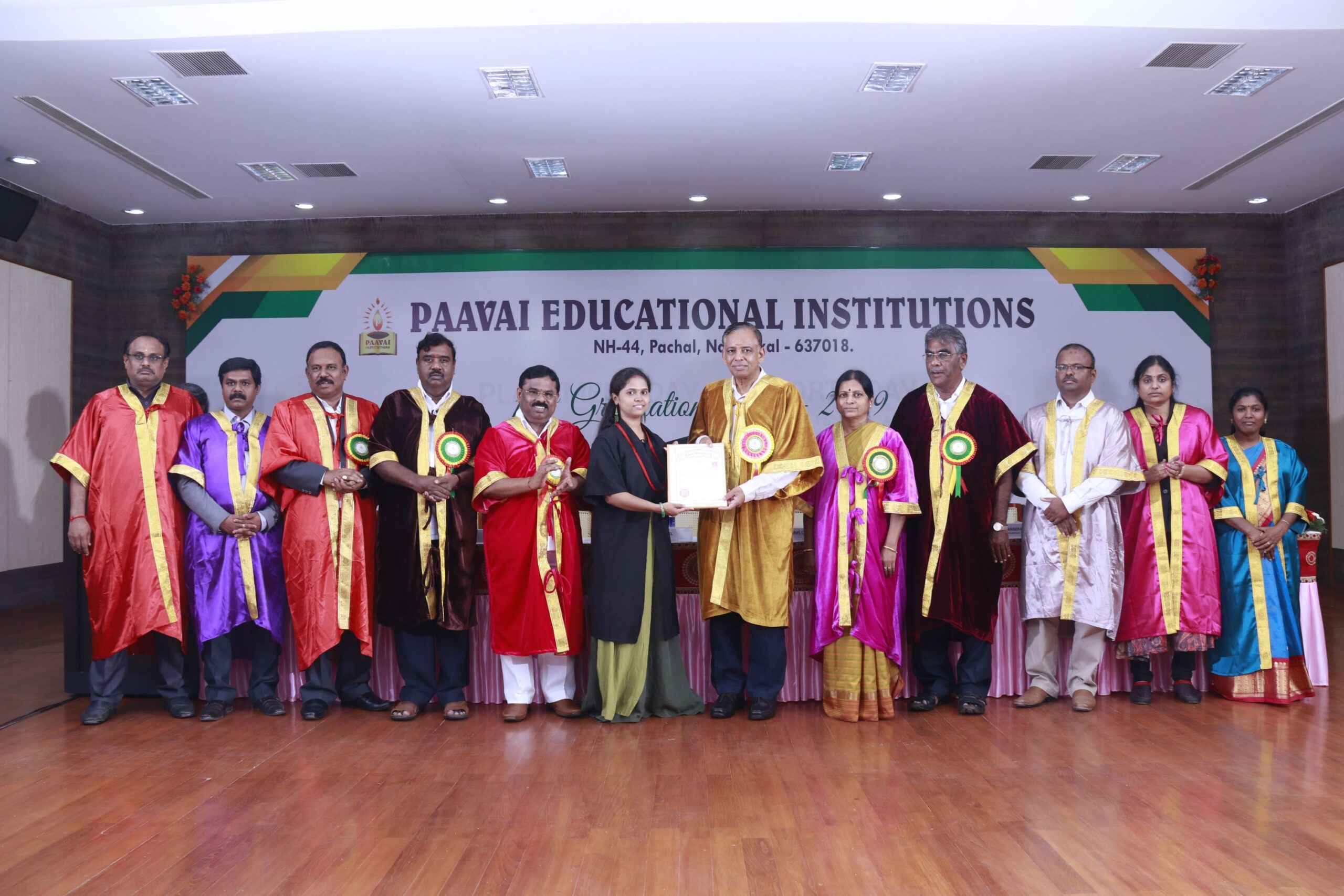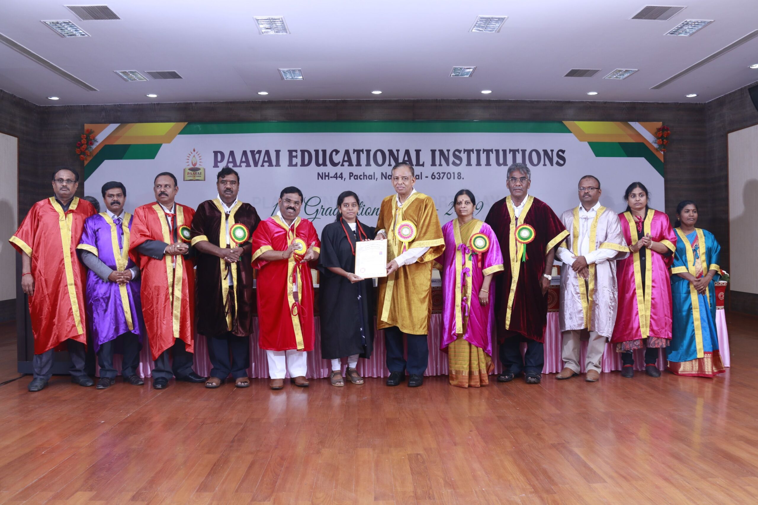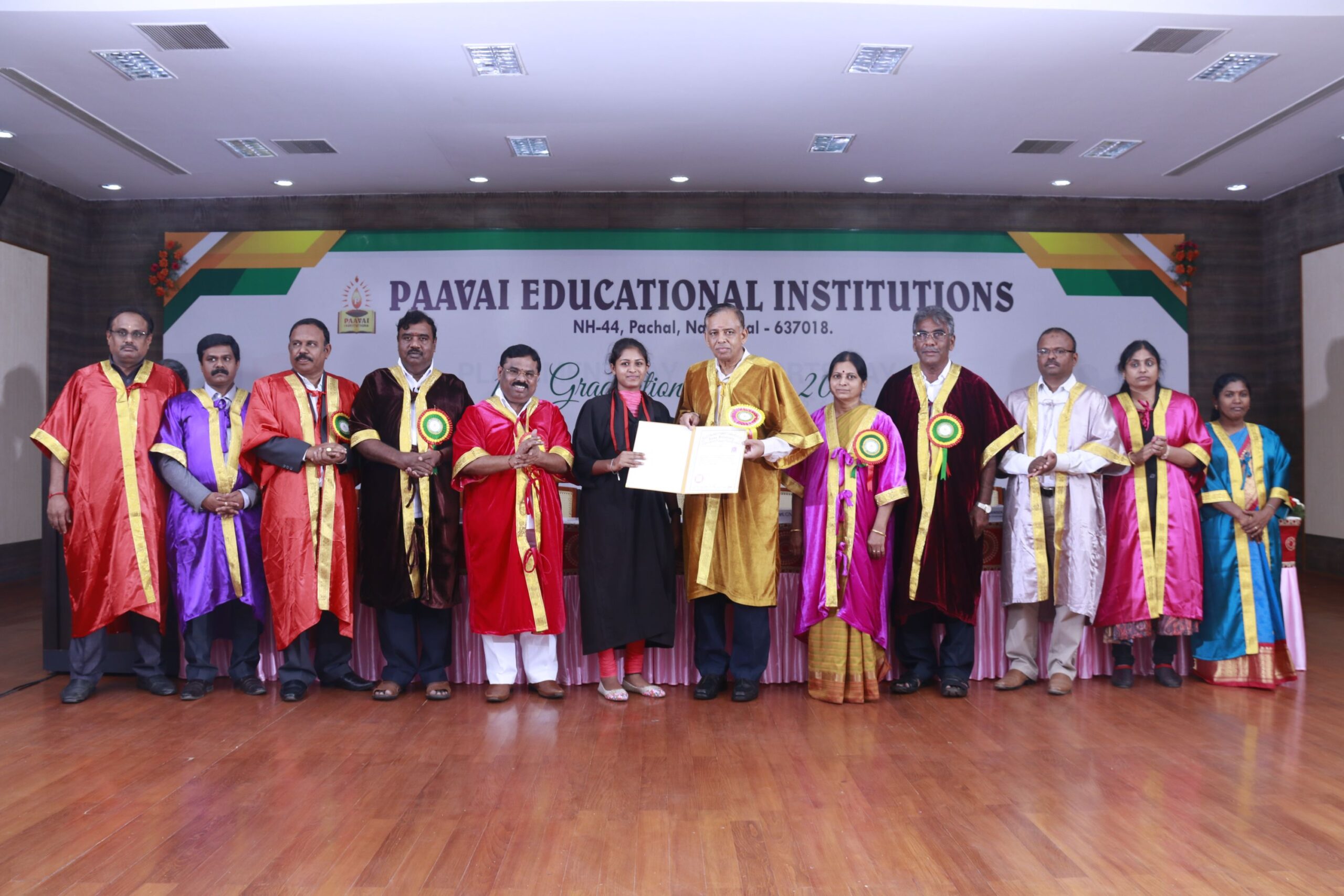 The 14th graduation ceremony for the graduates of Paavai Educational Institutions including Paavai Engineering College, Paavai College of Engineering, Pavai college of Technology, Pavai Arts and Science colleges. Shri. CA.N.V. Natarajan, The Chairman, Paavai Educational Institutions, presided over the inaugural function. Dr.P.Kulanthaivel, Vice chancellor, Periyar University, was the chief guest of the day. Smt. Mangai Natarajan, The Correspondent, Paavai Institutions, lighted the kuthuvilakku along with the dignitaries on the dias. Dr.M.Premkumar, The Principal, Paavai Engineering College, welcomed the gathering.The chief guest, in his keynote address, said, “ I am happy on seeing the graduates of Paavai Institutions who had got the opportunity to undergo world class education in high quality structure at the beautiful environment. Education and agriculture are important for all human beings as they are the vital sources of the country’s development. Countries like Japan and Germany with small landscapes and more natural disasters have recovered and achieved great growth in short term only because of Education. The best way to deal with problems and obstacles in our lives is our subtle knowledge. So, by getting degree today, begin to travel towards the new goal. Act as constructive thinkers. Make your identity and become the expert in your field so that you can make yourself a prosperous India and lead to development in the world. Be always with positive thoughts. Do not give-up on self confidence and perseverance. Congratulations to you all greatness of life”. All the graduates were awarded with degree certificates whereas the university rank holders and department toppers were awarded with gold and silver medals. Earlier, The chairman and Secretary, Paavai Institutions, presented the memento and bouquet to the chief guest. Followingly, all the new graduates were made to accept the convocation pledge. The Vice Chairman – Thiru Manisekaran, Secretary – Thiru Palanivel, Director Administrations -Dr.K.K.Ramasamy, Director Admissions – Thiru K.Senthil, Director Placements and Training – Thiru Srinivasan, Principals, Heads of various Departments, Faculty members, students and parents were present in the valedictory session of the graduation ceremony.