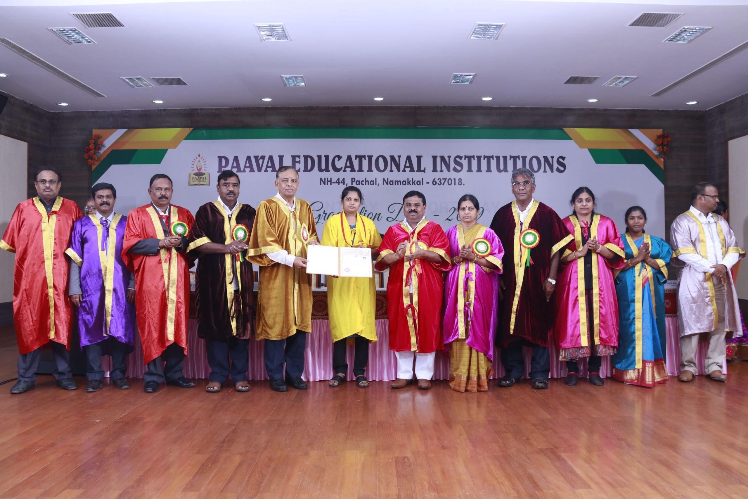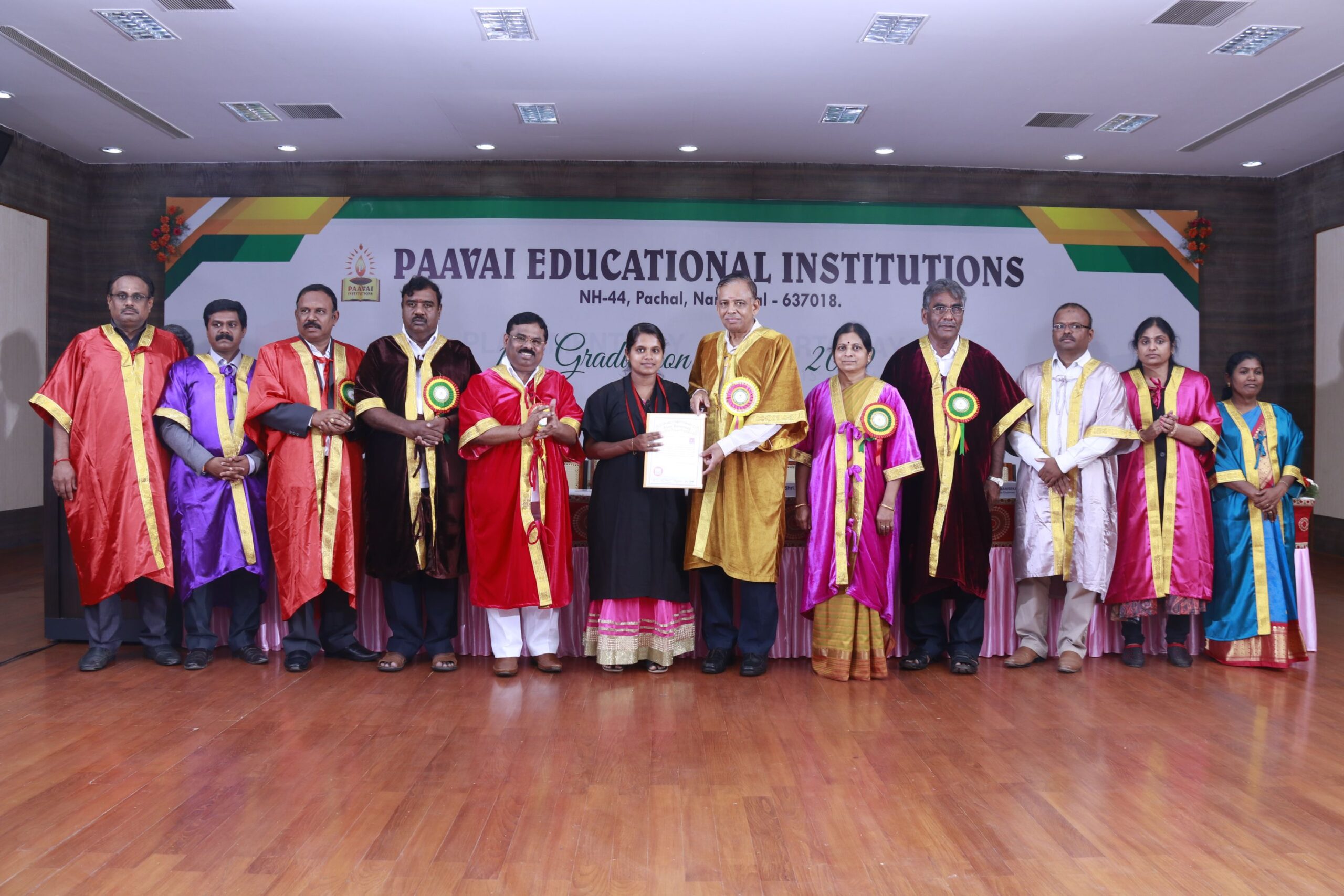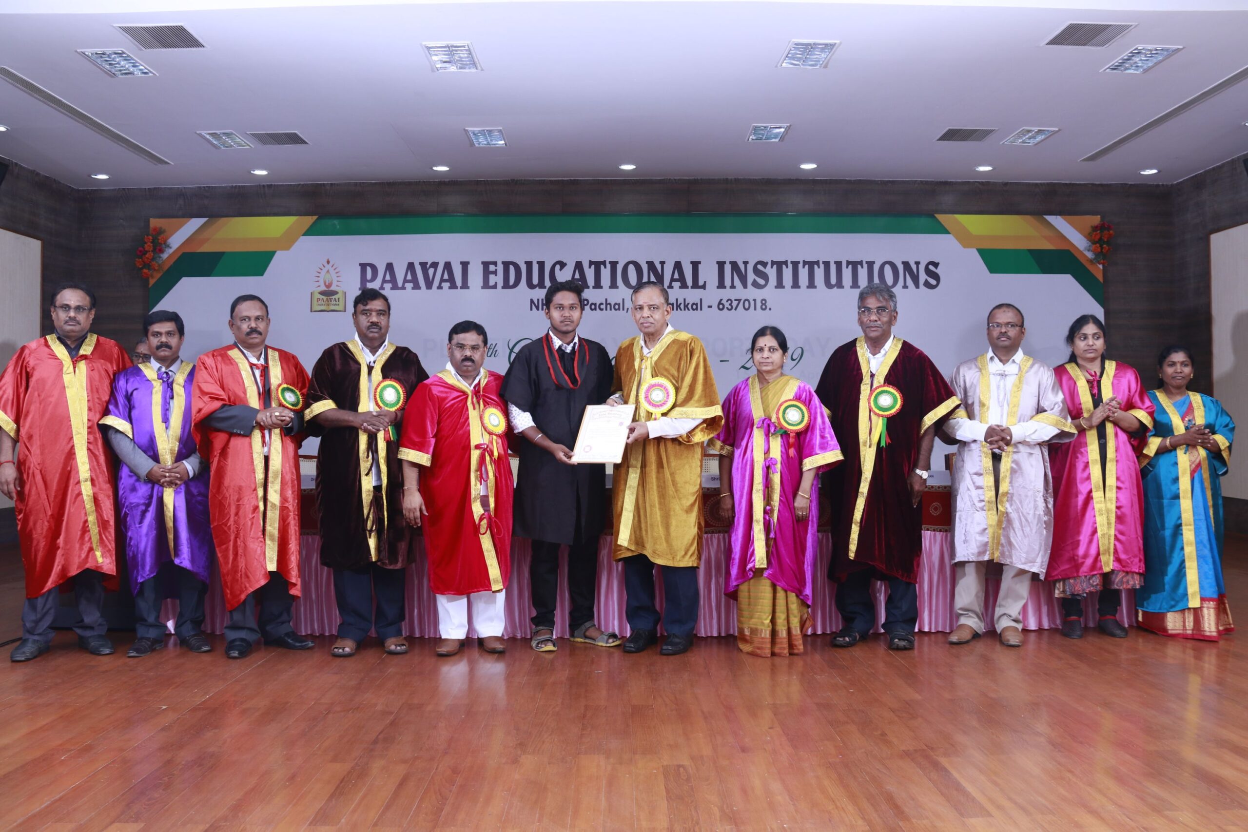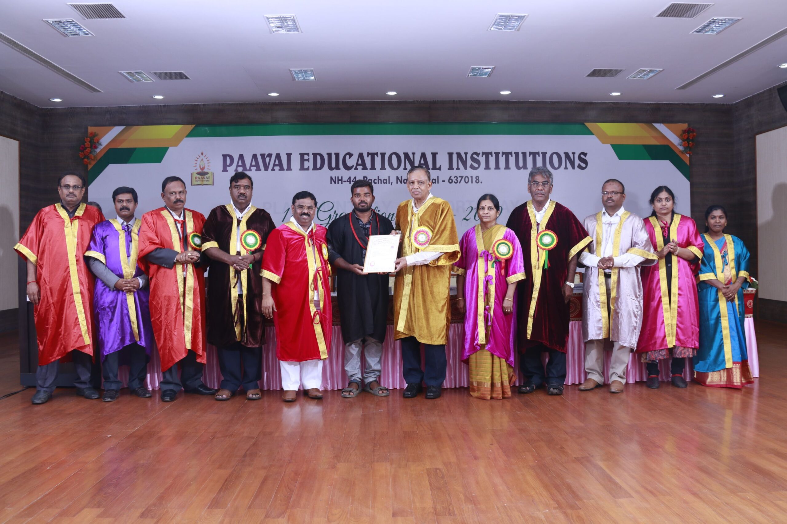 The 14th graduation ceremony for the graduates of Paavai Educational Institutions including Paavai Engineering College, Paavai College of Engineering, Pavai college of Technology, Pavai Arts and Science colleges. Shri. CA.N.V. Natarajan, The Chairman, Paavai Educational Institutions, presided over the inaugural function. Dr.P.Kulanthaivel, Vice chancellor, Periyar University, was the chief guest of the day. Smt. Mangai Natarajan, The Correspondent, Paavai Institutions, lighted the kuthuvilakku along with the dignitaries on the dias. Dr.M.Premkumar, The Principal, Paavai Engineering College, welcomed the gathering.The chief guest, in his keynote address, said, “ I am happy on seeing the graduates of Paavai Institutions who had got the opportunity to undergo world class education in high quality structure at the beautiful environment. Education and agriculture are important for all human beings as they are the vital sources of the country’s development. Countries like Japan and Germany with small landscapes and more natural disasters have recovered and achieved great growth in short term only because of Education. The best way to deal with problems and obstacles in our lives is our subtle knowledge. So, by getting degree today, begin to travel towards the new goal. Act as constructive thinkers. Make your identity and become the expert in your field so that you can make yourself a prosperous India and lead to development in the world. Be always with positive thoughts. Do not give-up on self confidence and perseverance. Congratulations to you all greatness of life”. All the graduates were awarded with degree certificates whereas the university rank holders and department toppers were awarded with gold and silver medals. Earlier, The chairman and Secretary, Paavai Institutions, presented the memento and bouquet to the chief guest. Followingly, all the new graduates were made to accept the convocation pledge. The Vice Chairman – Thiru Manisekaran, Secretary – Thiru Palanivel, Director Administrations -Dr.K.K.Ramasamy, Director Admissions – Thiru K.Senthil, Director Placements and Training – Thiru Srinivasan, Principals, Heads of various Departments, Faculty members, students and parents were present in the valedictory session of the graduation ceremony.