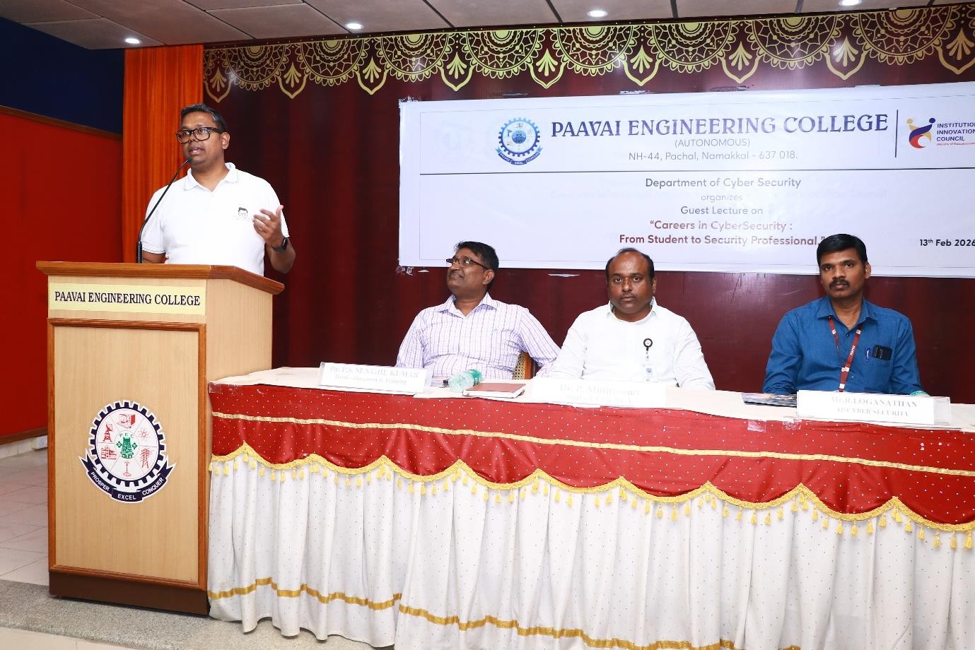 The guest lecture on “Careers in Cybersecurity: From Student to Security Professional” organised by the Department of Cybersecurity at Paavai Engineering College began with a prayer song rendered by Keerthi and Birundha. The prayer created a peaceful and positive atmosphere, invoking blessings for the program’s success and setting a respectful tone for the session.