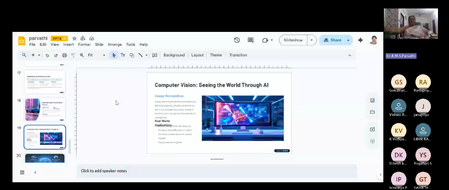 The event featured Dr. R.M.S. Parvathi, Dean and Head, Computer Science and Engineering, Sri Ramakrishna Institute of Technology, Coimbatore, as the esteemed speaker. Drawing the session by sharing her professional journey in the field of Deep Learning and Next-Generation AI, explaining how she explored real-world AI applications to solve complex challenges across various industries.