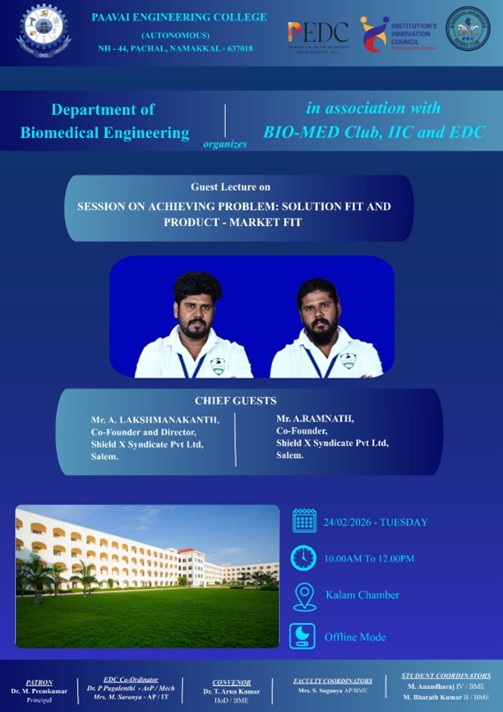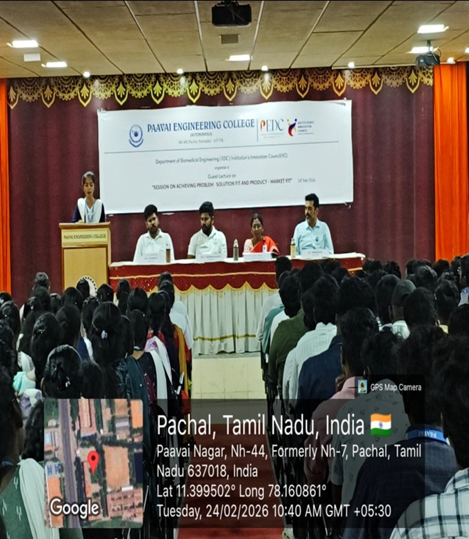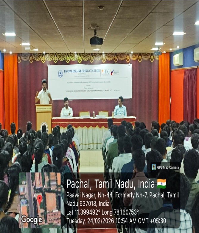 The Paavai Institution’s Innovation Council, Paavai Engineering College organized a Guest lecture on “Session on Achieving Problem: Solution Fit And Product-Market Fit” on 24TH Feb, 2026 with Mr.A.Lakshmanakanth and Mr.A.Ramnath, Co-Founders, Shield X Syndicate Pvt Ltd, Salem, Tamil Nadu, India, as the resource persons. This Guest Lecture was coordinated by Dr.T.Arunkumar along with Mrs.S.Suganya and other faculty members. Dr.K.SELVI, Dean-Academic, Paavai Engineering College delivered the Presidential Address on the occasion. Ms.R.Abarna, Third Year, Biomedical engineering, Paavai Engineering College delivered the Welcome Address on the occasion. Ms.K.Muthukarpagam, Second year, Biomedical engineering student introduced the Guest Speakers Mr.A.Lakshmanakanth and Mr.A.Ramnath, Co-Founders, Shield X Syndicate Pvt Ltd, Salem, Tamil Nadu, and India.