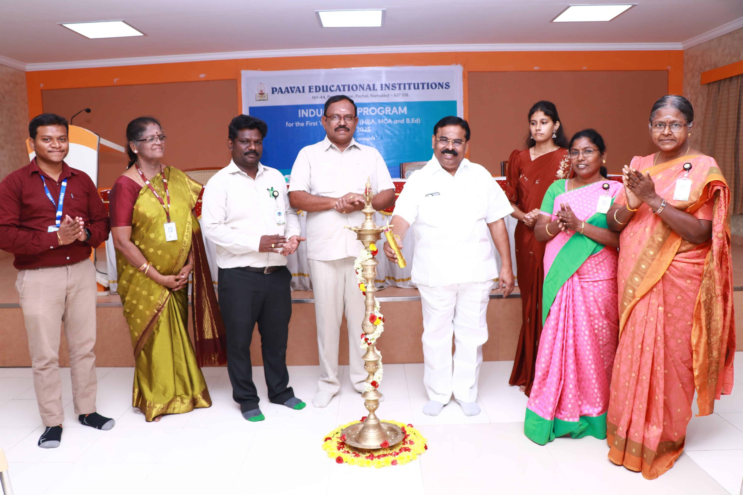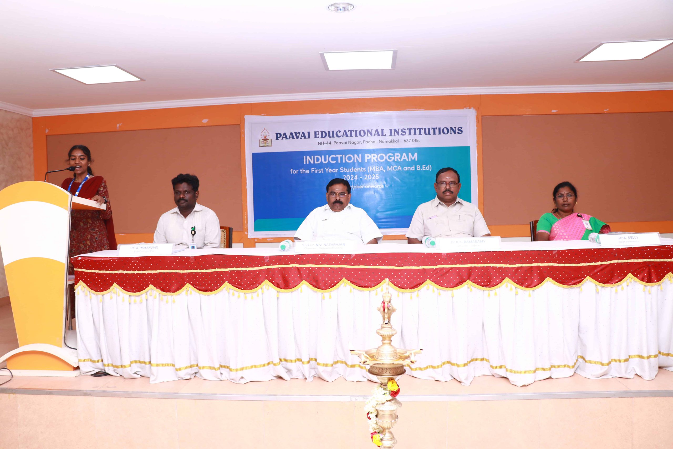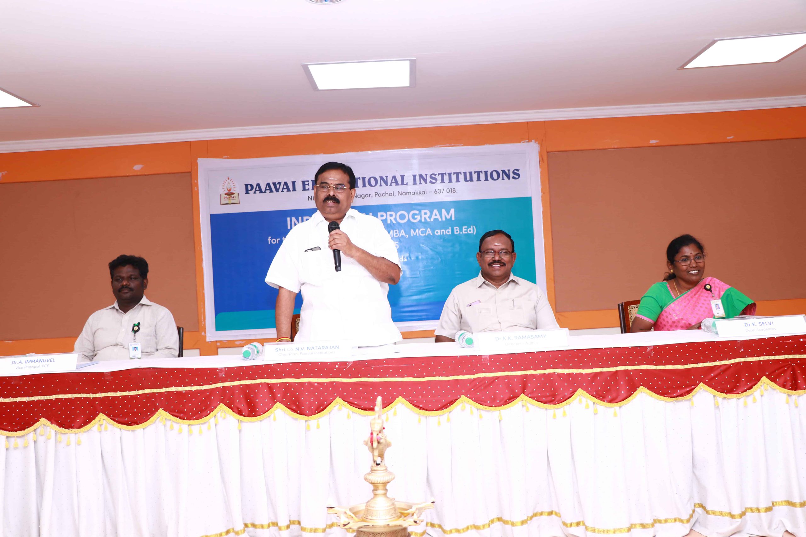 Induction Programme for the first year MBA , MCA and B.Ed students of Paavai Educational Institutions was held from 21.10.2024 to 25.10.2024 at Brilliant Hall. The Inauguration of the Induction programme was held at Brilliant Hall on 25.10.2024 at 10.00 am. The programme started invoking God’s benevolent blessings through the prayer song, followed by lighting of the kuthuvilakku. Ms.P.Shalini, I year, MBA, Paavai Engineering College welcomed the gathering. Shri.CA.N.V.Natarajan Chairman, Paavai Educational Institutions delivered the Inaugural Address in which cited the history of Paavai and said that Paavai was the result of a dream of a young student who through strenuous and persistent efforts established the Paavai Educational Institutions. He also emphasized on virtues of love, care and concern for our fellow beings. He added that the passion for the knowledge and the pursuit of academic excellence will enable students to emerge victorious in their ongoing academic journey. Sir stressed on how the professionals from MBA, MCA, and B.Ed have to contribute productively and add value to our nation’s progress. In his address he focused on learning opportunities for students and ignited in students the passion for learning with enriching academic experiences