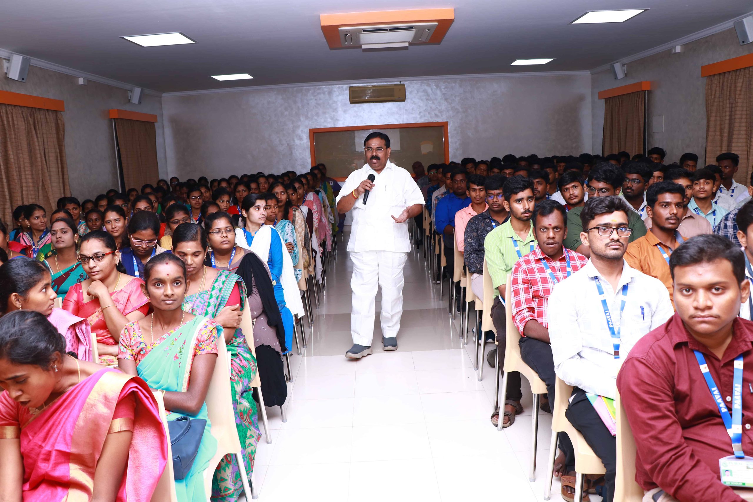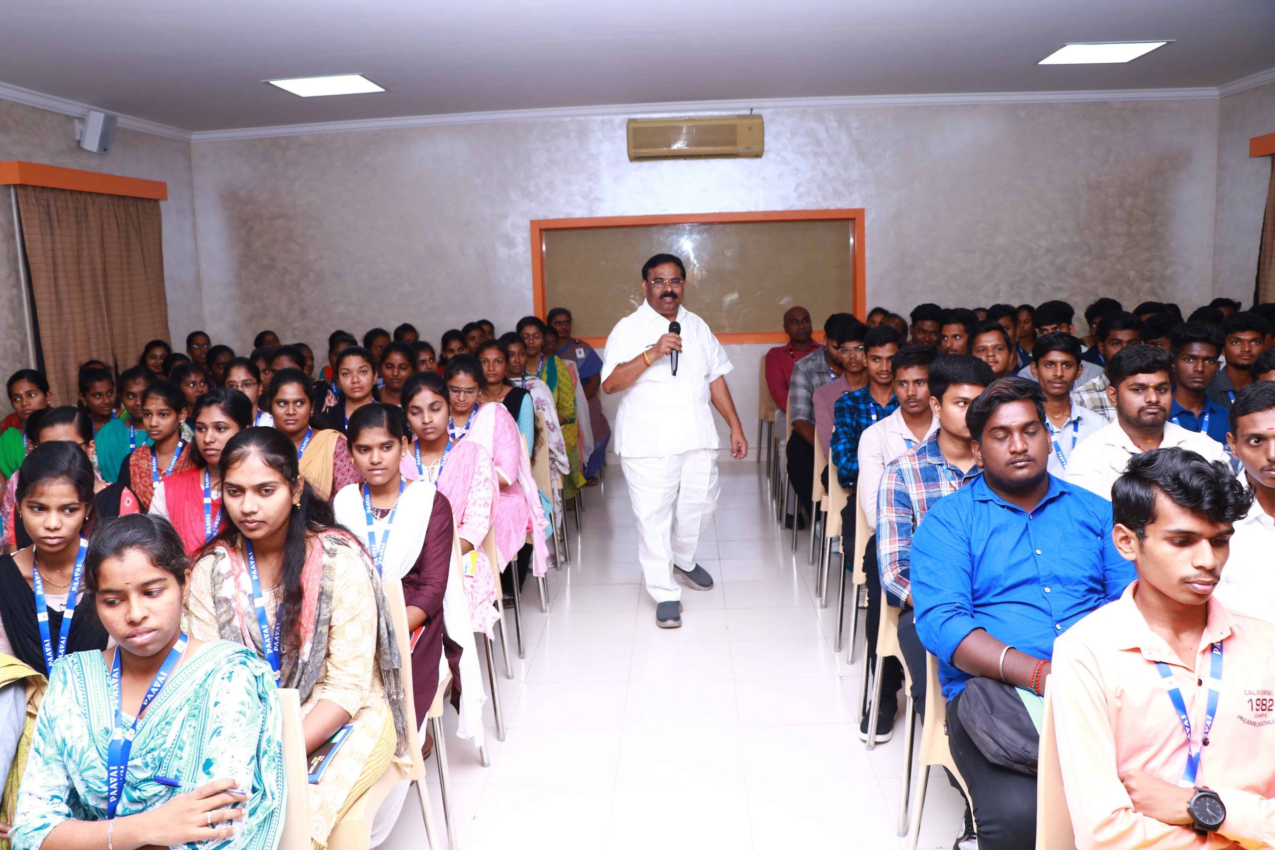 Shri.CA.N.V.Natarajan Chairman, Paavai Educational Institutions delivered his speech on the title “Goal Setting”. In his session, first and foremost, he interacted with the students about the need of the Goal Setting Programme. He quoted Abdul Kalam sir’s important message during his visit to Paavai – 1. Aim before age 20, 2. Acquire Continuous Knowledge, 3. Hardwork and 4. Perseverance. Sir advised students to abide by the same. He defined goals and explained the importance of preparation to accomplish their goals. He correlated his life incident of setting a goal at the age 17 and how he could make that come true through hard and smart work. Sir emphasized the importance of setting a goal and elaborated the seven important points for Goal setting. Further he explained what happens when students proceed without setting goals for their future. He expounded on fixing ‘SMART’ goals which will propel students towards success. He elucidated the seven steps for goal setting and also instructed everyone to create a vision of who they want to be in the next ten years. He listed the six components to sustain victory namely genuine goals, right pathway, constant and continuous effort, hard and smart work, high discipline and God faith. He also narrated compelling stories of two friends, one of them who had high resources but because of lack of goals faced total failure in the end. The other friend who through his goals and persistent hard work was crowned with glory and success in the end. Finally, Sir concluded by stating that,” set your goal, shape your future and be a winner always”.