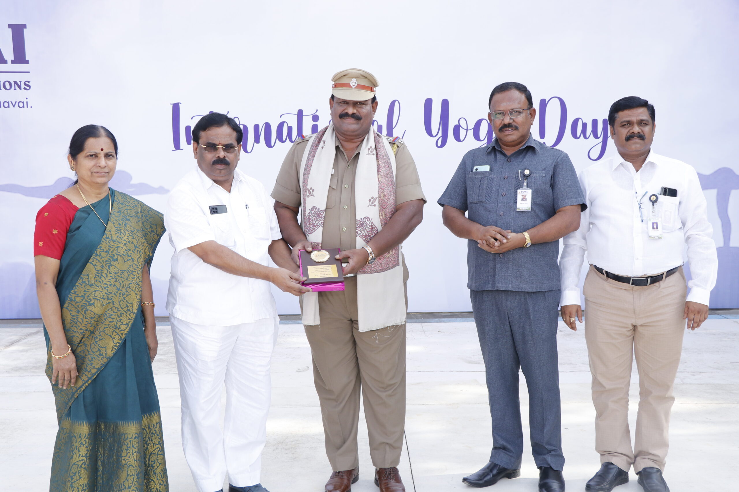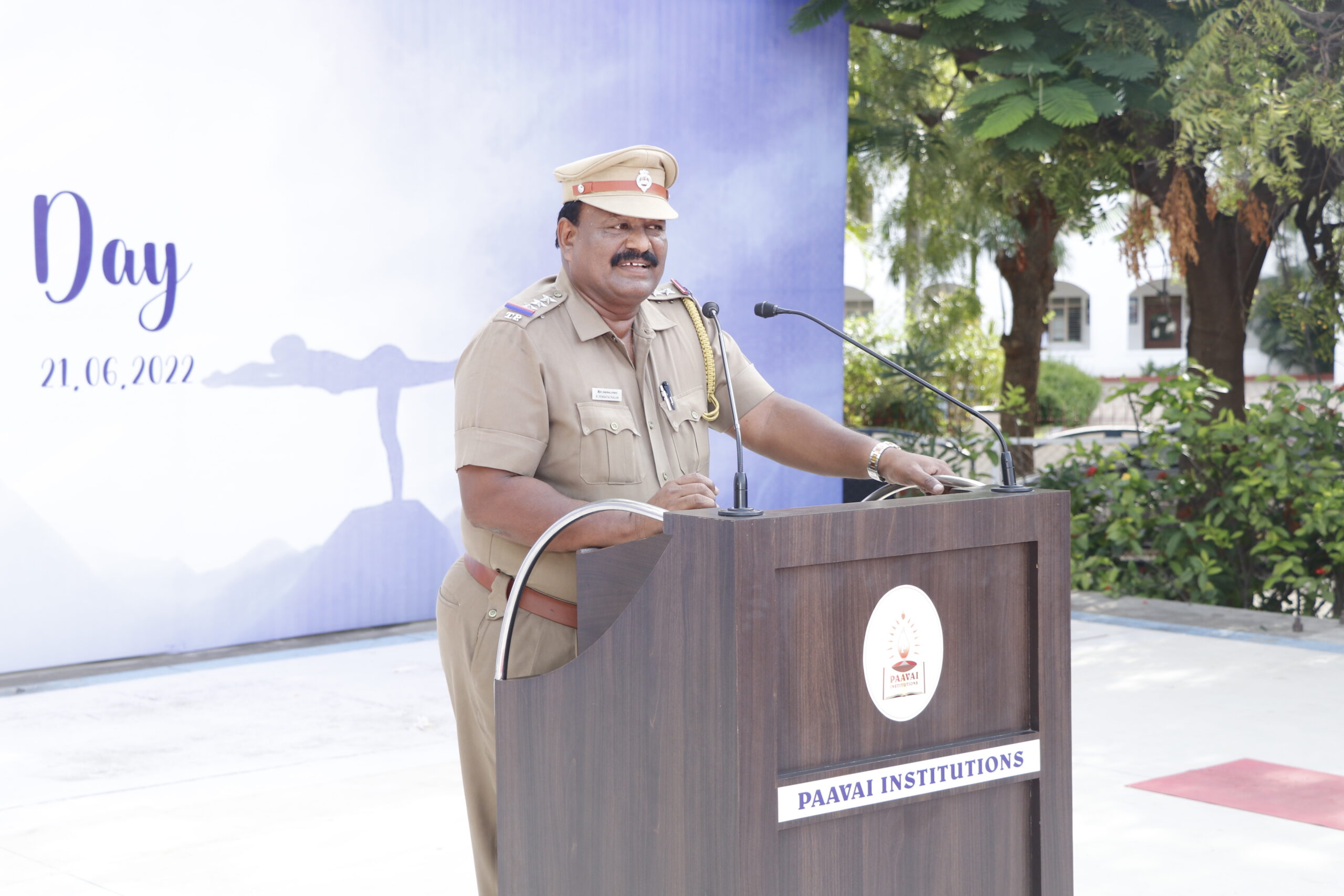 Mr.K.Venkadachalam, Inspector of Police, Pudhuchatram, was the chief guest for the function. The session started on a divine note with a prayer song. Ms.Nithya Mahima Gracy, III year B.E. (EEE) welcomed the gathering. The function was presided over by Shri.CA.N.V.Natarajan, Chairman, Paavai Educational Institutions. The chief guest, Mr.K.Venkadachalam, in his special address, gave the importance and benefits of yoga in our life. He insisted the students to practice yoga daily and it helps us to prevent all diseases from our body.