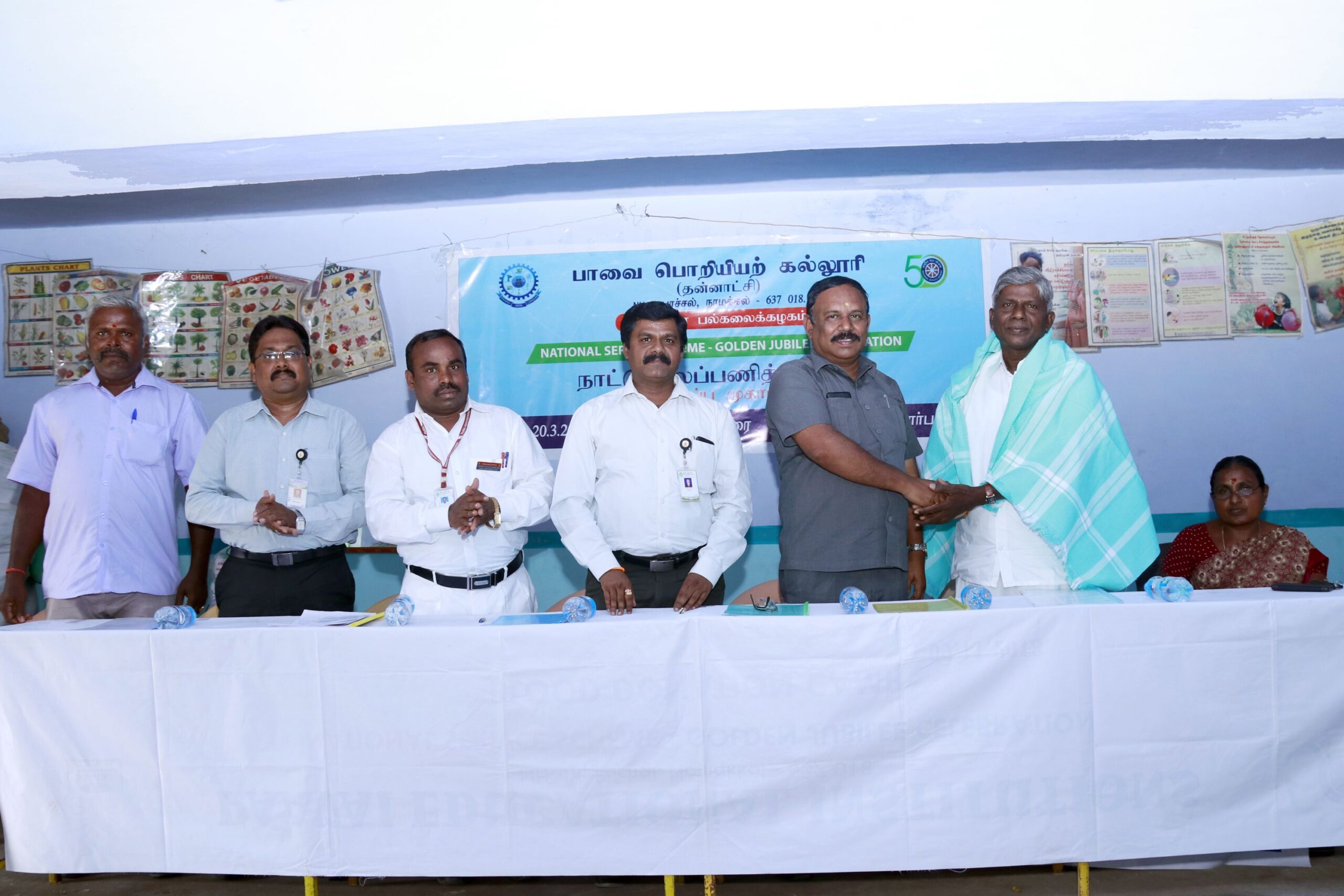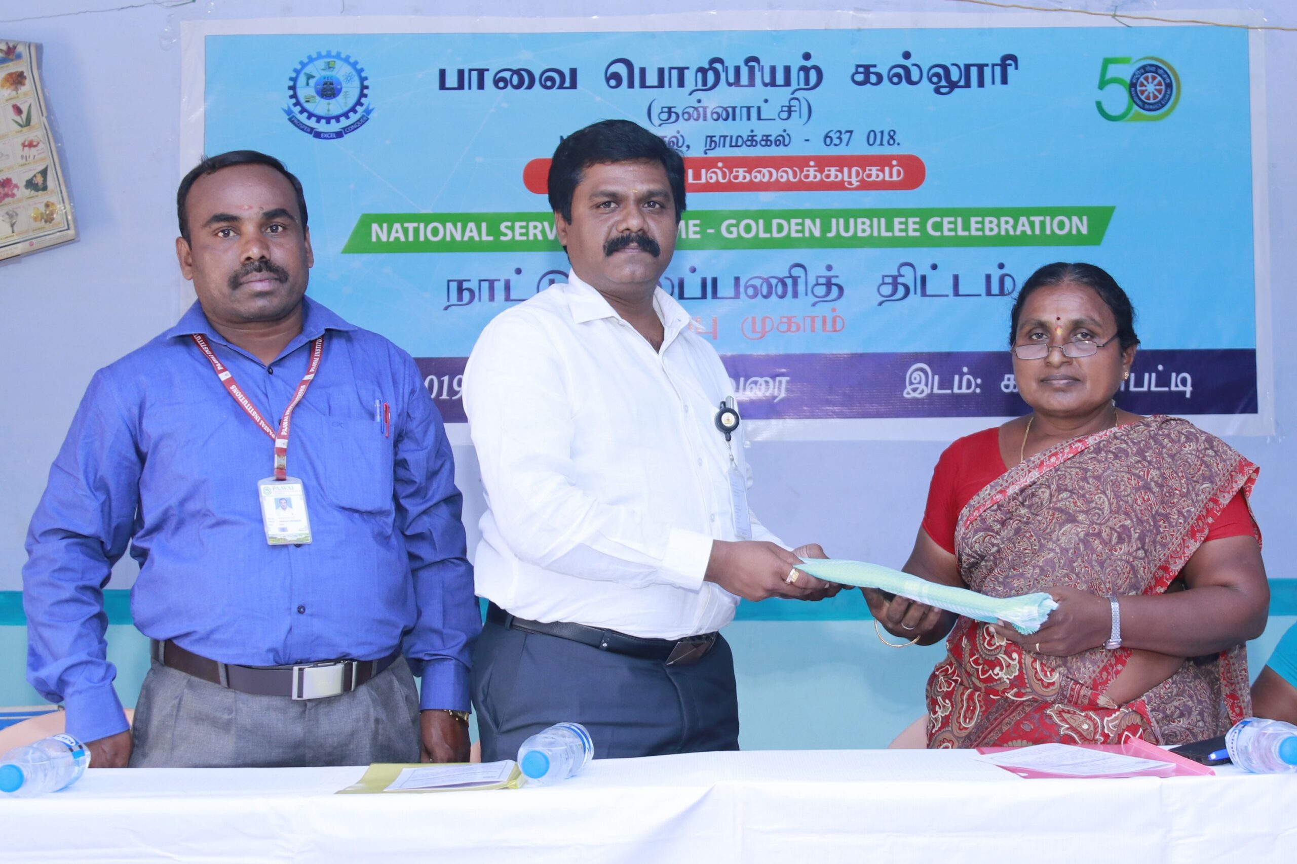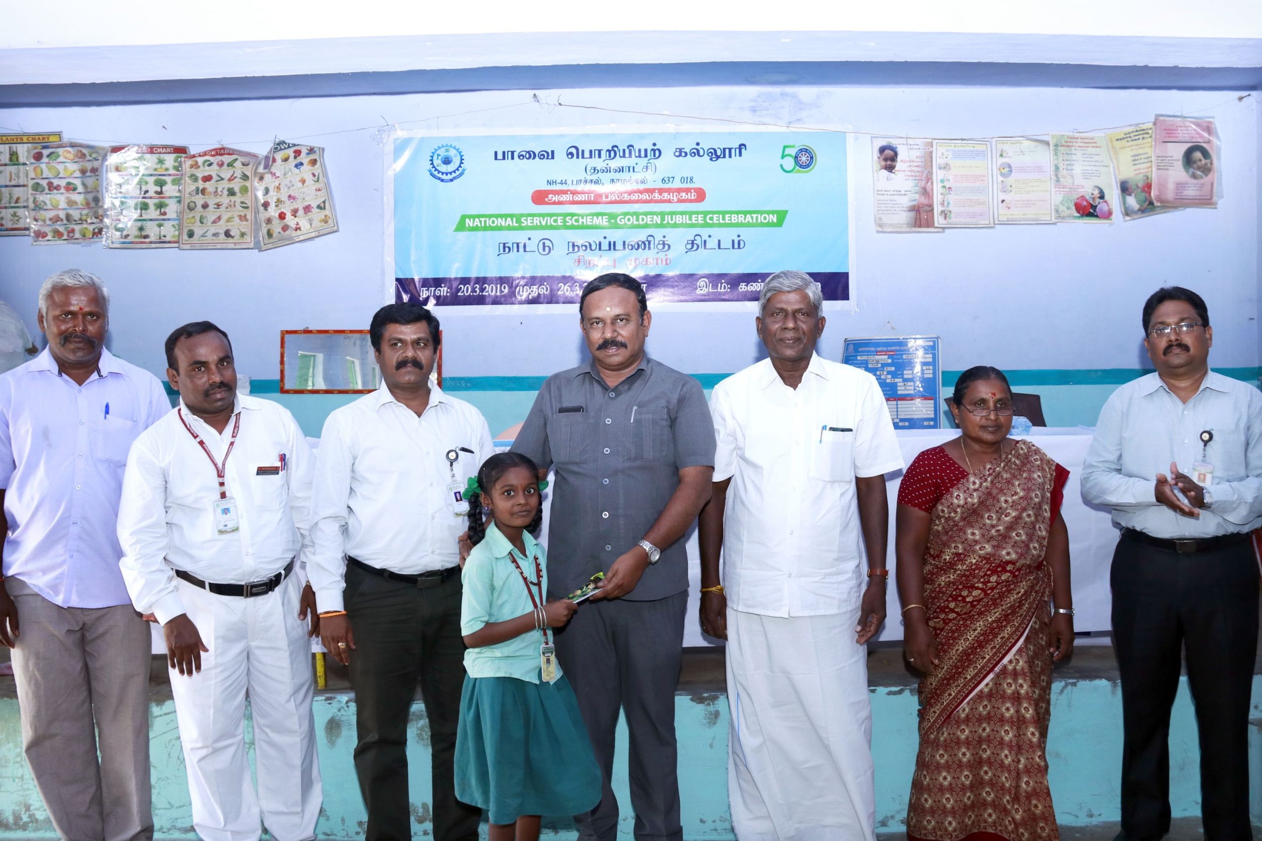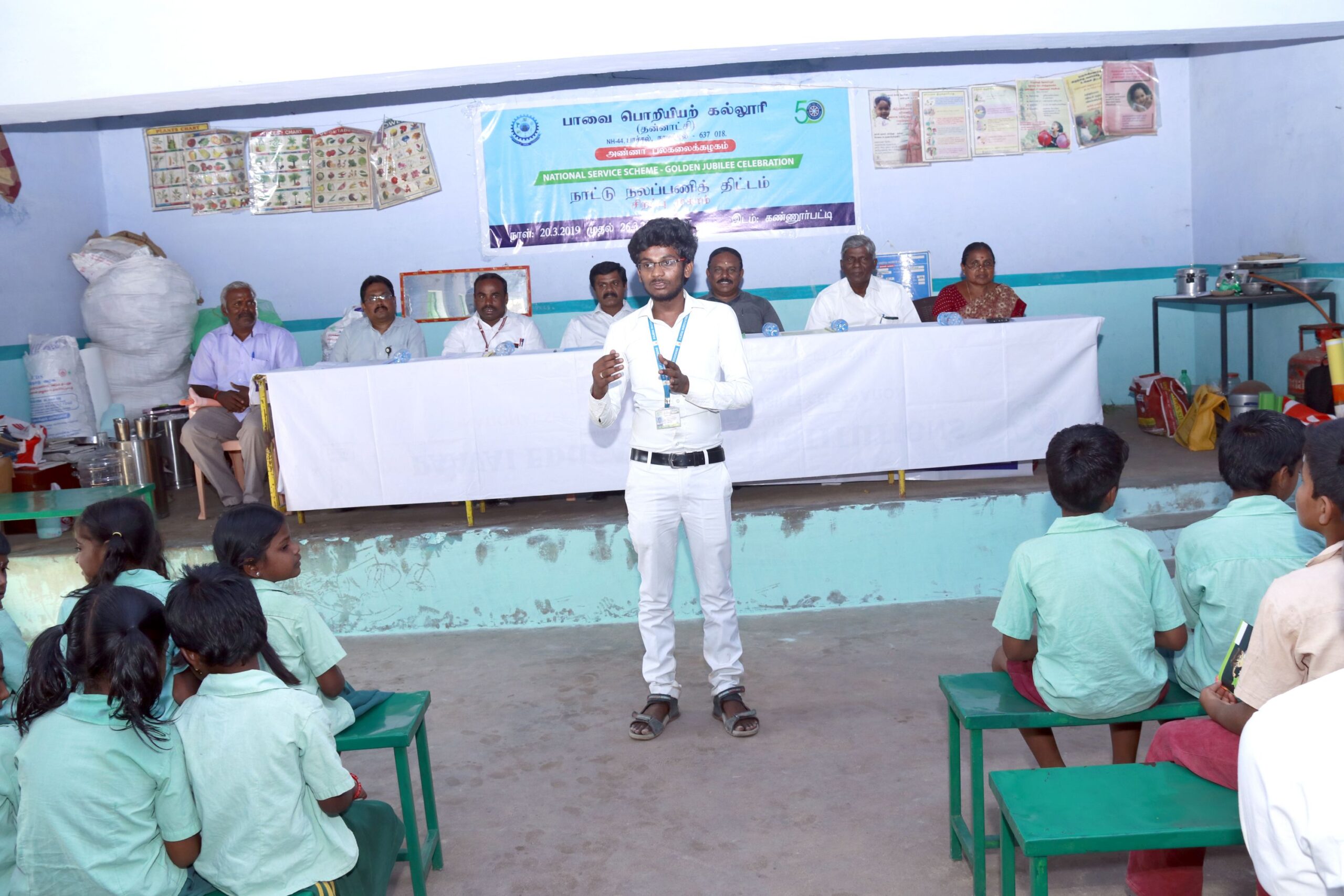 Paavai Engineering College organised the Nss Camp at Kannurpatti on 20.03.2019 to 26.03.2019.We started the inauguration of the Special Camp at 3 p.m. Dr.M.Premkumar, Principal, Paavai Engineering College, Namakkal, was the chief guest and he delivered a special speech to the NSS volunteers. He discussed the various factors which lead to the depletion of natural resources. He appreciated the students for joining the NSS scheme and encouraged them to involve themselves in several social service practices. Mrs.R.Selvam, Head Mistress, Government Middle School, Kannurpatti, felicitated the gathering. After inaugural function, we had group discussion with the public as well as with the Ex. Panchayat President V.Palanivel about the activities of the camp.We whitewashed the Anganwadi school compound walls and repainted the Samuthaya Kudam and Government Middle School walls at Kannurpatti.A seminar on “Let’s Adore the Feminine” was given by Dr.K.Selvi, Dean Academics, Paavai Engineering College. The students and the public participated in the seminar.We conducted various competitions to the school students like Drawing, Essay writing, Musical chair, Dancing and Singing to encourage their talents.A seminar on the title “Natural foods and its Importance” was given by Dr.P.Muthusamy, Head, Department of Master of Computer Applications, Paavai Engineering College. The students and the public were the beneficiaries.A free Medical camp was conducted by the Doctors and team members of Pudhuchattram and Vinaiteerthapuram Government Hospitals. More than 100 persons were benefitted by this activity.A seminar on “Life without plastic is a life of peace” was given by Dr.S.Vadivel, Head, Department of Physics, Paavai Engineering College. The students and the public were benefited.We conducted Plastic awareness rally to prevent the usage of polythene bags and plastic bottles. We gave the awareness about effects of plastic usage on human health and environment to the public. We issued the cloth bags to the public. We organized street play to know the effects of plastics and awareness was created about their Right to vote for their country during elections.A seminar on the title “Empowering Youth Parliament and Votes” was given by Dr.V.Manivannan, Assistant Professor, Chemistry, Thiruvalluvar Government Arts and Science College, Rasipuram. The students and the public were benefited.We planted the saplings around the school premises, streets and the lakes. We also planted saplings at every house.A seminar on “Cyber Crimes and Preventions” was given by Dr.R.Arangasamy, Head, Department of Electronics and Communication Engineering, Paavai Engineering College. The students and the public were benefited.The valedictory function for the camp was organized by 3’o clock in the evening The function was presided over by Dr. K.K.Ramasamy, Director-Administration, Paavai Educational Institutions and Dr.M.Premkumar, Principal, Paavai Engineering College. Dr.K.K.Ramasamy, in his Presidential address, stressed the students to gather the new ideas and create innovations to do service to the society. The Report of the special camp was presented by Mr.C.Rathnakumar, NSS Programme officer, Paavai Engineering College. Mr.V.Palanivel, Ex. Panchayat President, Kannurpatti and Mrs.R.Selvam, Head Mistress, Government Middle School, Kannurpatti, felicitated the gathering. Prizes were given to the school children who won the competition like Essay writing, Oratorical, Singing, Drawing etc. Finally Dr.D.R.P.Rajarathinam, Head, Department of Mechatronics, Paavai Engineering College delivered the vote of thanks.