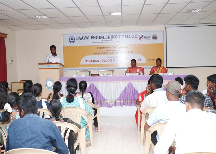 One day seminar on the title “From Ideas to Success:Tips for Startups” was organized by the Department of Civil Engineering jointly with Institution’s Innovation Council (IIC -PEC), Paavai Engineering College (Autonomous) on 21.04.2023. Ms.R.Sharumathi, Third year student welcomed the gathering. Dr.M.Premkumar, Principal, Paavai Engineering College delivered his presidential address on this event, he elaborated the importance of startups.
