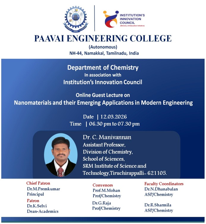 The Department of chemistry was organized an online Guest Lecture about “NANOMATERIALS AND THEIR EMERGING APPLICATIONS IN MODERN ENGINEERING” on 12th March 2026 at 06.30 p.m. through the Microsoft Teams platform. The Resource person was Dr.A.Kumaravel, Associate Professor, PSG Institute of Technology and Applied Research, Coimbatore. The welcome address and chief guest introduction was given by Mr.F.Kewin/Iyr CSE.