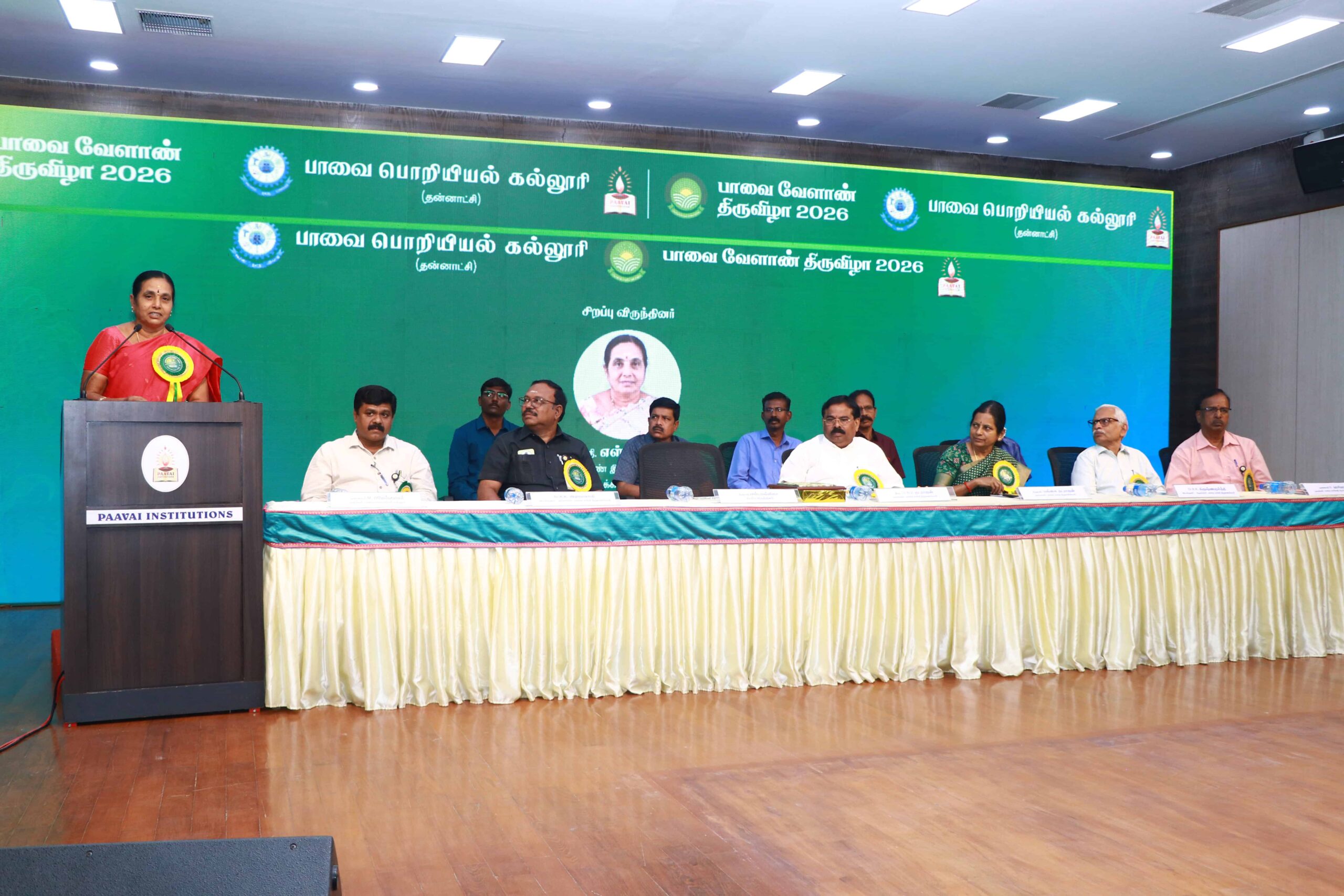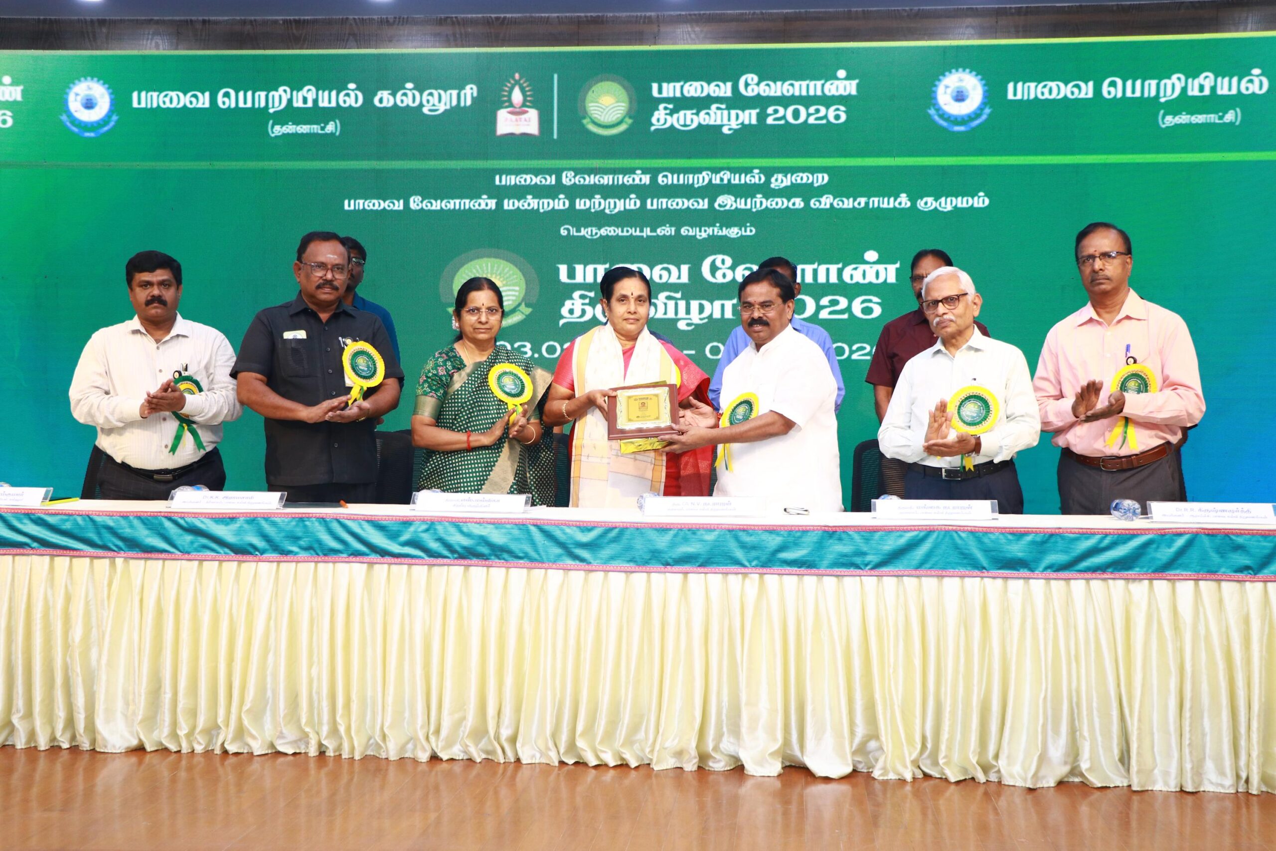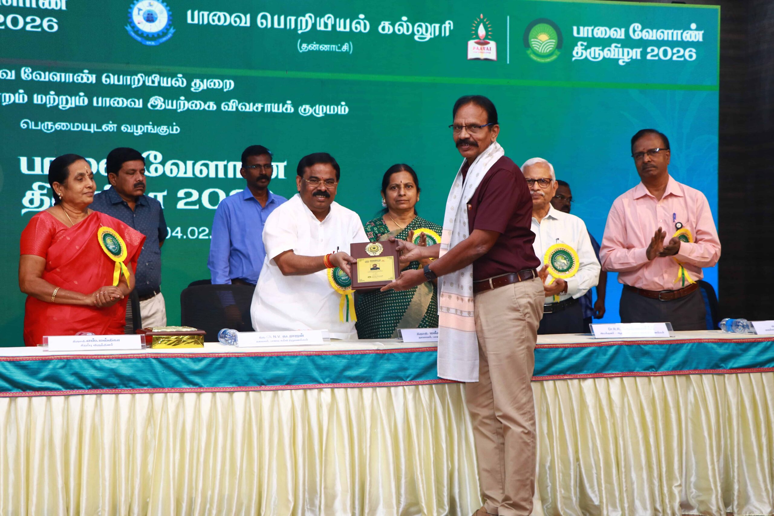 The Department of Agricultural Engineering, Paavai Engineering College, Namakkal, successfully organized the two-day Paavai Velaan Tiruvizha 2026 at Anandha Arangam on February 3 and 4, 2026, with the objective of promoting sustainable, technology-driven, and farmer-centric agricultural development, witnessing active participation from farmers, scientists, academicians, agri-entrepreneurs, startups, and students. The programme commenced (03.02.2026) with a welcome address by Dr. K. K. Ramasamy, Director – Administration, Paavai Institutions, followed by the Presidential Address by CA N. V. Natarajan, Chairman, Paavai Institutions, who emphasized the integration of modern technologies with traditional farming practices for Nation development, after which the Chief Guest, Mrs. S. Malliga, Joint Director of Agriculture, Namakkal, delivered her address presenting detailed statistics on the farming scenario in Namakkal district, government schemes, and major initiatives beneficial to farmers, and an inspiring address by Mrs. Mangai Natarajan, Correspondent, Paavai Institutions, highlighting inclusive growth and youth involvement in agriculture.