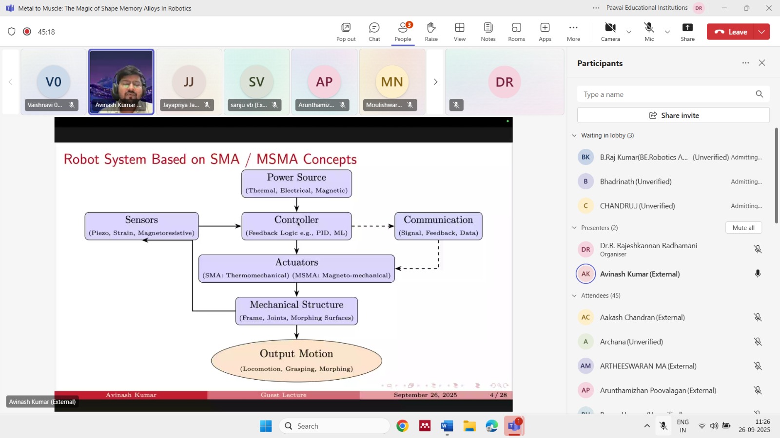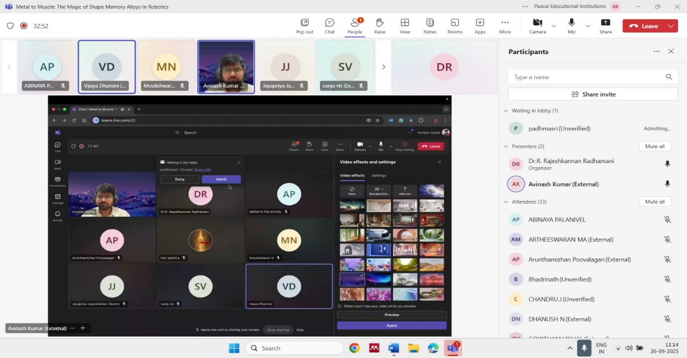 The Department of Robotics and Automation, Paavai Engineering College, organized an online guest lecture on “Metal to Muscle: The Magic of Shape Memory Alloys in Robotics” on 26th September 2025 through Microsoft Teams. The resource person for the session was Dr. Avinash Kumar, R&D – ITQ Engineer II, General Mills, Powai, Mumbai. The program was coordinated by Dr. R. Rajeshkannan and Mr. K. Mohanraj, under the guidance of the Convener, Dr. V. Subburam, HoD/R&A, and Patron, Dr. M. Premkumar, Principal.