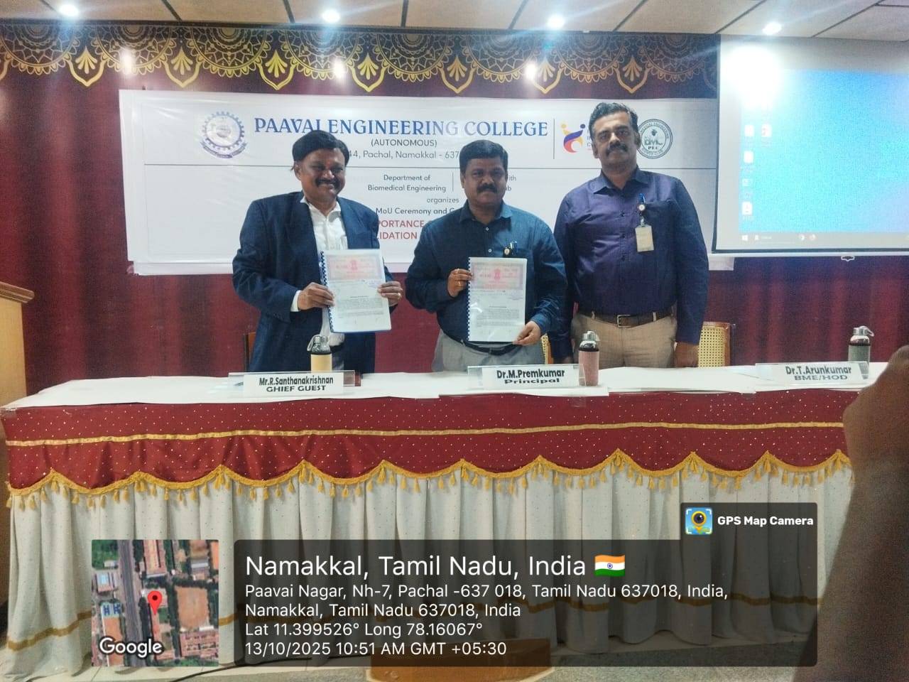 The Department of Biomedical Engineering conducted a guest lecture and MoU ceremony on the topic “Importance of Calibration and Validation in the Medical Industry” on 13.10.2025. The session was delivered by Mr. R. Santhanakrishnan, Managing Director, Vanavil Calibrations Pvt. Ltd., Salem, who highlighted the significance of calibration and validation in the medical industry.