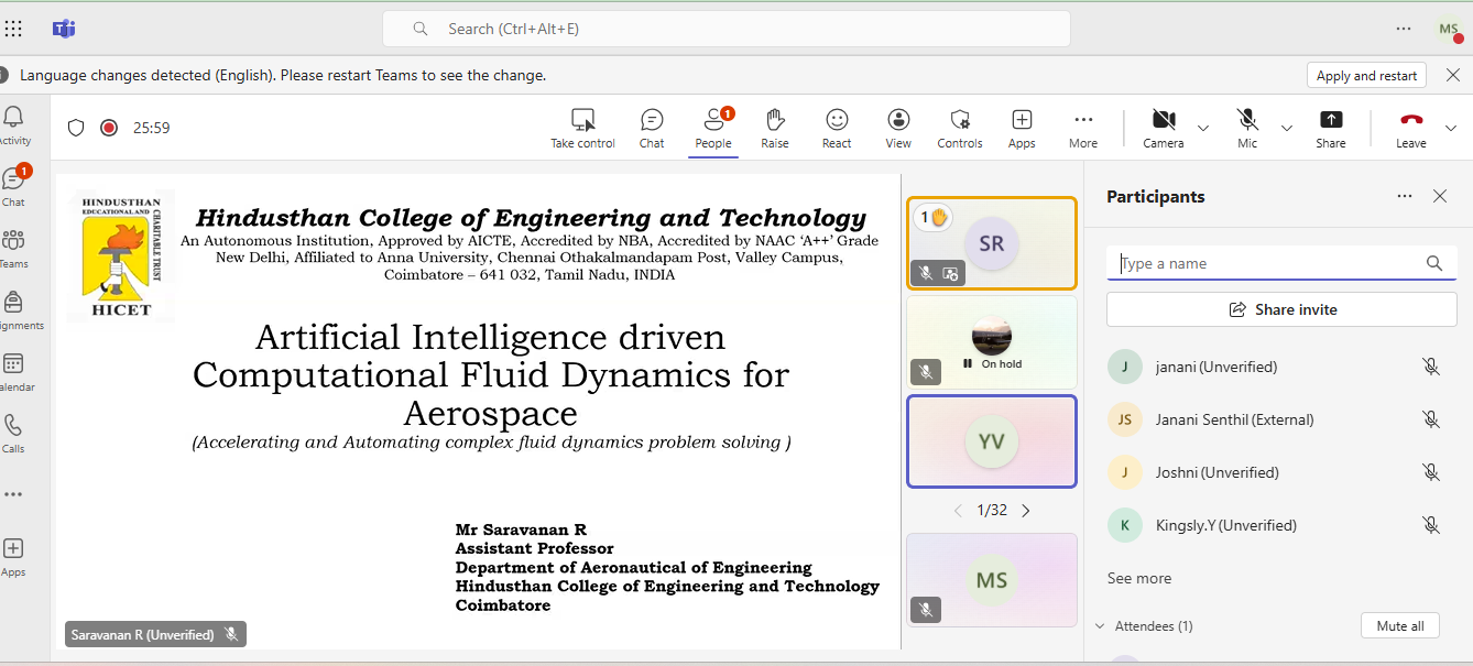 The Department of Aeronautical Engineering, Paavai Engineering College, organized an online guest lecture on the topic “Artificial Intelligence Driven Computational Fluid Dynamics for Aerospace” on 14th October 2025 from 10.00 a.m. to 11.00 a.m. The objective of the session was to provide students with an in-depth understanding of how Artificial Intelligence (AI) can be effectively integrated with Computational Fluid Dynamics (CFD) to enhance aerodynamic analysis and design efficiency in the aerospace domain.