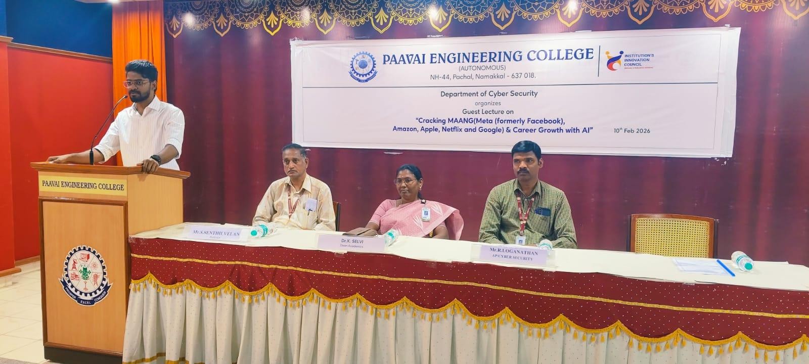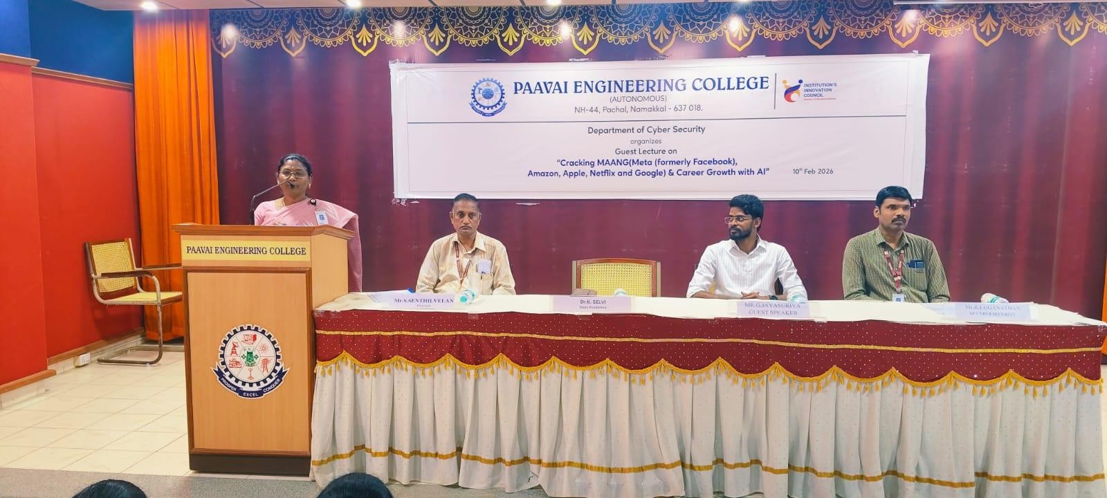 The Department of Cyber Security organized a Guest Lecture on the topic “Cracking MAANG & Career Growth with AI” on 11.02.2026 at Kalam’s Chamber.
