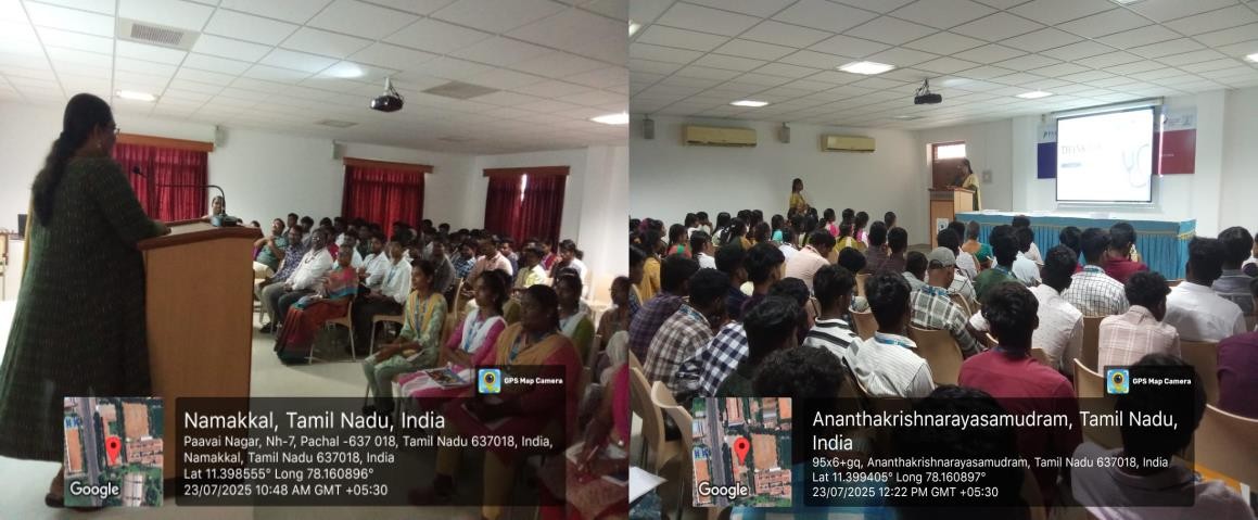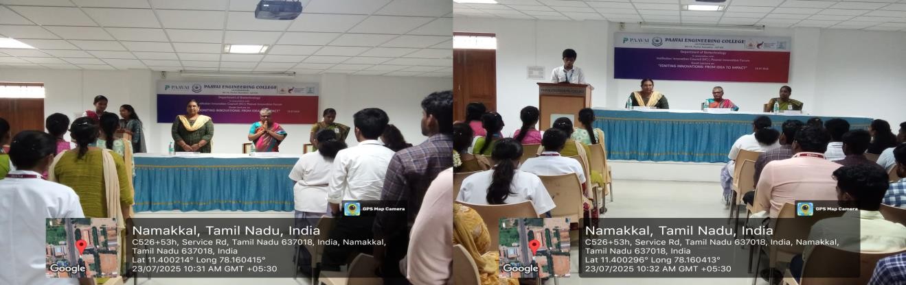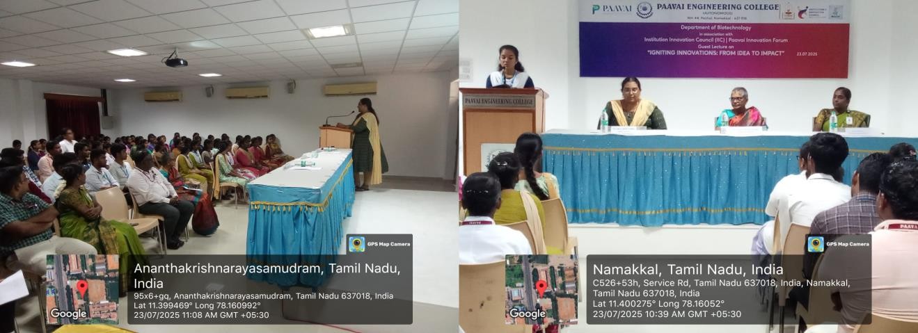 The Department of Biotechnology at Paavai Engineering College hosted an enlightening guest lecture on “Igniting Innovations: From Idea to Impact” on July 23, 2025, at Bright Hall, PIF-PEC Campus. The event was held under the leadership of Dr. C. Nirmala, Head of the Department, and was meticulously coordinated by Mr. K. Vignesh, Assistant Professor.