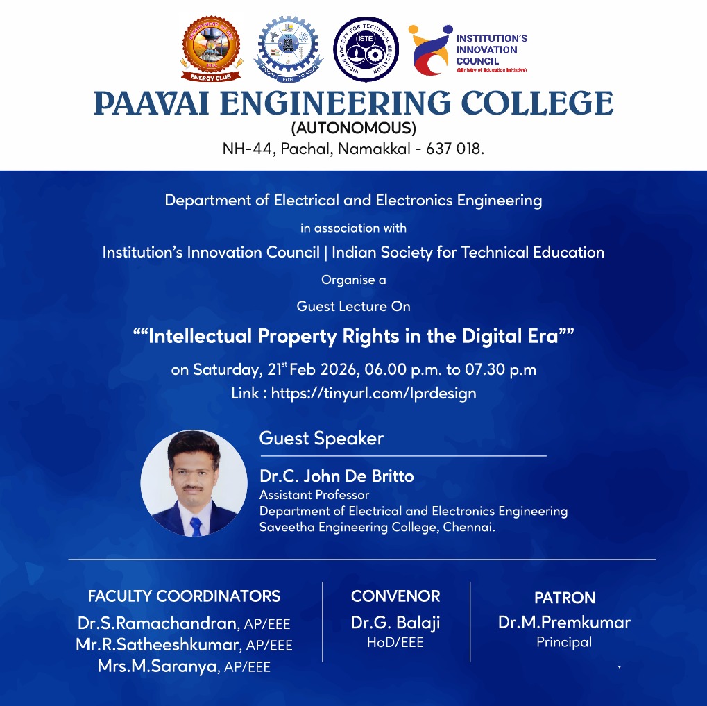 The Department of Electrical and Electronics Engineering, in association with the Institution’s Innovation Council (IIC) and Indian Society for Technical Education (ISTE), organized an enlightening Guest Lecture on “Intellectual Property Rights in Digital Era” on Saturday, 21st February 2026. The session aimed to create awareness about intellectual property protection and ethical practices in research and innovation.