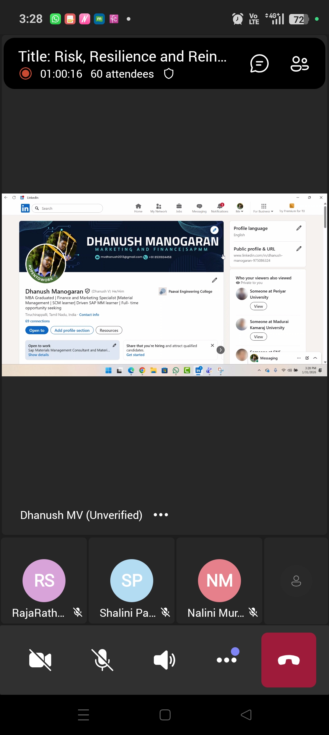 The guest lecture titled “Risk, Resilience and Reinvention” was delivered by Mr. M. V. Dhanush, Admin, Red Chilli Family Restaurant, and a proud alumni of Paavai Engineering College (MBA, Batch 2023–2025). The programme was conducted on 31 January 2026 from 2:30 PM to 3:30 PM through online mode with the objective of enriching students’ academic knowledge through alumni industry interaction. The session focused on contemporary business challenges and emphasized the importance of risk management, adaptability, and continuous reinvention for sustainable organizational growth.