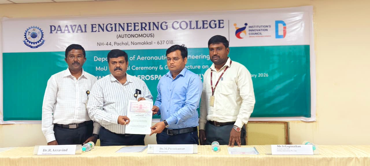 The Department of Aeronautical Engineering at Paavai Engineering College (Autonomous), in strategic association with the Institution’s Innovation Council, successfully conducted an MoU Renewal Ceremony and Guest Lecture on January 29, 2026. Held at the CUTE Hall, the event served as a platform to bridge academic theory with industrial application, specifically focusing on the theme of “AI-Driven Aerospace Assembly”. The session commenced at 10:00 AM with a formal Welcome Address by Ms. Devadharshini S., a second-year B.E. Aeronautical Engineering student, who set a professional tone for the proceedings.