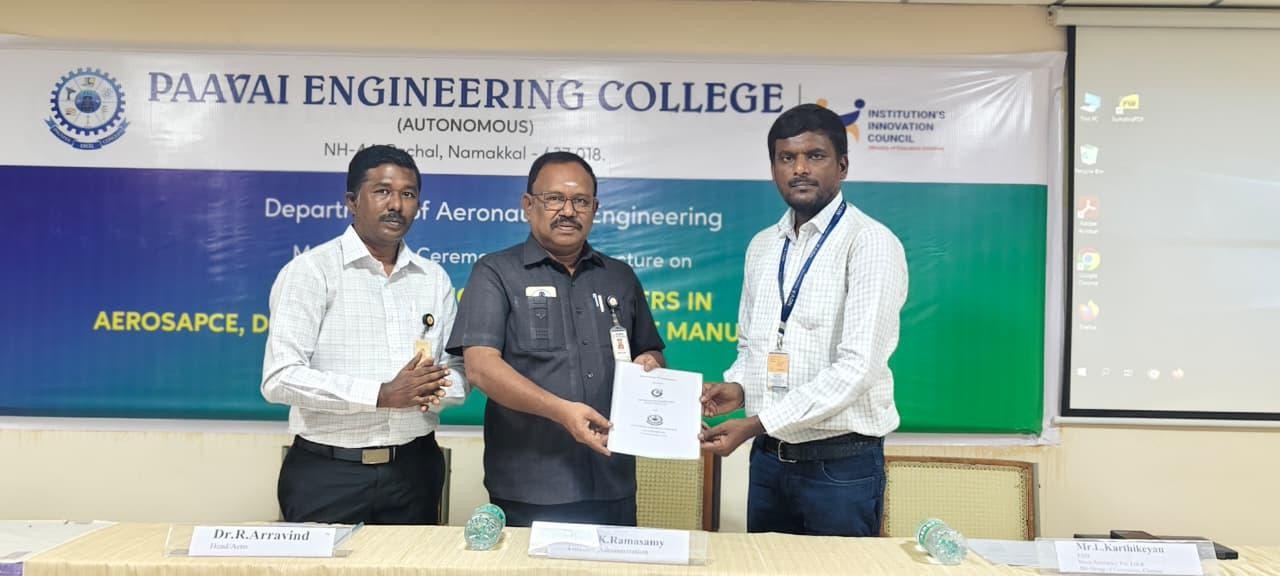 The Department of Aeronautical Engineering, Paavai Engineering College (Autonomous), organized a MoU Signing Ceremony and Guest Lecture on the topic “Industry Insights on Careers in Aerospace, Drone Technology and Smart Manufacturing” on Wednesday, 28th January 2026, from 10.00 A.M. to 12.00 P.M., at Cute Hall.