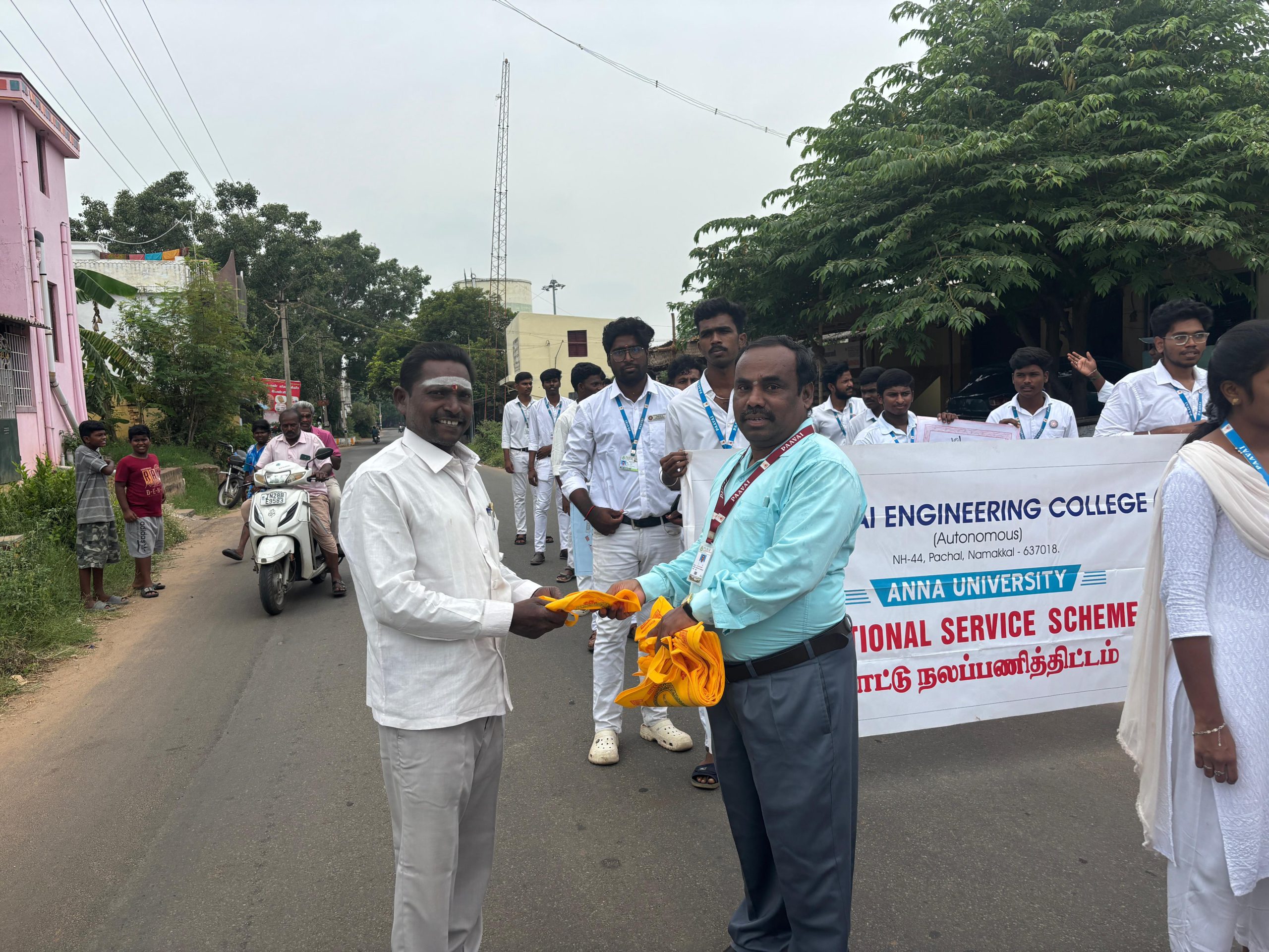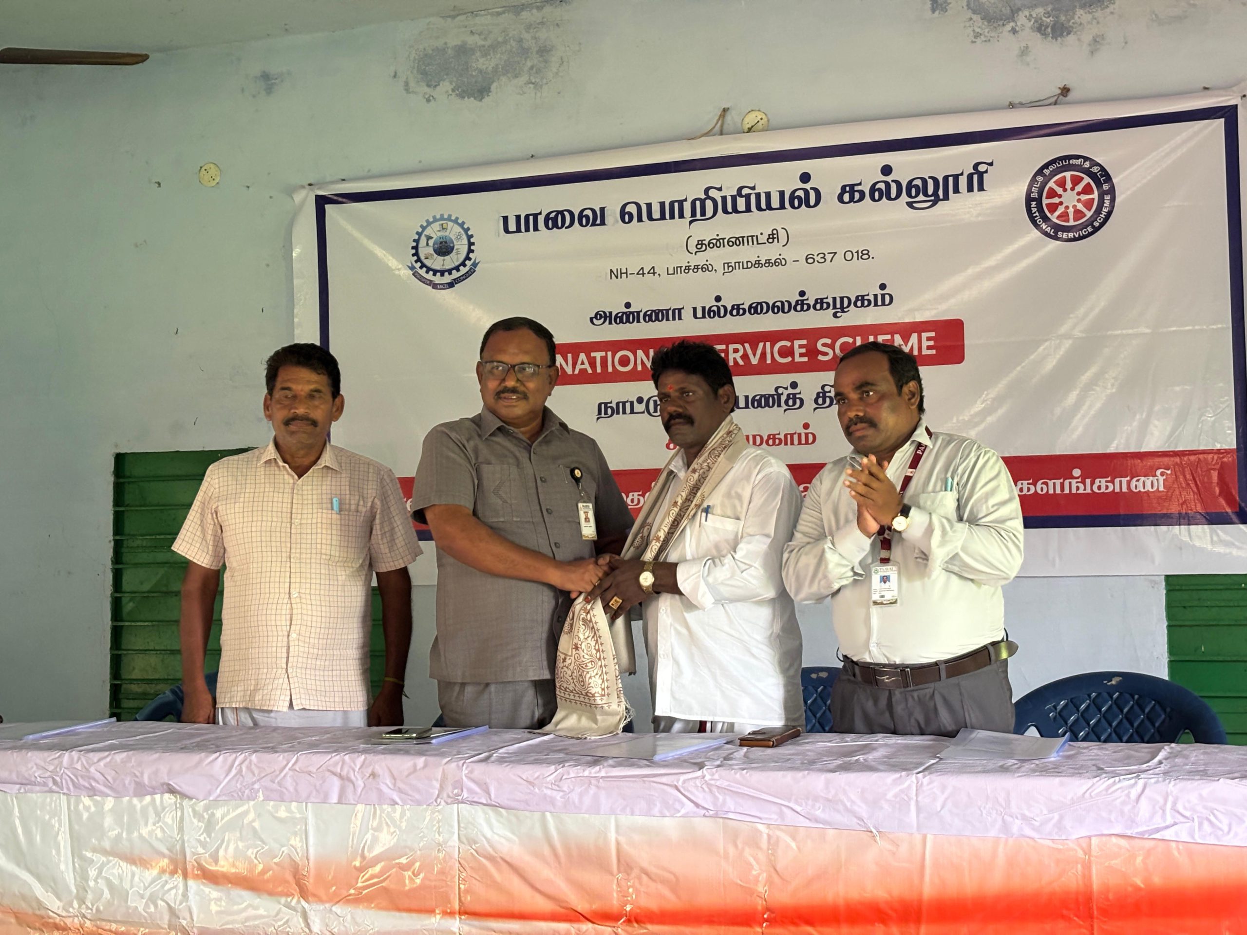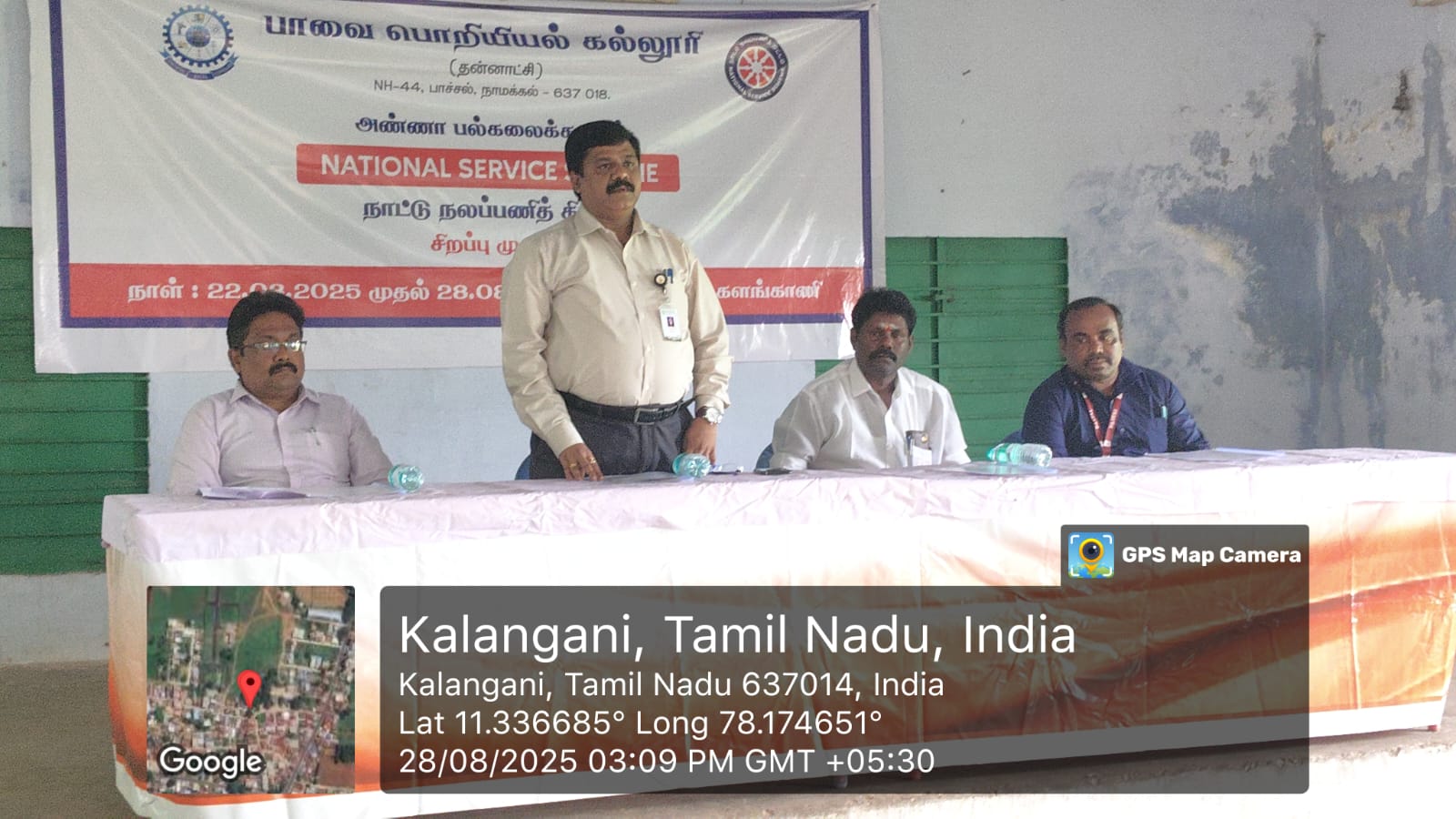 22.08.2025 | Afternoon | The inauguration of the Special Camp commenced at 3:00 p.m. Dr. K.K. Ramasamy, Director Administration, Paavai Institutions, Namakkal, was the Chief Guest for the occasion. In his address to the NSS volunteers, he delivered an inspiring speech, encouraging them to actively participate in meaningful social service initiatives. He emphasized the importance of helping underprivileged students continue their education and urged the volunteers to offer educational support to those at risk of dropping out. He commended the volunteers for joining the NSS scheme and motivated those to stay committed to social service throughout their academic and personal lives. Felicitations were delivered by Mrs. A. Manimegalai Annadurai, Ex-President of Kalangani Panchayat, and Mr. Subramanian, Clerk, Kalangani, both of whom extended their support and appreciation for the NSS activities.