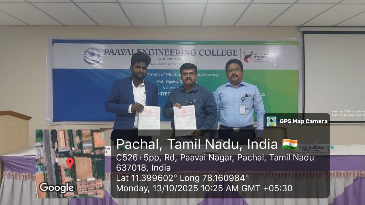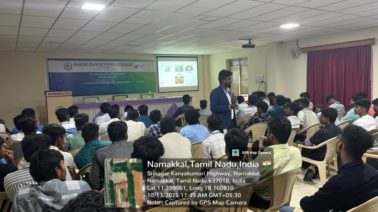 The Department of Mechatronics Engineering, in association with Paavai Mechatronics Engineers, Paavai Engineering College, organized a MoU Signing Ceremony and Guest Lecture on the topic “E-Vehicle Architecture and Advancement” on 13.10.2025. The event commenced with a warm welcome address by Ms. G. Nishanthini, III Year B.E. Mechatronics. The Presidential Address was delivered by Dr. M. Premkumar, Principal, Paavai Engineering College, who emphasized the importance of transforming project works into potential Start-up ventures in the future. Mr. S. K. Kiran, III Year B.E. Mechatronics Engineering, introduced the chief guest Mr. Alagarsamy Rajamanickam, CEO & Founder, MEHNIDO & SEED, Coimbatore.
