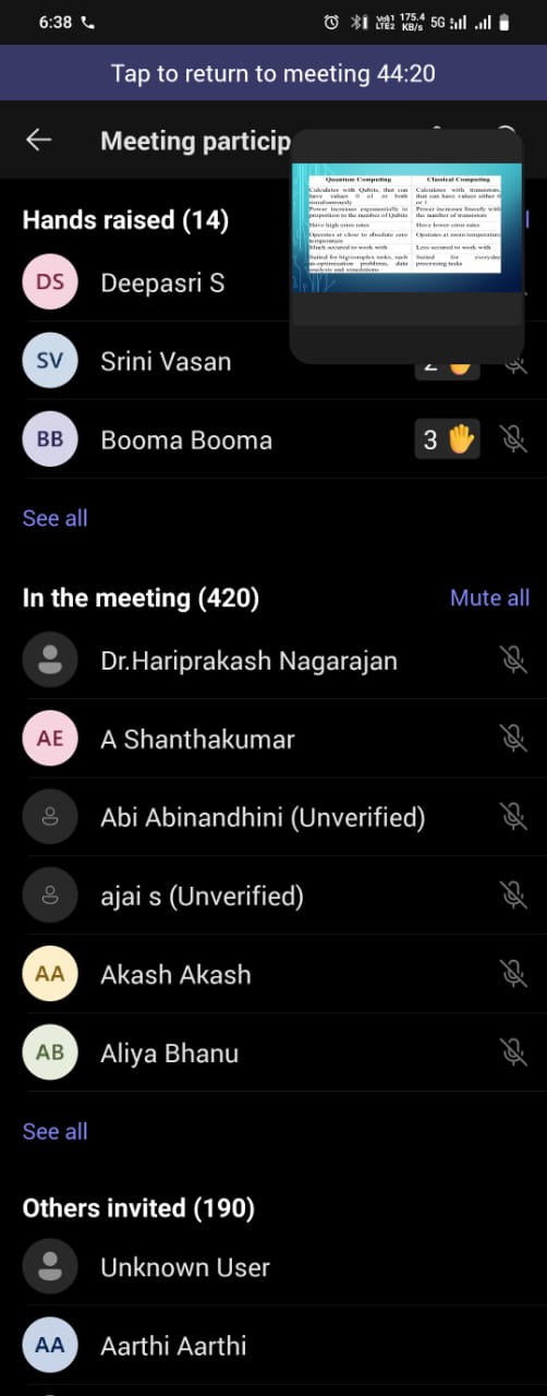 The Department of Physics, Paavai Engineering College organized a one-day student webinar on “UNVEILING THE QUANTUM ERA: PRINCIPLES AND APPLICATIONS OF QUANTUM COMPUTING” on 21st November 2025. The programme was convened by Dr. T. Krishnakumar, Professor& Head of the Department, and coordinated by Dr. N. Hari Prakash, Assistant Professor, and Dr. T. Prakash, Associate Professor, along with the support of the department faculty members. Dr. M. Premkumar, Principal, Paavai Engineering College, delivered the Presidential Address, highlighting the growing significance of quantum technologies in the modern world. Dr. K. Selvi, Dean (Academics), introduced the Chief Guest, Dr. R. Nithya, Associate Professor, Department of Physics, St. Martin’s Engineering College, Kompally, Secunderabad. C. Nandhu, a first-year student from CSE-C, extended a warm welcome to the gathering. The session was then handed over to the Chief Guest. Dr. R. Nithya delivered an insightful and engaging lecture, providing a clear understanding of the foundational principles of quantum computing and its wide-ranging applications. The webinar proved to be highly informative, enabling students to gain an in-depth perspective on the emerging quantum era. An interactive session followed, during which participants enthusiastically engaged with the speaker. S. Nikhitha, a first-year student from Cyber Security–B, proposed the Vote of Thanks, expressing gratitude to all contributors. The Department extends heartfelt thanks to the Management, Director–Admin, Principal, and all Staff Members for their continual support, which contributed to the successful conduct of the event.