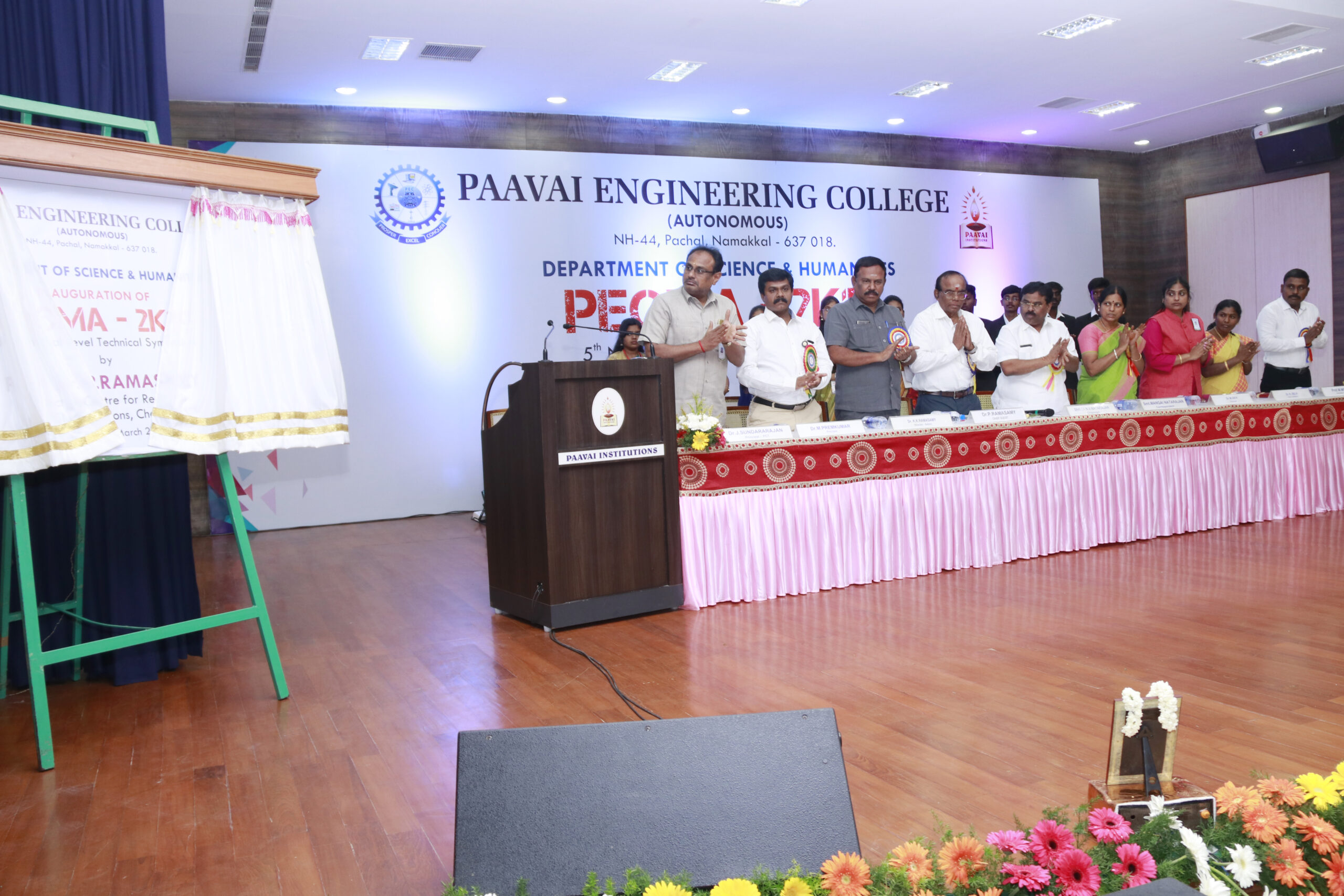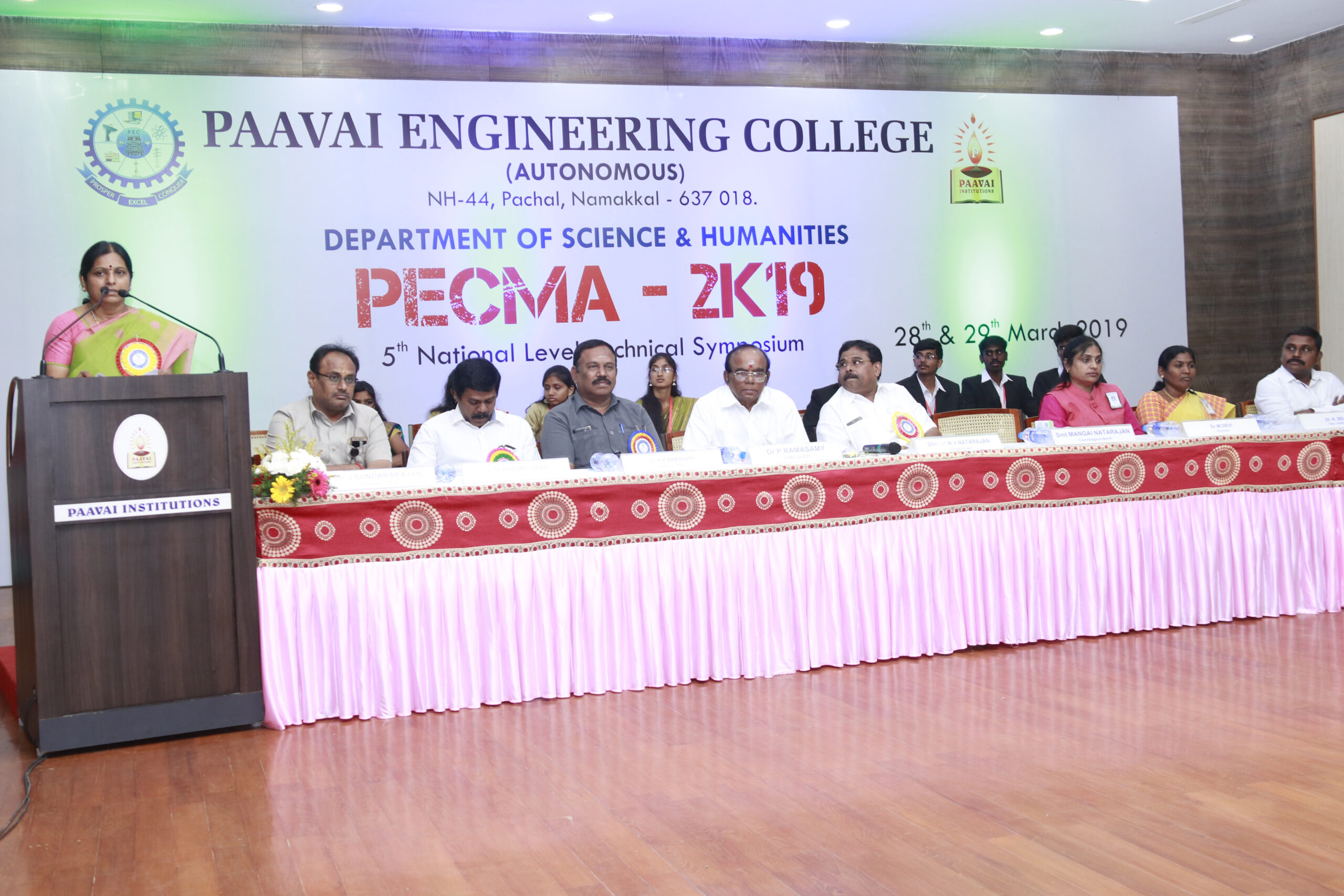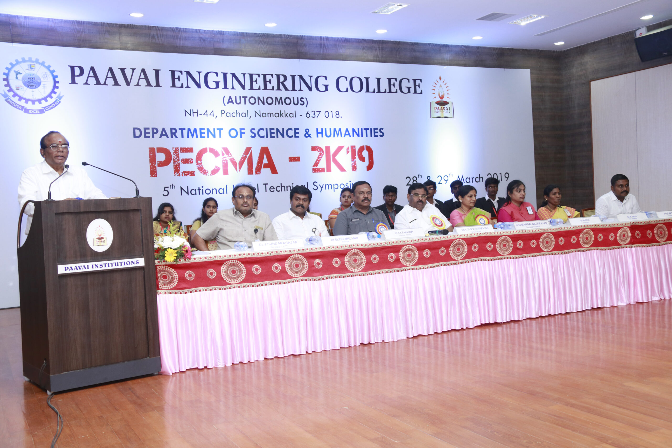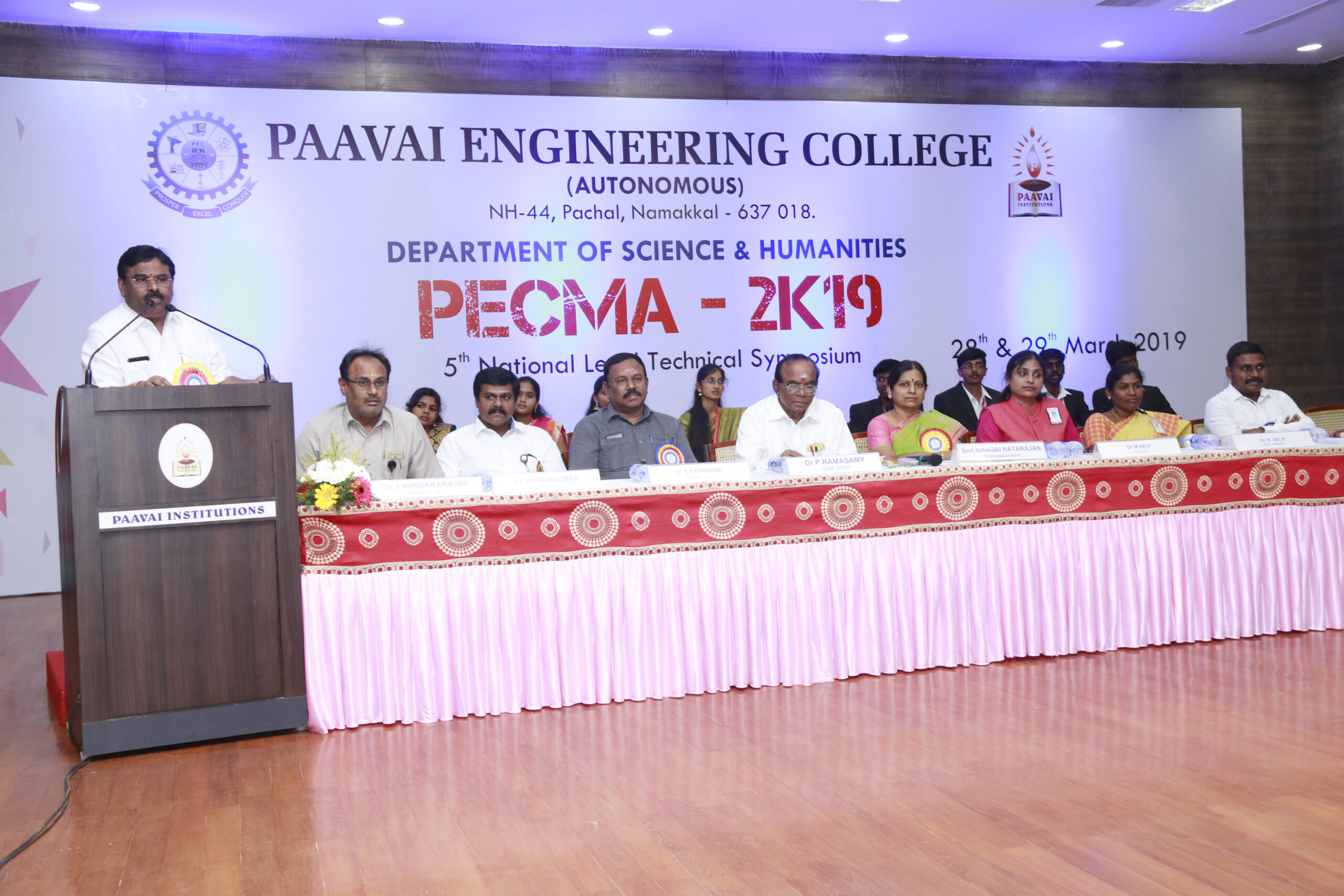 The department of Science and Humanities of Paavai Engineering College conducted a two day National Level Symposium on 28th and 29th, March 2019. The inaugural ceremony was conducted on the forenoon of 28-03-2019, Thursday in the Anantha Arangam. The programme started at 10.00 a.m. with a prayer song and Tamilthai Valthu. Smt. Mangai Natarajan, Correspondent, Paavai Institutions lit the kuthuvilakku with the dignitaries in view of gracing the programme. Welcome address was given by Ms. S. U. Sushma, student of first year Civil Engineering. Presidential address was delivered by Shri. CA.N.V. Natarajan, Chairman, Paavai Institutions. In his presidential address, he greeted all the participants of the PECMA 2K19 and highlighted the role of symposium in the formative period of budding engineers to expose their talents along with building up their leadership qualities. Symposium, in its true spirit, is a genuine outlet for the ambitious to create and establish their own identity as a scientist during college years. He advised the students to be innovative in bringing out successful projects which should surely guarantee peace and happiness to mankind. Ms. Sandra Elizabeth, student of first year Bio-Medical Engineering introduced the chief guest, Dr. P. Ramasamy, Director, Centre for Research, SSN Institutions, Chennai. The chief guest unveiled the PECMA 2K19. In his inaugural address, he appreciated the institution’s interest in conducting symposiums. He stressed that experiment is the order of the day and engineering students should always have research attitude since the inventions of science alone can make a country rich. He stated that education should make a learner employable and appreciated that Paavai Engineering College has been focusing on giving training for career opportunities to students. He wished the students every success in their future endeavors. In her felicitation address, Smt. Mangai Natarajan, Correspondent, Paavai Institutions stated that it is high time to think differently as the social scenario is changing. Students should be proud of their course and identity as engineer and good at communication skills. She highlighted that security is the foremost important thing nowadays and so it is everyone’s duty to give security to others which, in turn, gives us the same. The PECMA 2K19 Souvenir was released by the Chairman and received by the chief guest. Mr U. Bharath, student of first year Computer Science rendered prelude to the symposium. Vote of thanks was delivered by Mr.Akhil Shabu, first year student of Food Technology.