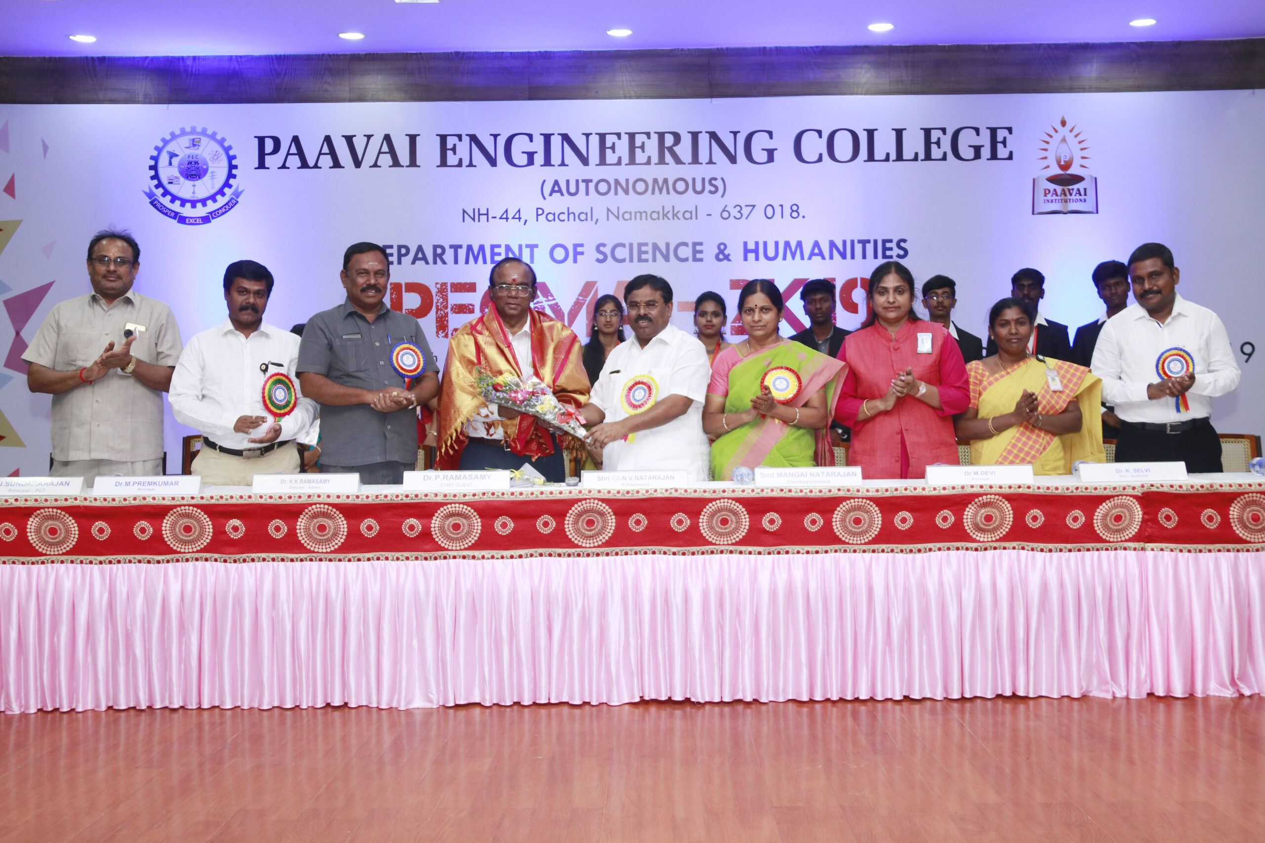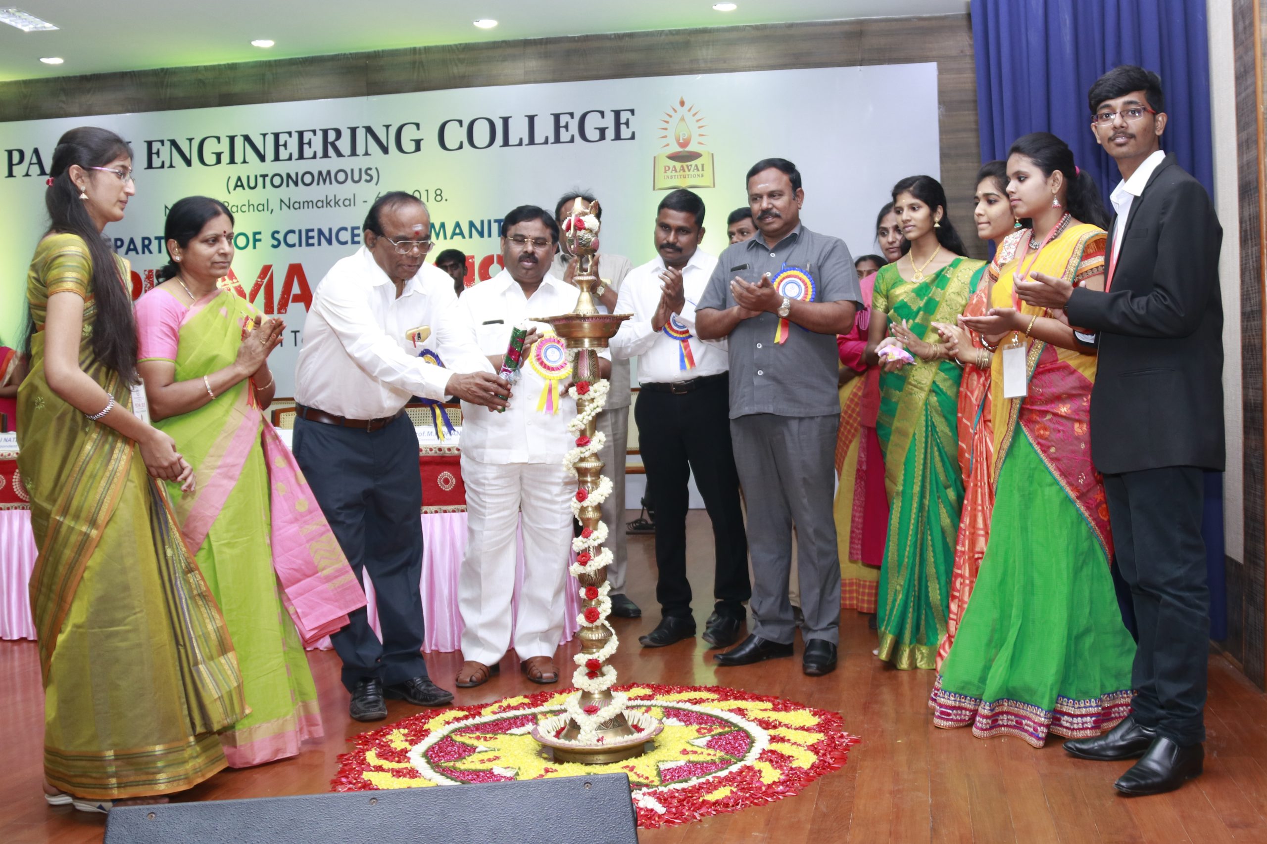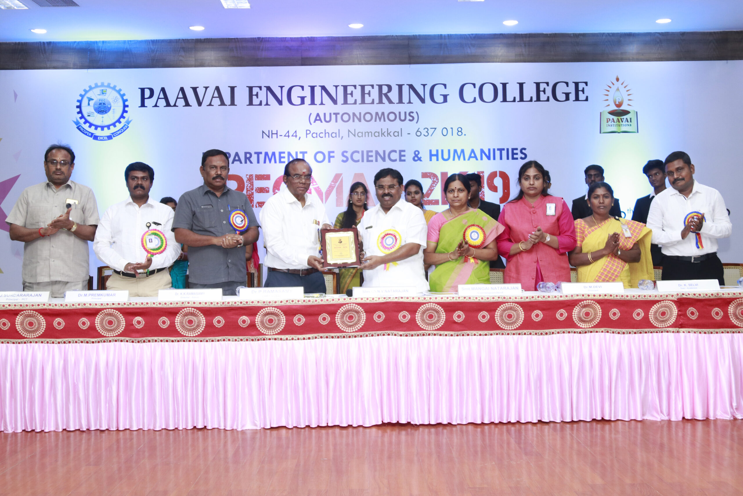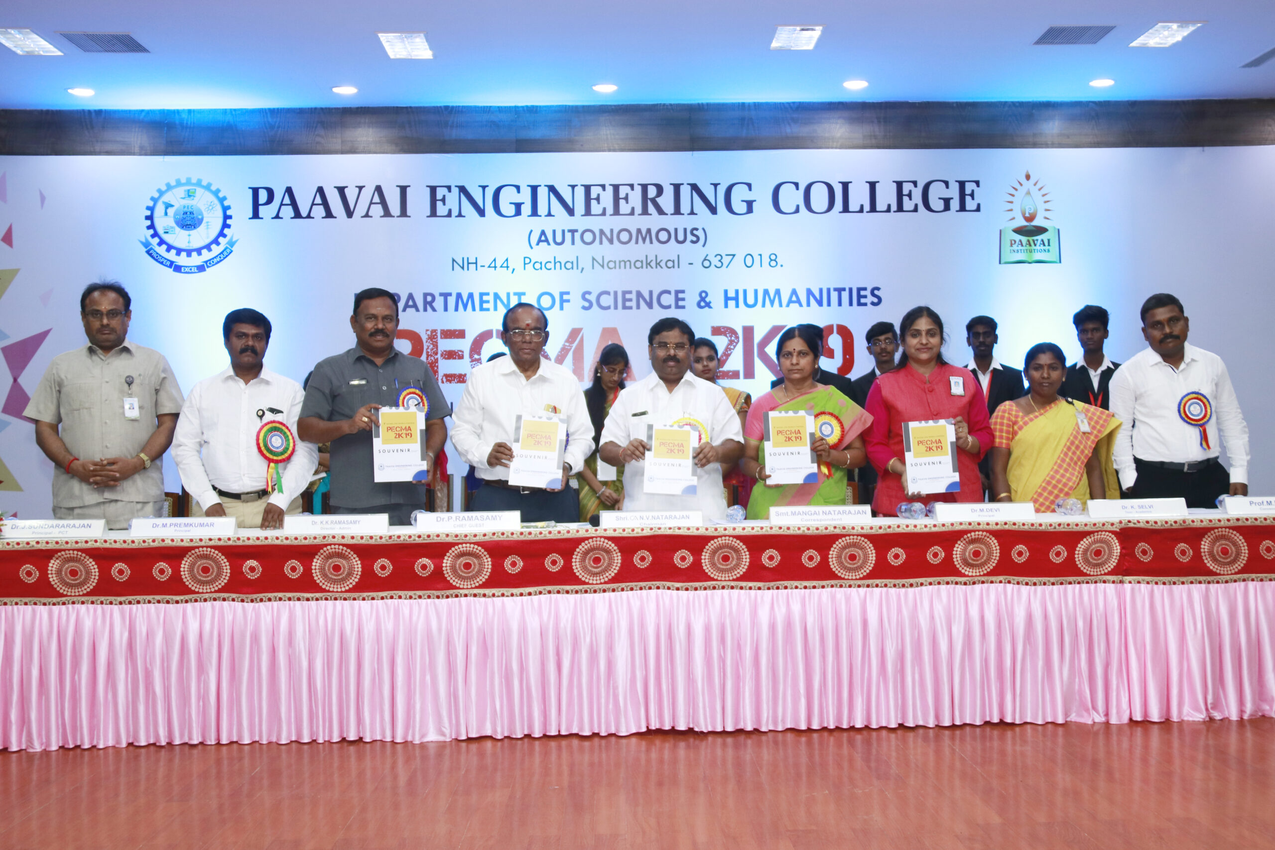 The department of Science and Humanities of Paavai Engineering College conducted a two day National Level Symposium on 28th and 29th, March 2019. The inaugural ceremony was conducted on the forenoon of 28-03-2019, Thursday in the Anantha Arangam. The programme started at 10.00 a.m. with a prayer song and Tamilthai Valthu. Smt. Mangai Natarajan, Correspondent, Paavai Institutions lit the kuthuvilakku with the dignitaries in view of gracing the programme. Welcome address was given by Ms. S. U. Sushma, student of first year Civil Engineering. Presidential address was delivered by Shri. CA.N.V. Natarajan, Chairman, Paavai Institutions. In his presidential address, he greeted all the participants of the PECMA 2K19 and highlighted the role of symposium in the formative period of budding engineers to expose their talents along with building up their leadership qualities. Symposium, in its true spirit, is a genuine outlet for the ambitious to create and establish their own identity as a scientist during college years. He advised the students to be innovative in bringing out successful projects which should surely guarantee peace and happiness to mankind. Ms. Sandra Elizabeth, student of first year Bio-Medical Engineering introduced the chief guest, Dr. P. Ramasamy, Director, Centre for Research, SSN Institutions, Chennai. The chief guest unveiled the PECMA 2K19. In his inaugural address, he appreciated the institution’s interest in conducting symposiums. He stressed that experiment is the order of the day and engineering students should always have research attitude since the inventions of science alone can make a country rich. He stated that education should make a learner employable and appreciated that Paavai Engineering College has been focusing on giving training for career opportunities to students. He wished the students every success in their future endeavors. In her felicitation address, Smt. Mangai Natarajan, Correspondent, Paavai Institutions stated that it is high time to think differently as the social scenario is changing. Students should be proud of their course and identity as engineer and good at communication skills. She highlighted that security is the foremost important thing nowadays and so it is everyone’s duty to give security to others which, in turn, gives us the same. The PECMA 2K19 Souvenir was released by the Chairman and received by the chief guest. Mr U. Bharath, student of first year Computer Science rendered prelude to the symposium. Vote of thanks was delivered by Mr.Akhil Shabu, first year student of Food Technology.