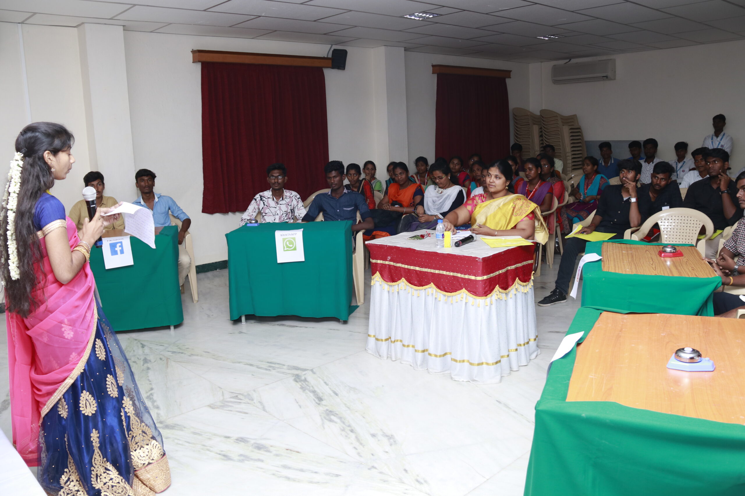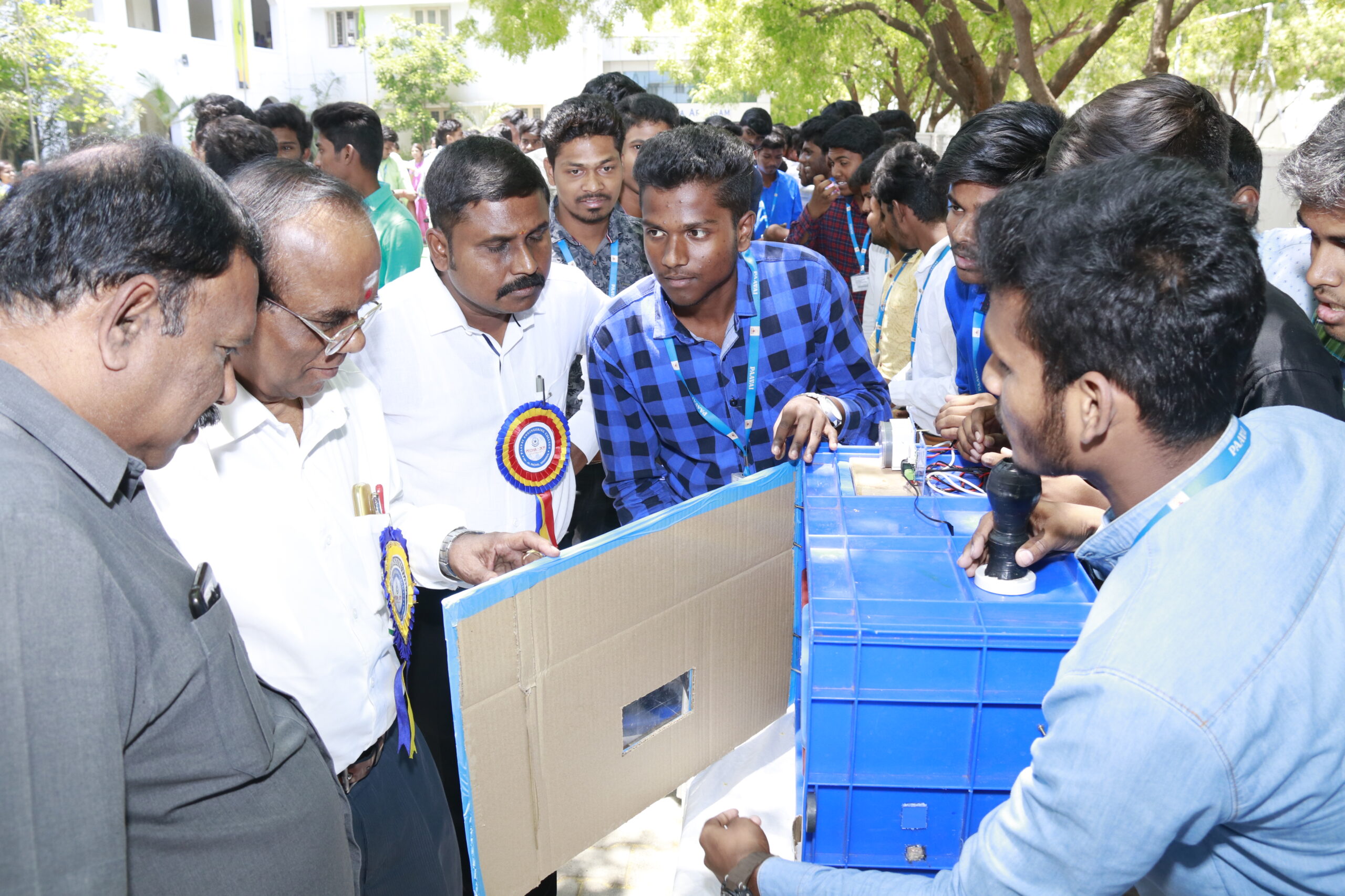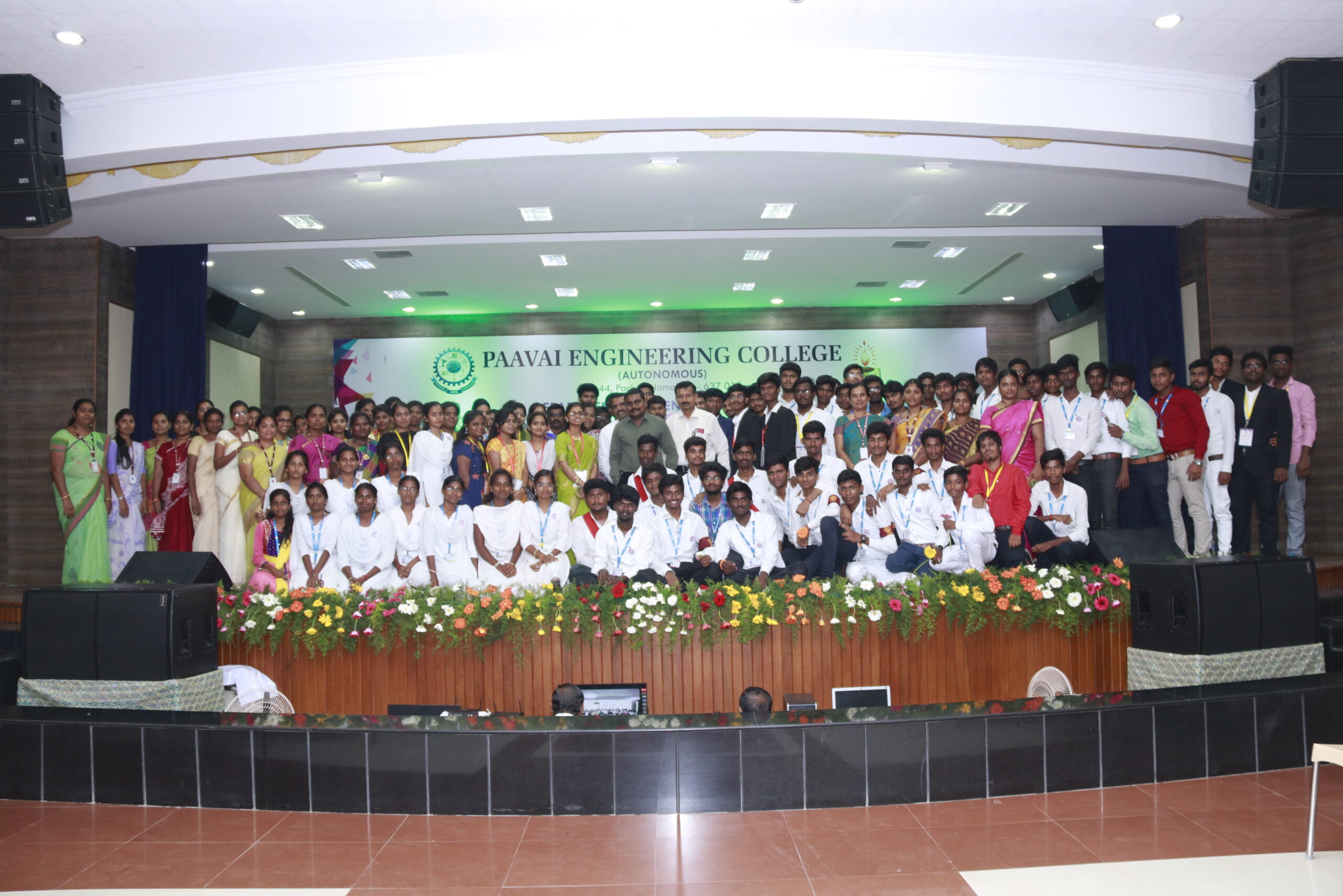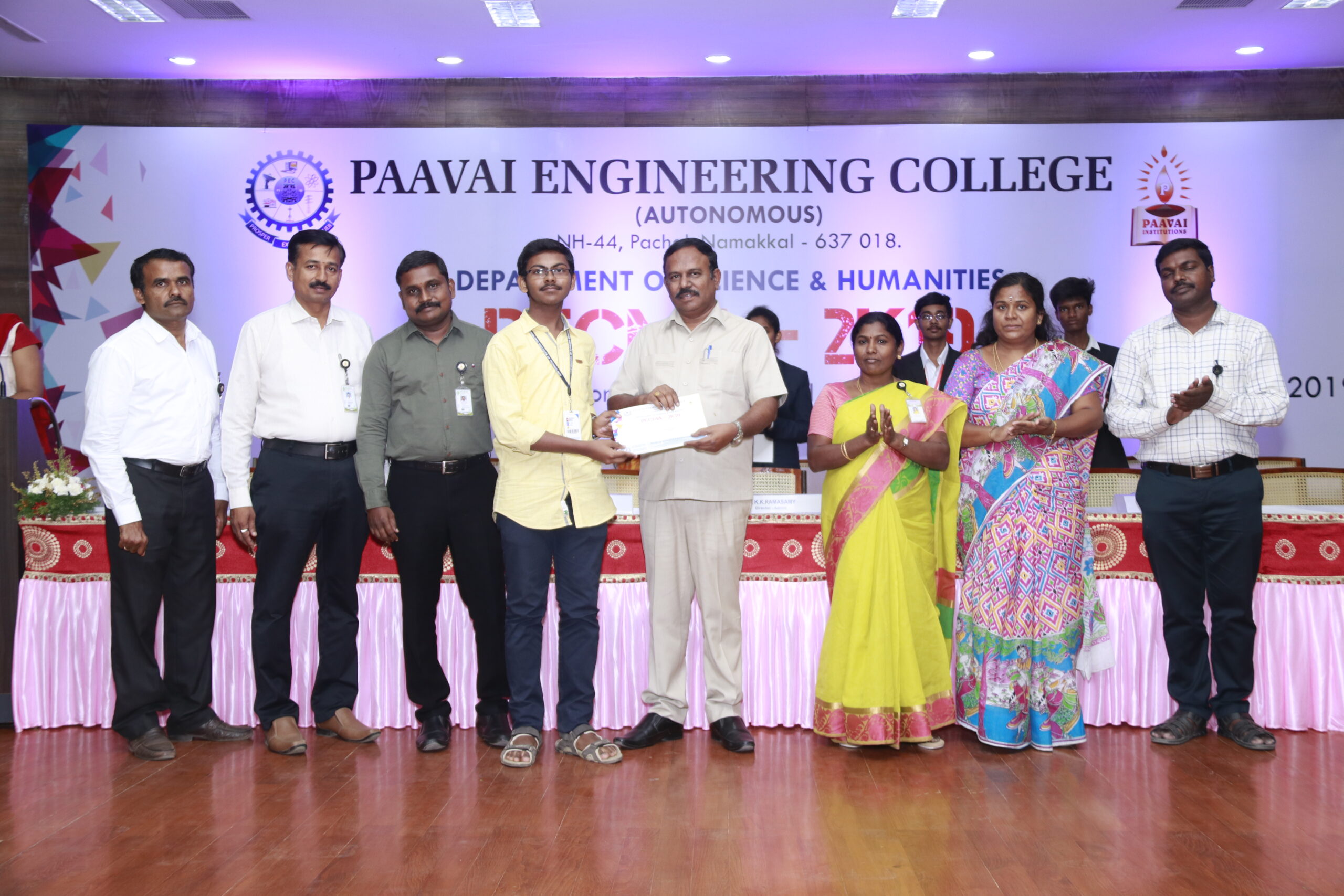 The department of Science and Humanities of Paavai Engineering College conducted a two day National Level Symposium on 28th and 29th, March 2019. The inaugural ceremony was conducted on the forenoon of 28-03-2019, Thursday in the Anantha Arangam. The programme started at 10.00 a.m. with a prayer song and Tamilthai Valthu. Smt. Mangai Natarajan, Correspondent, Paavai Institutions lit the kuthuvilakku with the dignitaries in view of gracing the programme. Welcome address was given by Ms. S. U. Sushma, student of first year Civil Engineering. Presidential address was delivered by Shri. CA.N.V. Natarajan, Chairman, Paavai Institutions. In his presidential address, he greeted all the participants of the PECMA 2K19 and highlighted the role of symposium in the formative period of budding engineers to expose their talents along with building up their leadership qualities. Symposium, in its true spirit, is a genuine outlet for the ambitious to create and establish their own identity as a scientist during college years. He advised the students to be innovative in bringing out successful projects which should surely guarantee peace and happiness to mankind. Ms. Sandra Elizabeth, student of first year Bio-Medical Engineering introduced the chief guest, Dr. P. Ramasamy, Director, Centre for Research, SSN Institutions, Chennai. The chief guest unveiled the PECMA 2K19. In his inaugural address, he appreciated the institution’s interest in conducting symposiums. He stressed that experiment is the order of the day and engineering students should always have research attitude since the inventions of science alone can make a country rich. He stated that education should make a learner employable and appreciated that Paavai Engineering College has been focusing on giving training for career opportunities to students. He wished the students every success in their future endeavors. In her felicitation address, Smt. Mangai Natarajan, Correspondent, Paavai Institutions stated that it is high time to think differently as the social scenario is changing. Students should be proud of their course and identity as engineer and good at communication skills. She highlighted that security is the foremost important thing nowadays and so it is everyone’s duty to give security to others which, in turn, gives us the same. The PECMA 2K19 Souvenir was released by the Chairman and received by the chief guest. Mr U. Bharath, student of first year Computer Science rendered prelude to the symposium. Vote of thanks was delivered by Mr.Akhil Shabu, first year student of Food Technology.
