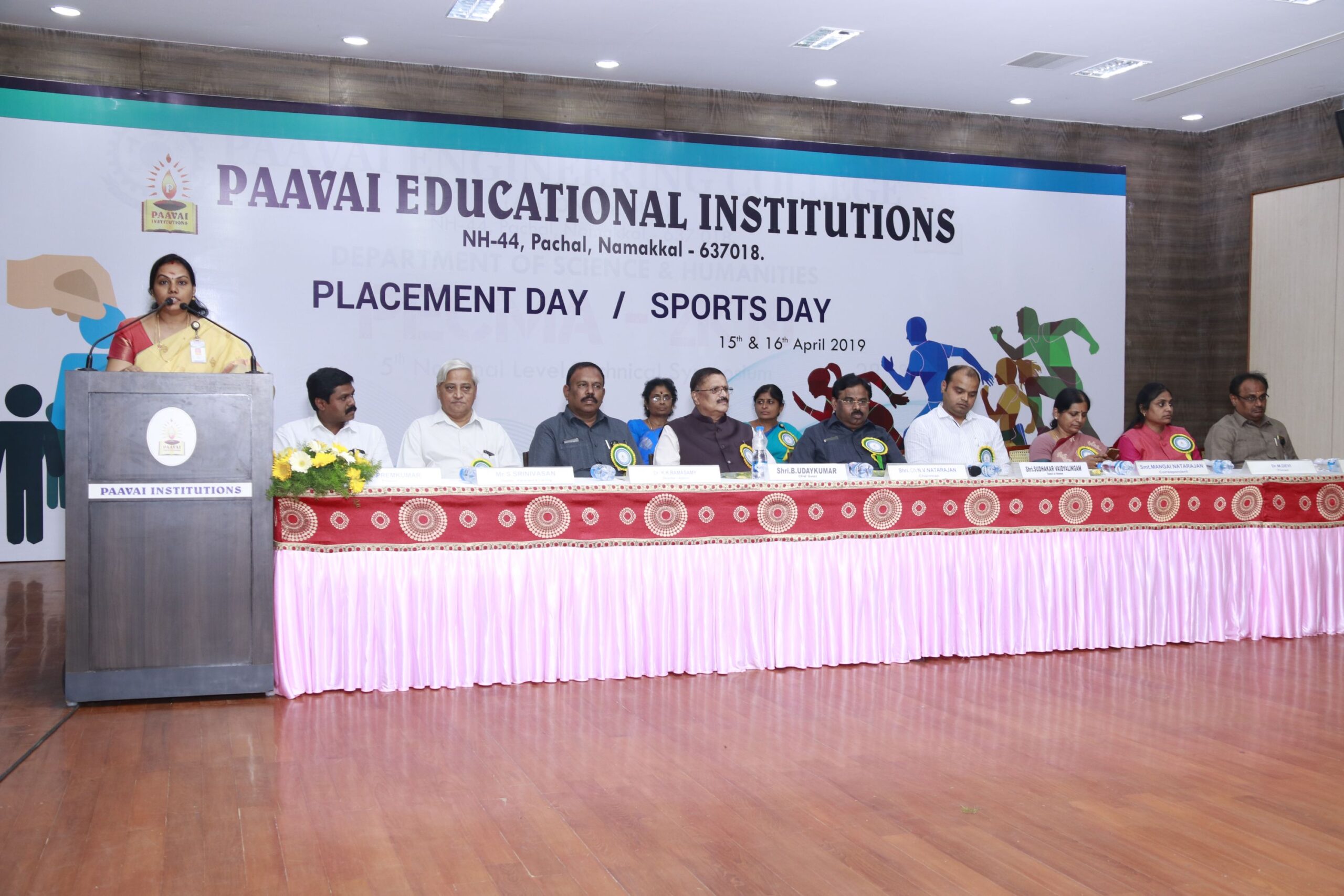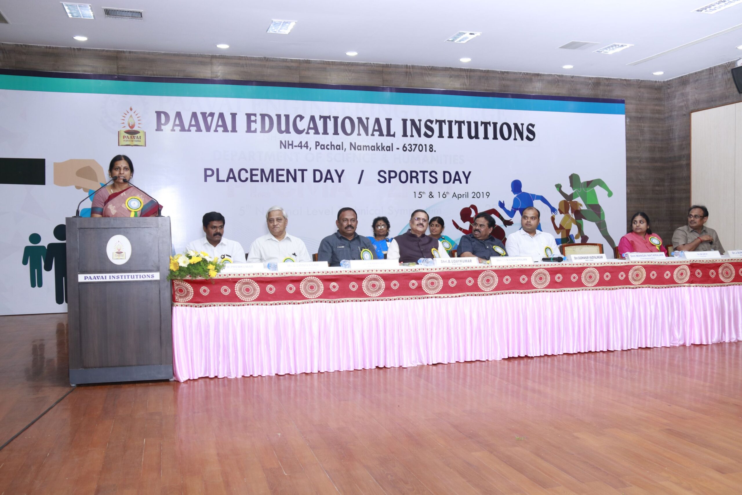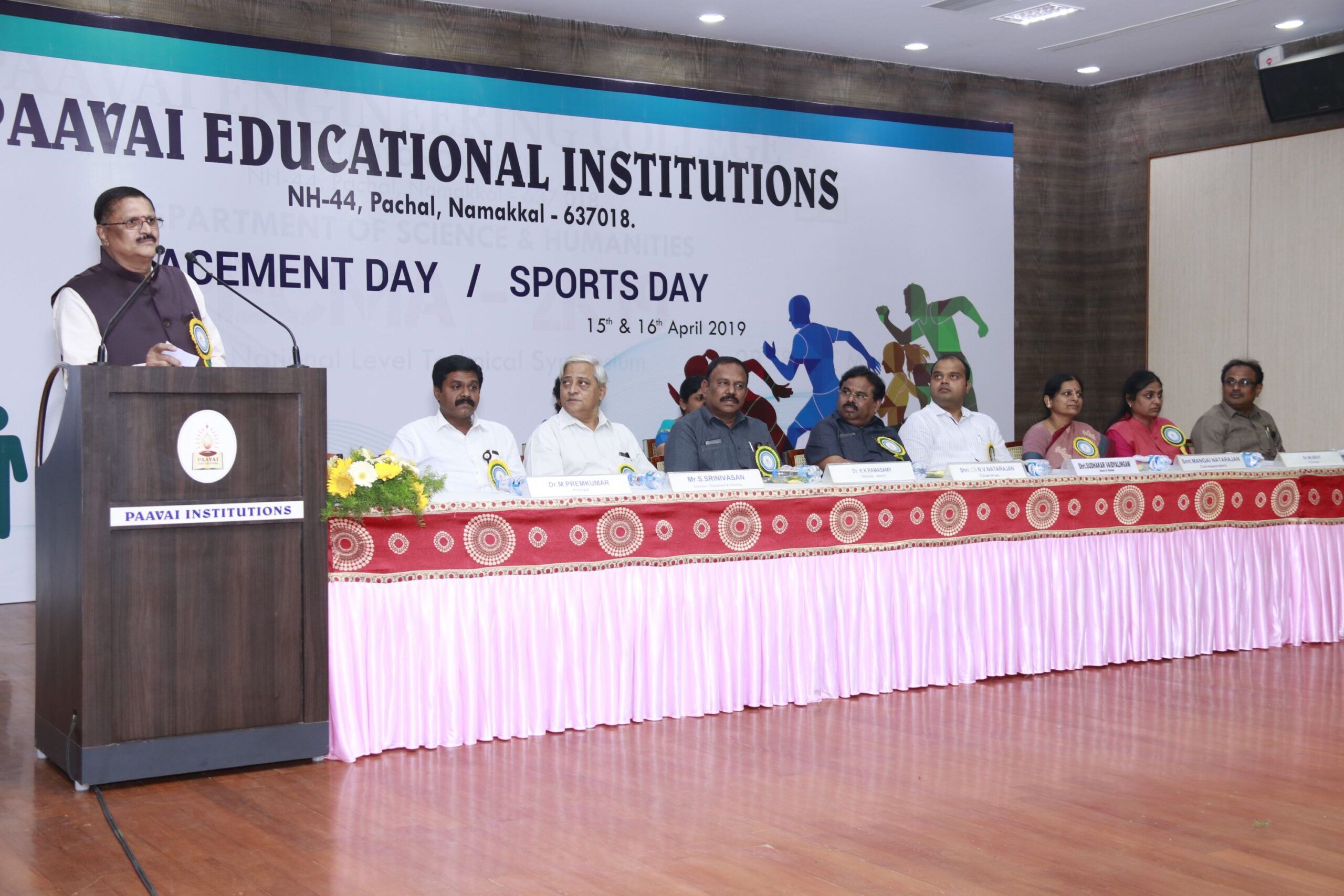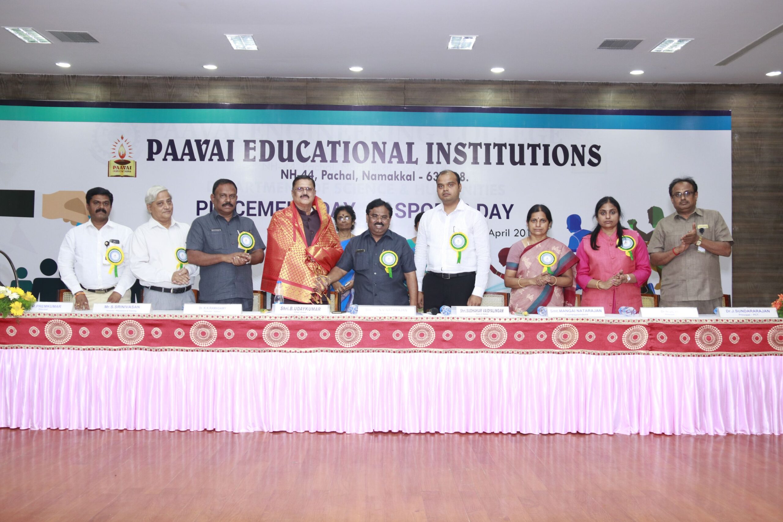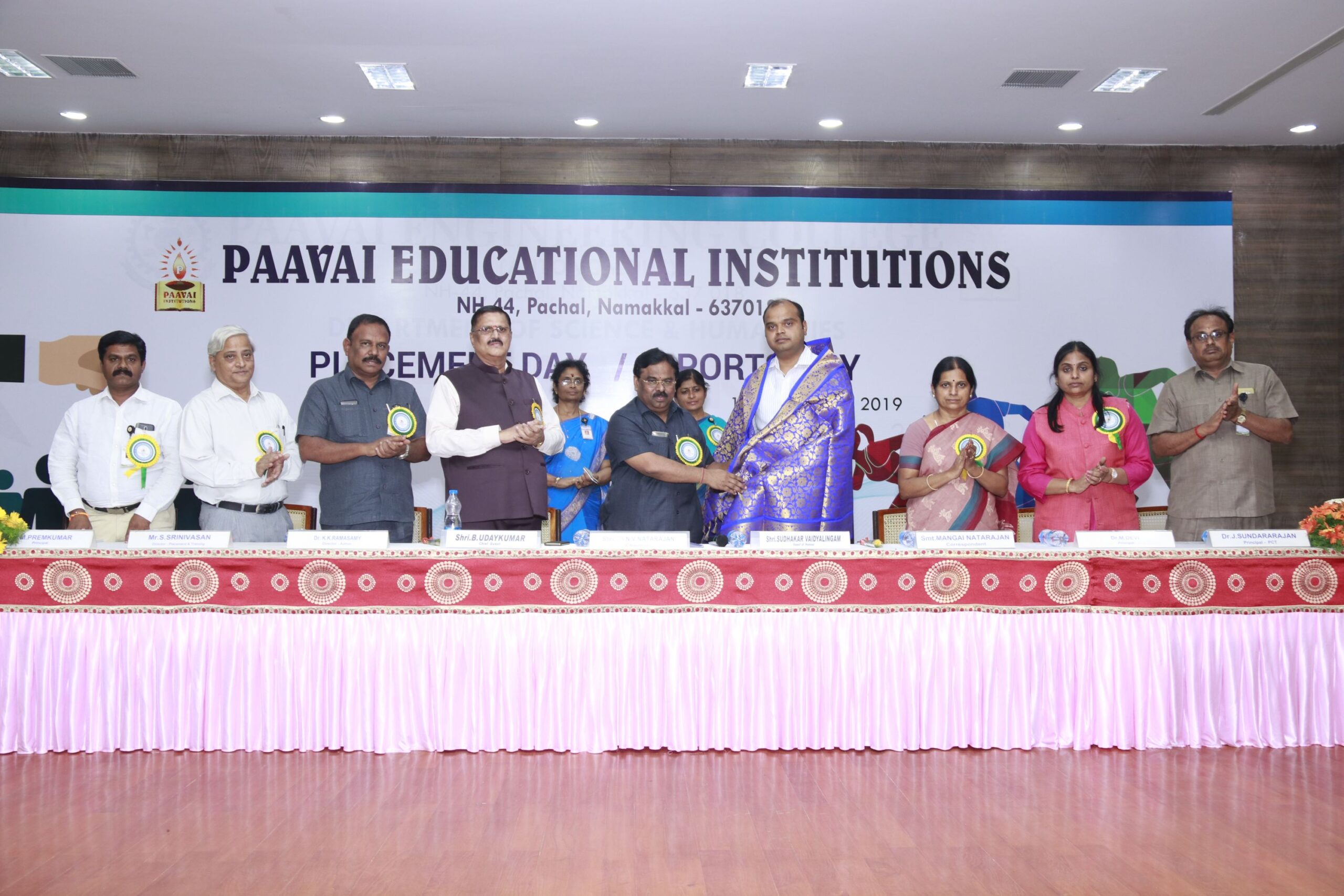 Paavai Educational Institutions’ Placement Day for 2019 passouts was celebrated on 15.04.2019. The Placement Day function was Presided by Shri.CA.N.V.Natarajan, Chairman, Paavai Educational Institutions. Mr. B.P.Udaykumar, Chairman, Confederation of Indian Industry (CII), Salem and Managing Partner, BSP Refineries, Salem was the chief guest and Mr. Shri. Sudhakar Vaidyalingam, Vice Chairman-CII Salem was the guest of honour for the Placement Day celebration at Paavai Institutions. Smt. Mangai Natarajan, Correspondent, Paavai Educational Institutions lighted the Kuthuvilakku. Ms. P.Durga, II Year ECE student of Paavai Engineering College Welcomed the gathering. Shri.CA.N.V.Natarajan, the Chairman of Paavai Institutions delivered the Presidential Address and Smt. Mangai Natarajan, Correspondent, Paavai Educational Institutions felicitated the function and congratulated the students who were offered. Shri.CA.N.V.Natarajan, Chairman, Paavai Educational Institutions honored the Chief guest and Guest of Honor with the mementos. Chief guest Shri B.P.Udaykumar during his speech spoke about how a Placement day is very important for an Engineering student. He claimed that today’s youngsters have the potential to change the future of India with several key factors like Age, Education and Competency to achieve many things in life. He stated that being young, energetic and focused will pave way for success in life. He advised our students to be straightforward and to be sincere in all their efforts and instructed not to compromise in these attributes. He concluded his speech by wishing our students success in life. Guest of Honor, Shri. Sudhakar Vaidyalingam, while addressing the students spoke about how every Paavai student who got placed should become a brand ambassador of Paavai Institutions by working hard, being sincere and truthful to their respective companies. Only this attitude will pave way for great opportunity for the Juniors in Paavai Institutions. This attitude will deem a lot of respect for the students in the companies, which will in turn create a lot of respect for Paavai Institutions. He congratulated the students for their success in life. A total 63 corporate companies visited Paavai Institutions to hire our 2019 passing out students . A total of 1899 students were placed in companies like Tech Mahindra, Infosys, HCL, TCS, L & T, Sanmar, SPIC, TVS, LGB, Nextweb, Poornam Info vision, ABCO Technologies, L&T for the academic year 2018 – 2019. Mrs.S.Mahalakshmi , Training & Placement Officer introduced the Chief Guest & Guest of Honor .Ms. R.Sweshika II Year ECE student of Paavai Engineering College delivered the Vote of thanks and was followed by National Anthem. Director – Administration , Dr.K.K.Ramasamy & Director – Training & Placement , Mr.S.Srinivasan, Principals, Deans, Heads of Various Departments , Professors & Students of Paavai Educations Institutions were a part of this Celebration.