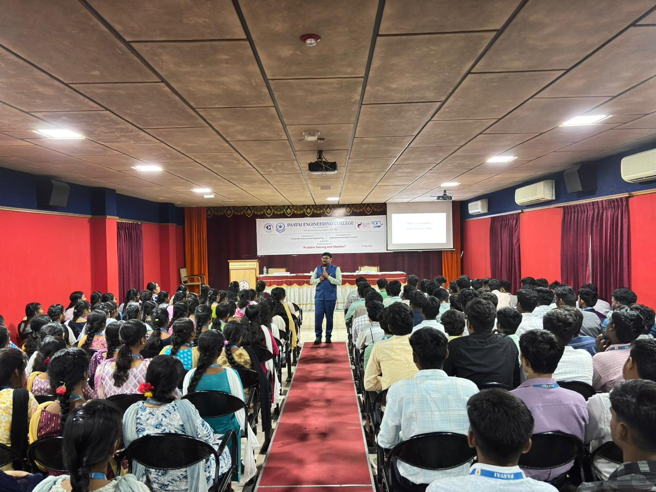 The Department of Computer Science and Engineering of Paavai Engineering College, in association with the Institution’s Innovation Council (IIC), Computer Society of India (CSI), and the Software Development & Information Management Club, organized a Guest Lecture on “Problem Solving and Ideation for Startup & Entrepreneur” on 12.02.2026 at Kalam’s Chamber. The objective of the session was to create awareness among students about entrepreneurship, innovative thinking, and real-world problem solving. It aimed to develop students’ ideation skills and encourage them to identify practical solutions to everyday challenges.