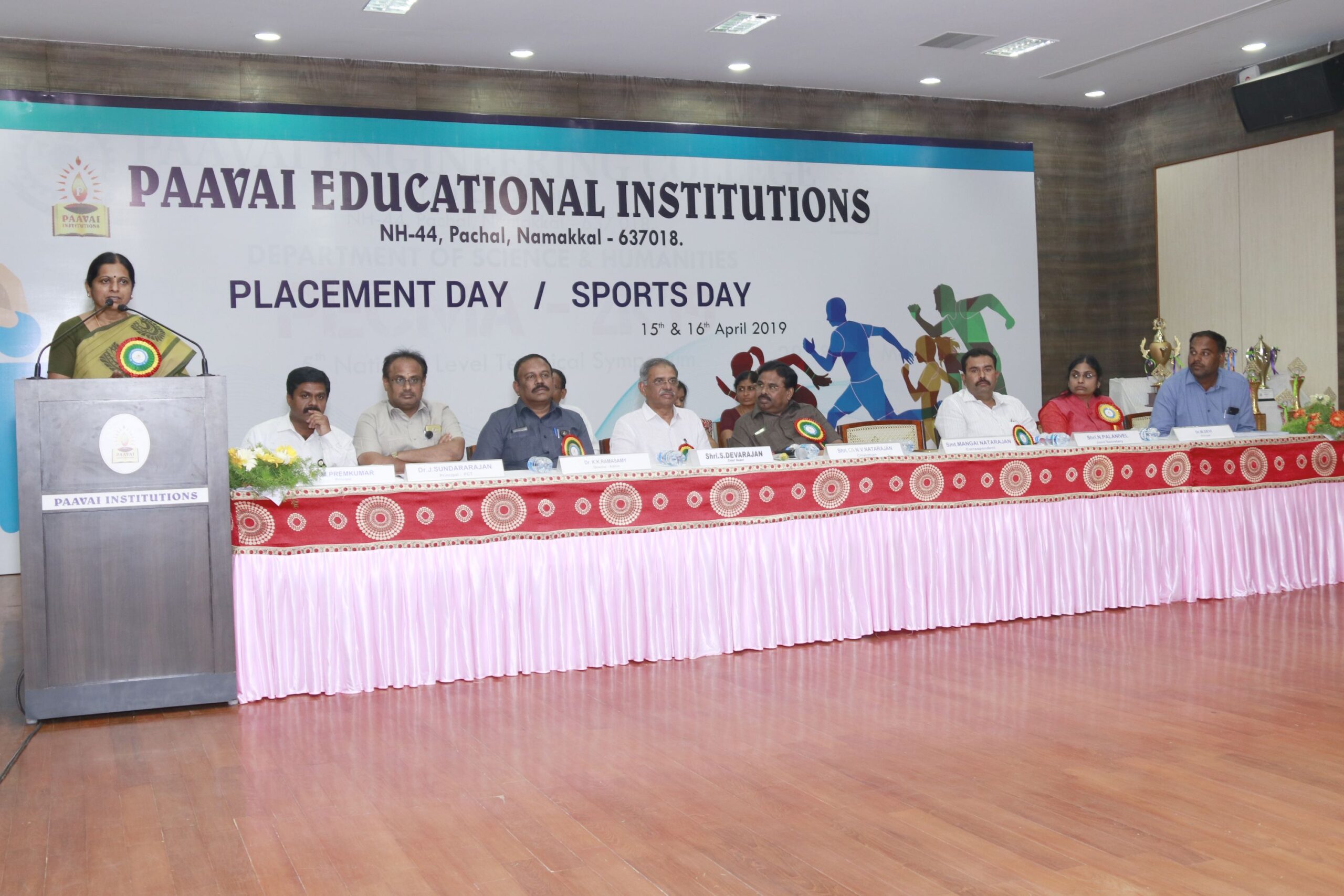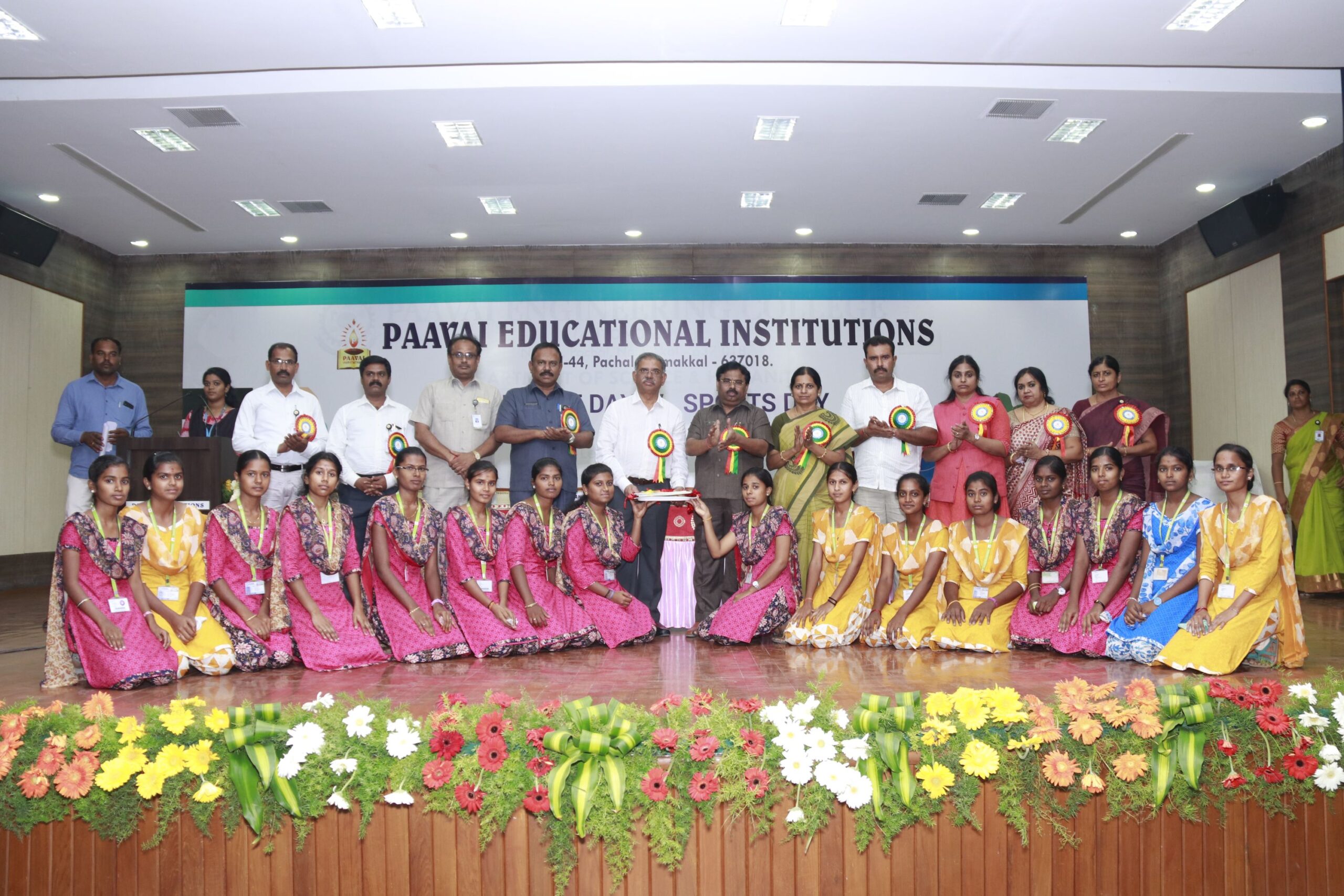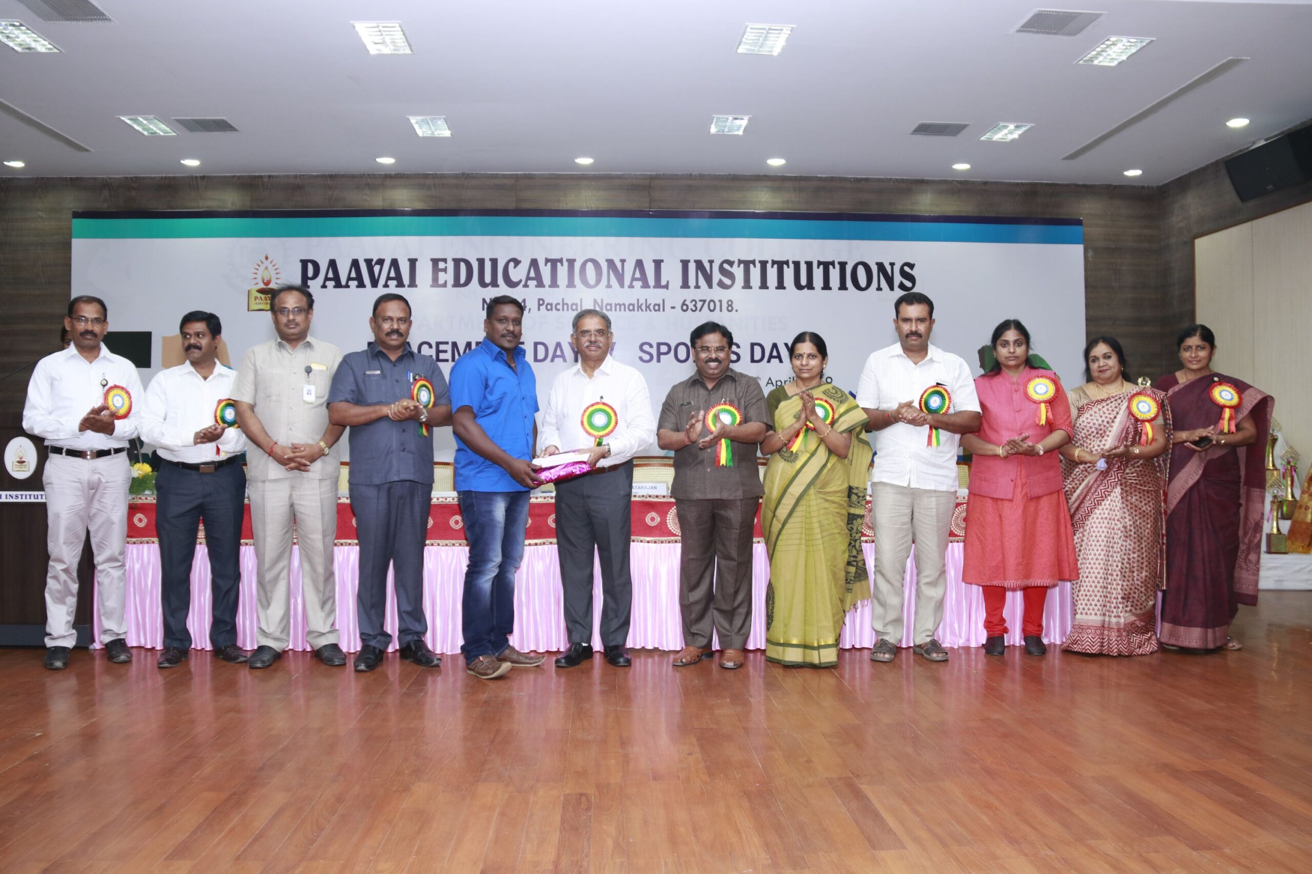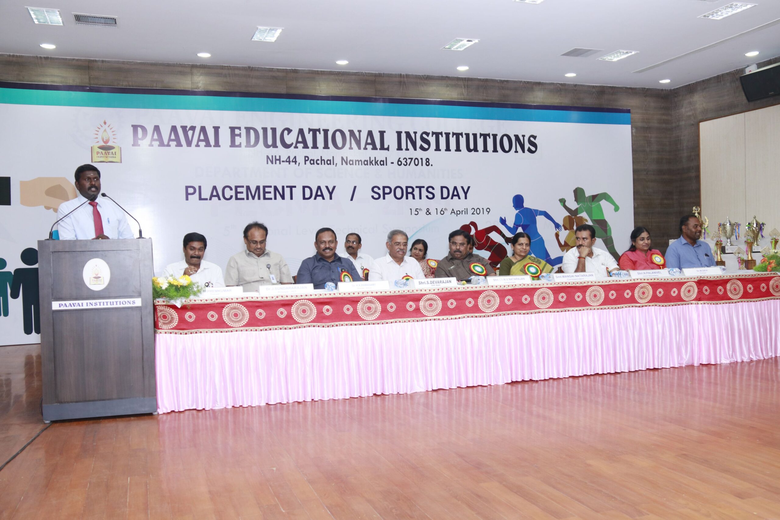 Paavai Institutions celebrated its Sports Day on 16th April 2019. Our C.A.N.V.Natarajan, Chairman, Paavai Institutions presided over the function and delivered the presidential address. The Managing Director and Chairman of Sambantham group of spinning mills Mr. S. Devarajan was the Chief Guest of the day. Ms.Swesika II ECE welcomed the gathering. The Chief Guest Mr. S. Devarajan inspired the gathering by his inspiring speech. He appreciated our sport persons for their outstanding achievements and he mentioned that sports & games play a vital role in developing the physical as well as mental health of the person. It teach us qualities such as Intelligence, achieving the goal, concentration, patience and facing the challenges. We should follow all these qualities to be successful in our professional life. He highly appreciated and praised Paavai Engineering College for securing Overall Championship with 780 points in the Anna University Inter Zone Tournament and bagged Champions of Champions Trophy for the 5th consecutive year. The chief guest with the dignitaries distributed the prizes to the Inter University students who won Gold medals. Our chairman honoured the chief guest with the memento. Our Correspondent Srimathi.Mangai Natarajan, Directors, Principals, head of the Department, faculty members & students of Paavai Institutions were present. Ms.R.Abinaya II ECE delivered the vote of thanks.The function ended up with National anthem.