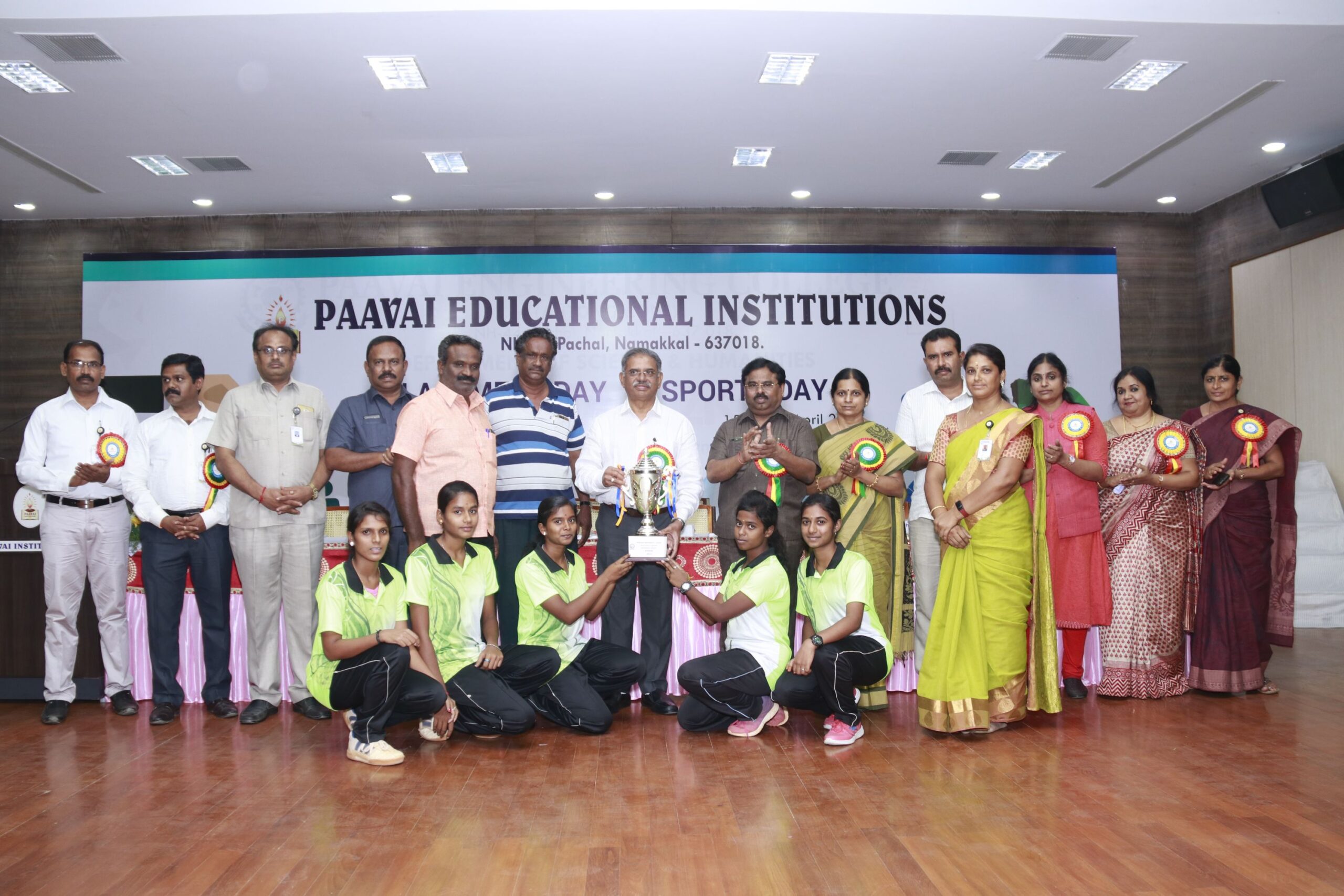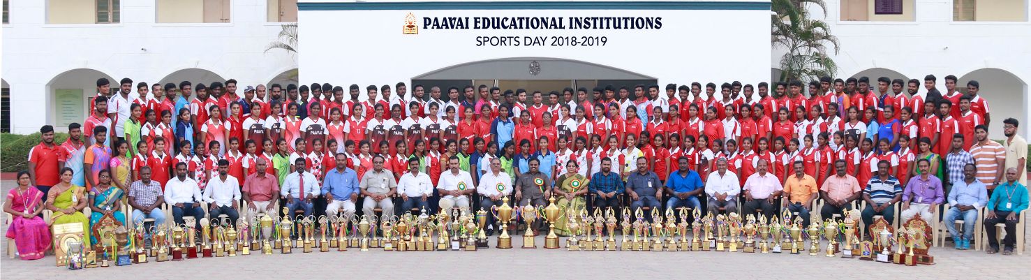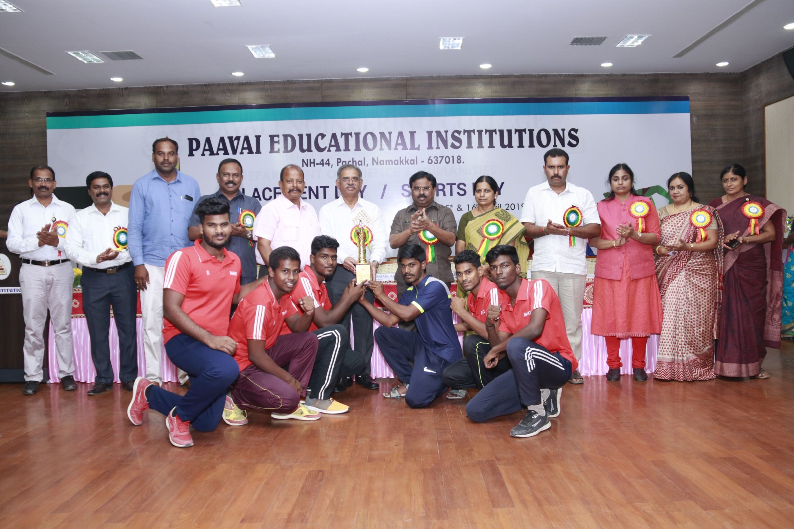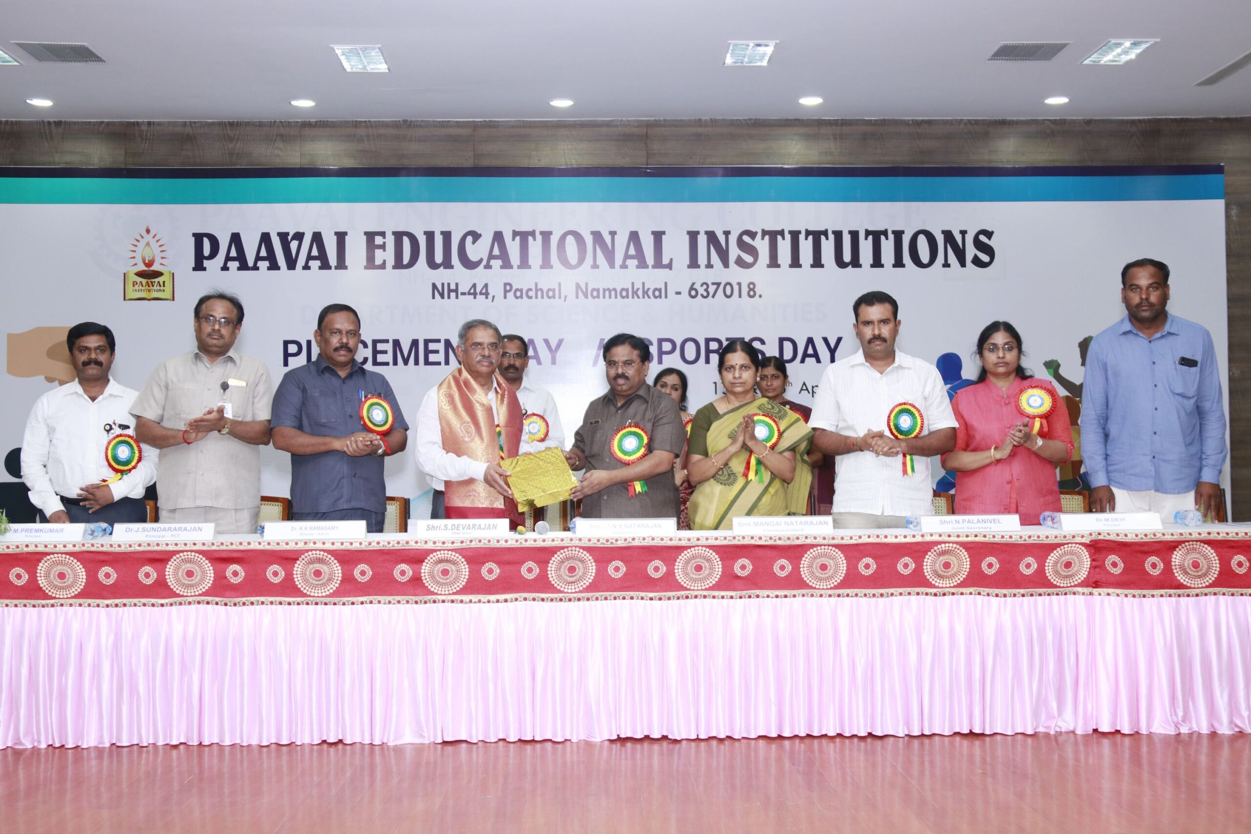 Paavai Institutions celebrated its Sports Day on 16th April 2019. Our C.A.N.V.Natarajan, Chairman, Paavai Institutions presided over the function and delivered the presidential address. The Managing Director and Chairman of Sambantham group of spinning mills Mr. S. Devarajan was the Chief Guest of the day. Ms.Swesika II ECE welcomed the gathering. The Chief Guest Mr. S. Devarajan inspired the gathering by his inspiring speech. He appreciated our sport persons for their outstanding achievements and he mentioned that sports & games play a vital role in developing the physical as well as mental health of the person. It teach us qualities such as Intelligence, achieving the goal, concentration, patience and facing the challenges. We should follow all these qualities to be successful in our professional life. He highly appreciated and praised Paavai Engineering College for securing Overall Championship with 780 points in the Anna University Inter Zone Tournament and bagged Champions of Champions Trophy for the 5th consecutive year. The chief guest with the dignitaries distributed the prizes to the Inter University students who won Gold medals. Our chairman honoured the chief guest with the memento. Our Correspondent Srimathi.Mangai Natarajan, Directors, Principals, head of the Department, faculty members & students of Paavai Institutions were present. Ms.R.Abinaya II ECE delivered the vote of thanks.The function ended up with National anthem.