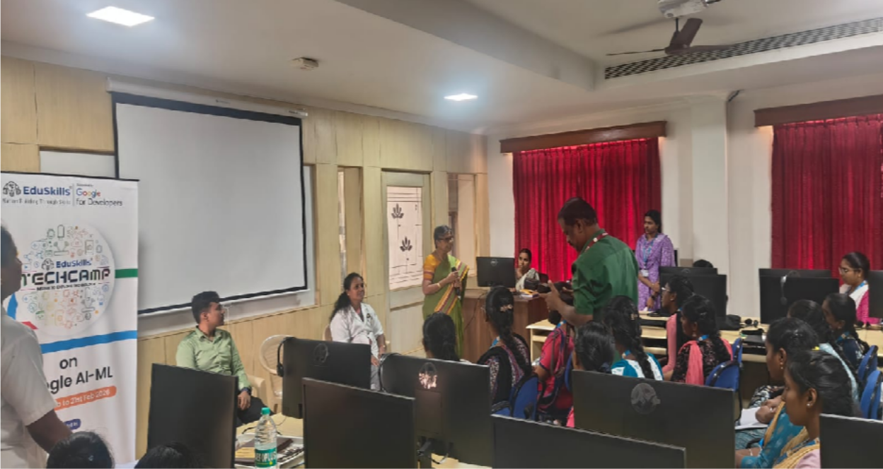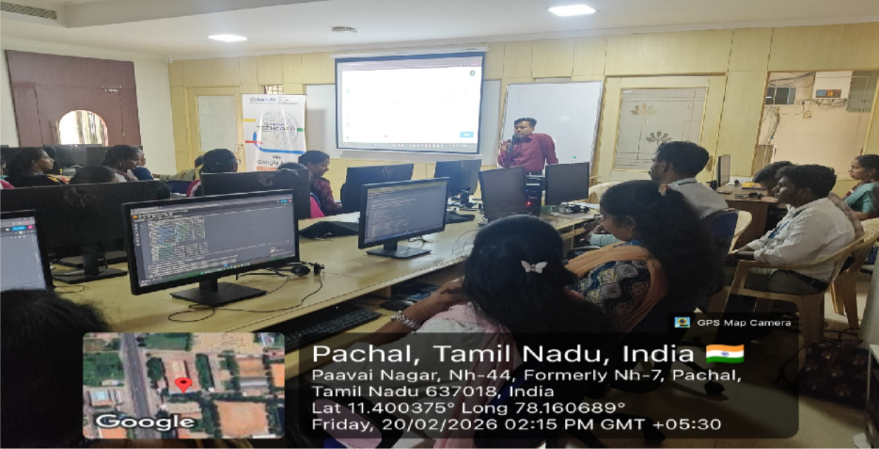 A Three Days Techcamp on “Google AI-ML” was successfully organized by the Department of Computer Science and Engineering, Paavai Engineering College, in association with EduSkills Academy COE and Paavai Innovation Forum, from 19th February 2026 to 21st February 2026. The primary objective of the workshop was to provide students with practical exposure to Artificial Intelligence (AI), Machine Learning (ML), and Computer Vision technologies using modern Google-based platforms.