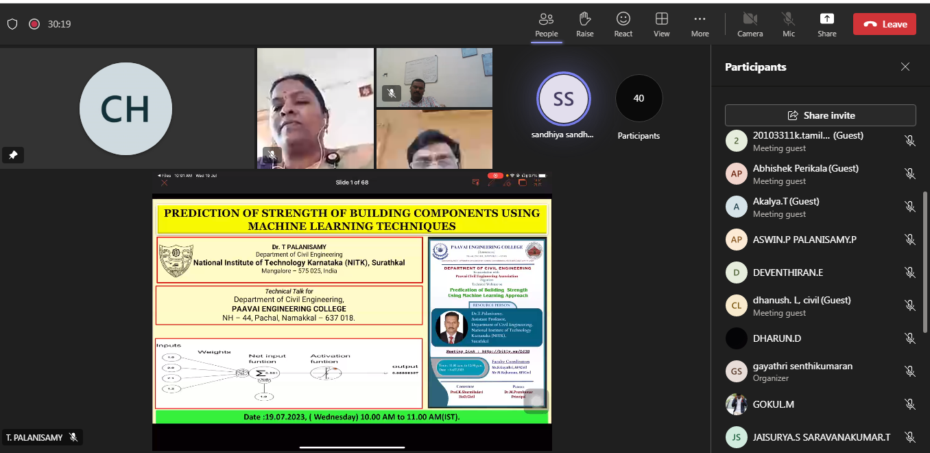 A one day Technical Webinar on the title “Predication of Building Strength using Machine Learning Approach” was organized by the Department of Civil Engineering in association with Paavai Civil Engineering Association, Paavai Engineering College (Autonomous) on 19.07.2023. Ms.K.Sandhiya, Third year student welcomed the gathering. Dr.M.Premkumar, Principal, Paavai Engineering College delivered his presidential address on this event, he elaborated about the application of Machine Learning and Artificial Neural Networks in Civil Engineering field.