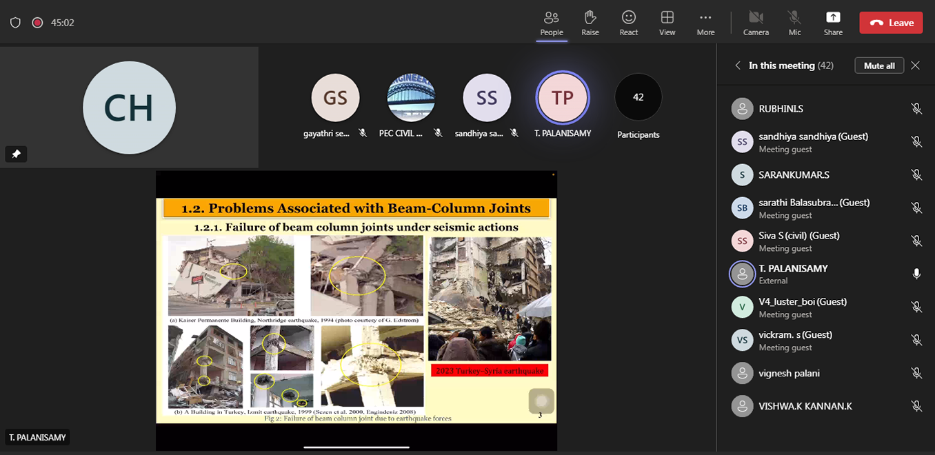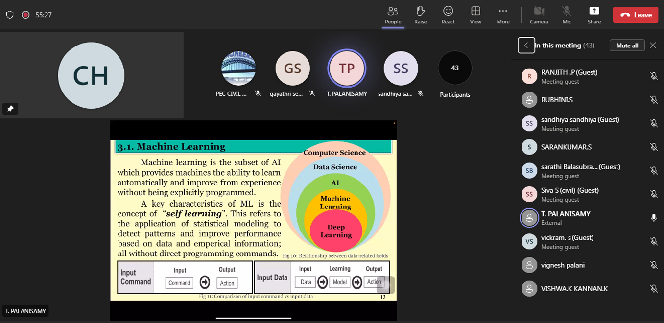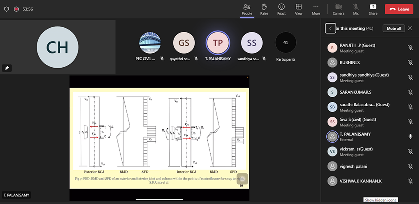 Mrs.K.Sharmiladevi, Head of the Department introduced the speaker and gave an overview about need of Machine Learning Approach. Dr.T.Palanisamy, Assistant Professor, Department of Civil Engineering, National Institute of Technology Karnataka (NITK), Surathkal was the resource speaker. He briefed about the problems in the Beam-Column joints, Machine Learning Techniques and development of model through Artificial Neural Network (ANN). At the end of this technical webinar, the students have gained knowledge about the Machine Learning tools, methodologies and ANN Algorithms involved in the prediction of strength in Beam-Column joint in a structure.
