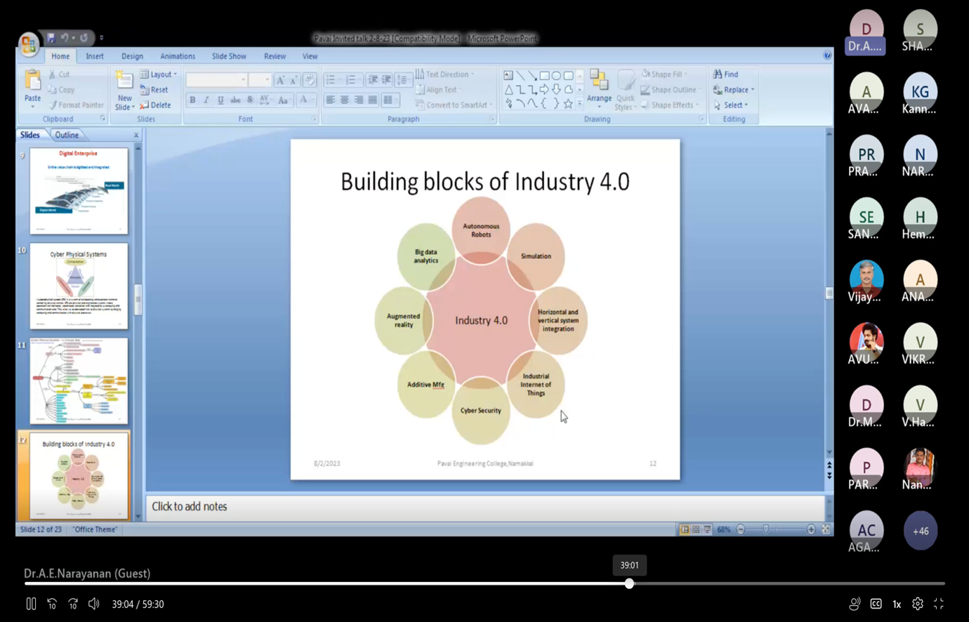 The objective of organizing the alumni guest lecture is to engage the students to cultivate and enrich their science education and to make them understand the needs that bridges the gap between academia and industries. In the session, the guest speaker explained the evolution of various courses, about STEM – a framework for teaching across various disciplines, University-Industry-Laboratory partnership. He illuminated the students with the building blocks and impacts of industrial revolution. He also elucidated the cyber physical systems and its importance. He highlighted the top ten skills that are relevant to the industry, emerging technologies, and convergence themes. He finally clarified the queries posted by the faculty and the students.