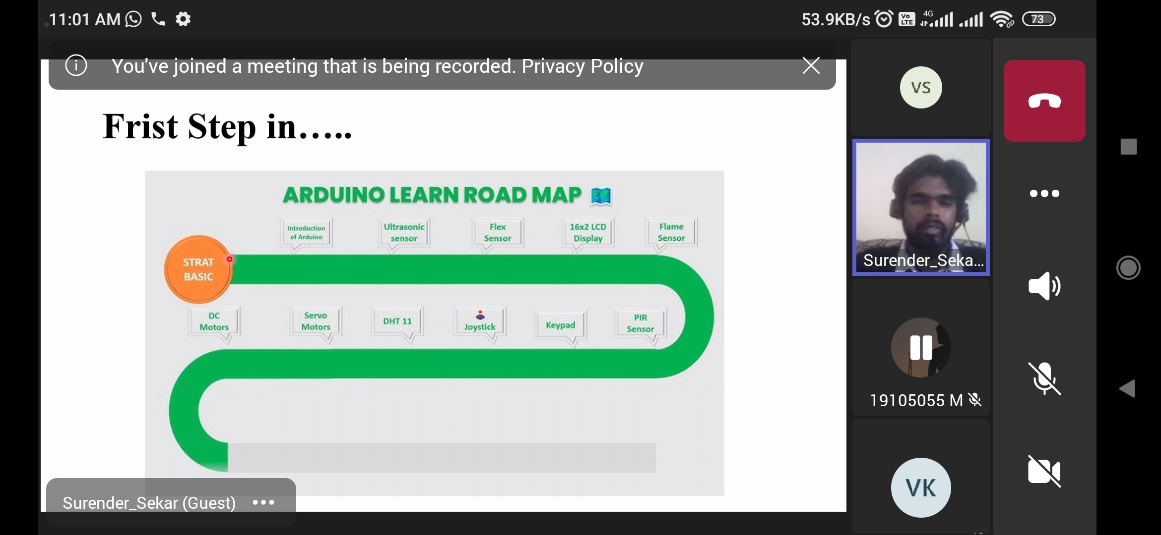 In his address, he briefed about the importance and role of an electronics engineer in the automotive industry. He started the seminar with the topic – The golden cycle (Why, How, What) and explained about Software Development Life Cycle. He discussed the concepts of the automotive industry from steam vehicles to electrical vehicles, ECU and their types. He also explained the Arduino roadmap and its challenges. The students were able to acquaint themselves with the various applications of the automotive industry. Around 95 members participated in the online seminar. Queries were posted and it was clarified by the resource speaker.