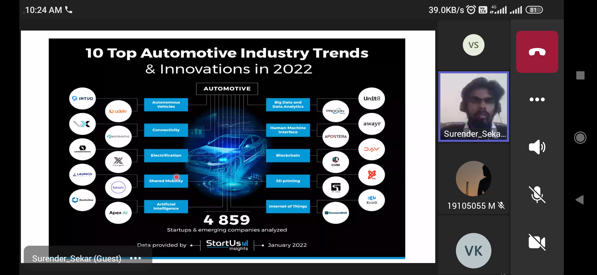 The Department of Electronics and Communication Engineering in association with the Institution of Electronics and Telecommunication Engineers of India, (IETE) – Erode Local Centre, organised an online seminar titled “Recent Trends In Automotive and Embedded Systems” on 06.09.2022. It was aimed at disseminating knowledge to students about the role of electronics engineers in the automotive and embedded system industries. The welcome address was given by Dharani B, Third year, Department of ECE, Mr.S.Surender, System validation engineer (Automotive embedded), Visteon Technical and Service Center, Chennai was the resource speaker. Ms.N.Shanmathi, from third year ECE introduced the resource speaker.