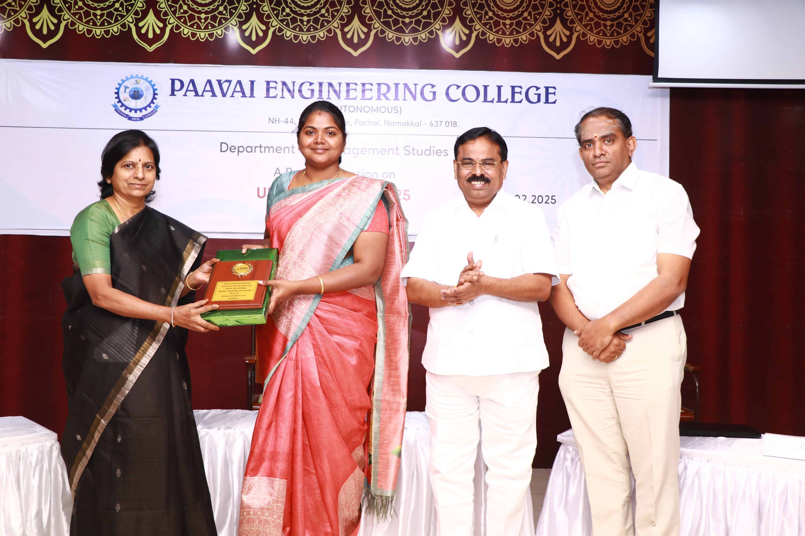 Shri CA. N. V. Natarajan, Chairman of Paavai Educational Institutions, and Smt. Mangai Natarajan, Correspondent of Paavai Educational Institutions, presided over the function. Dr. M. Premkumar, Principal, along with the Dean of Academics, Director-MBA, and faculty members from various departments, graced the occasion.